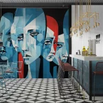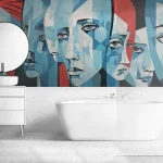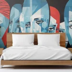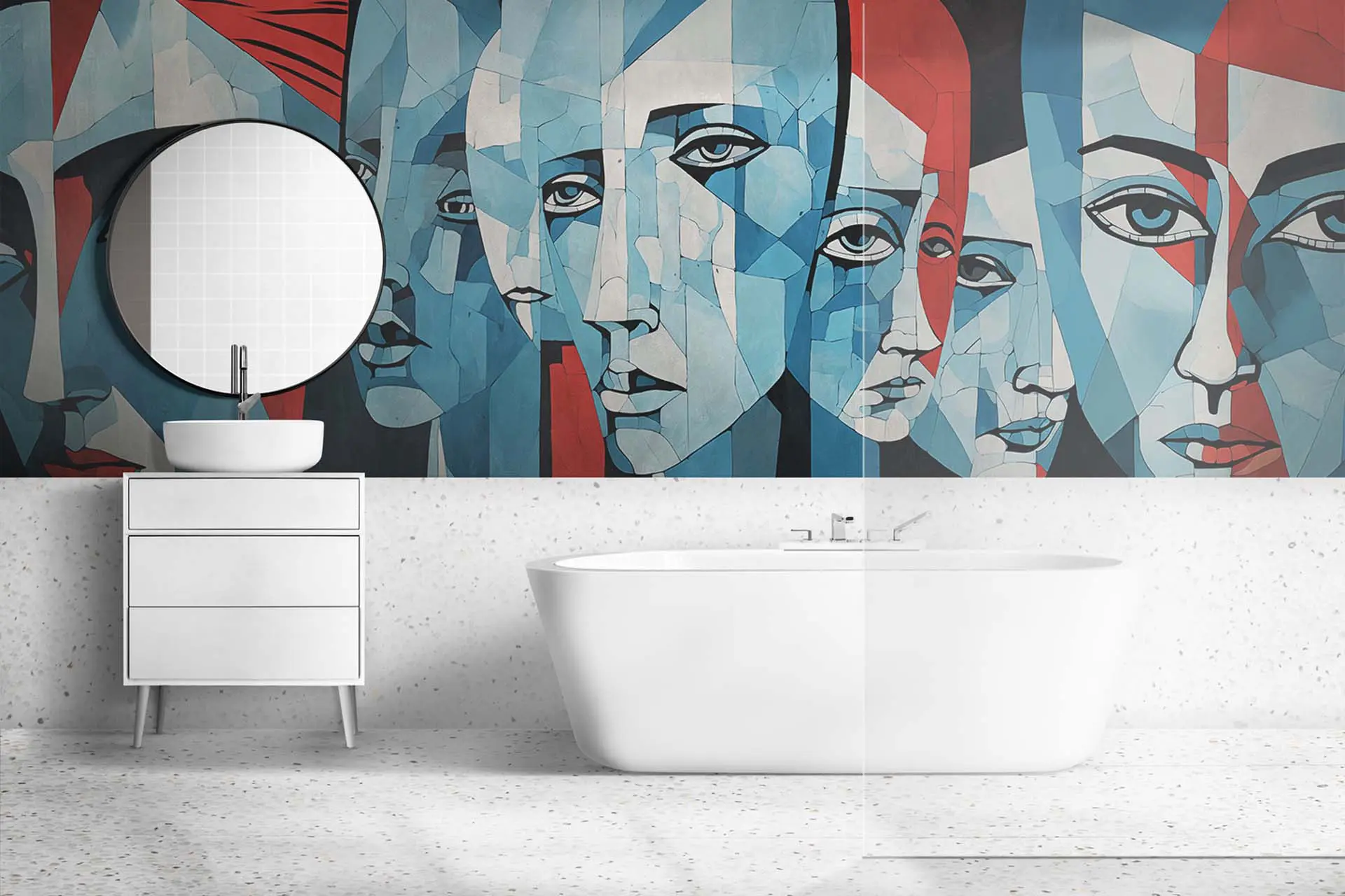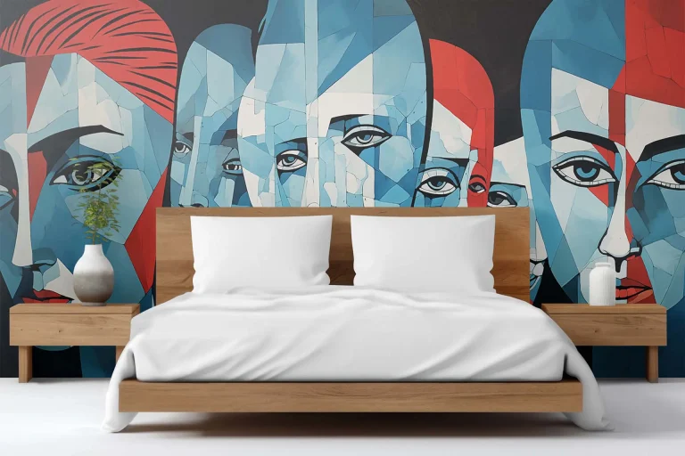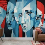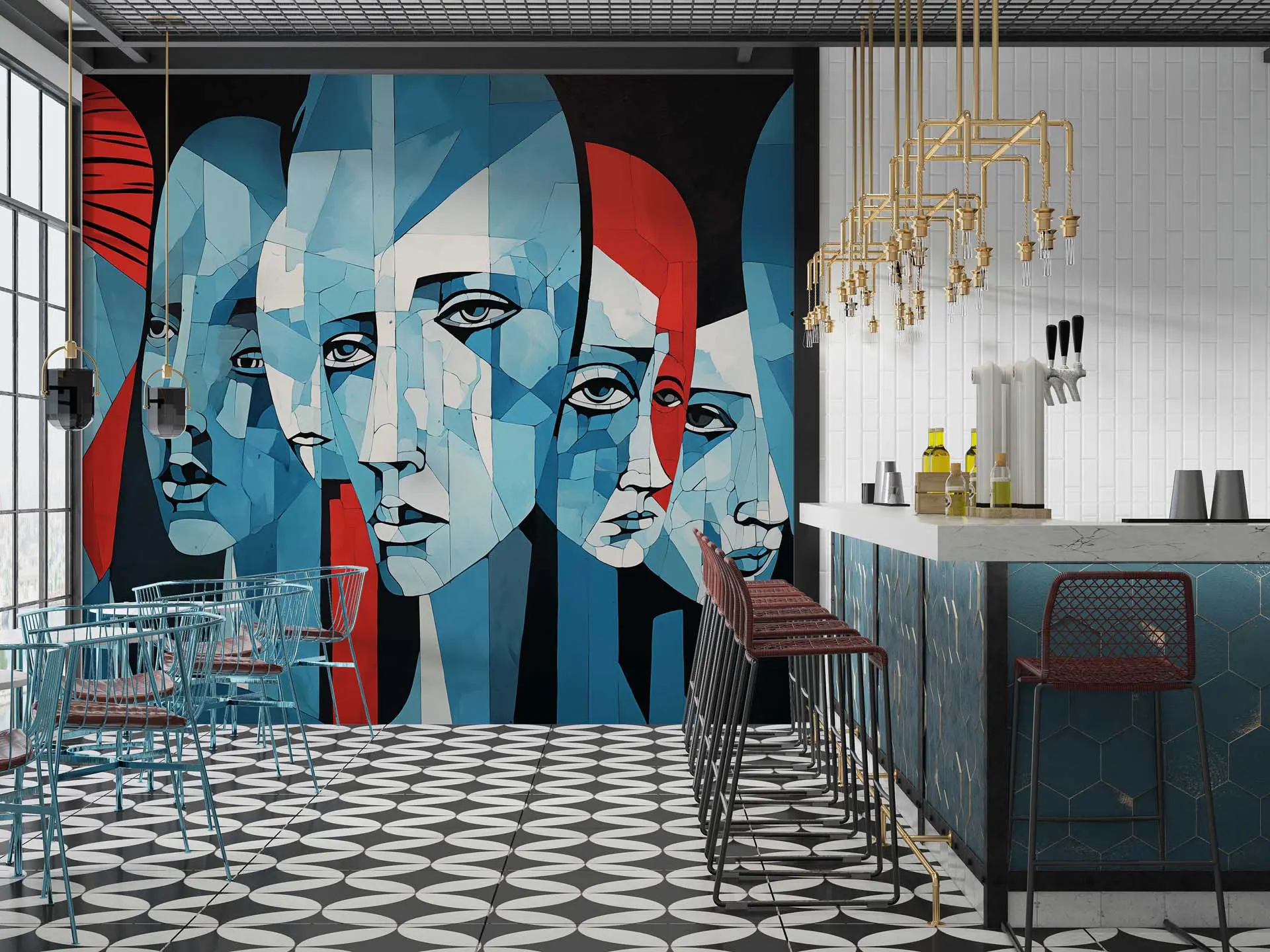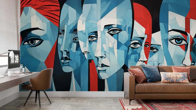 Abstract Blue and Red Faces Artistic Wallpaper – Bold and Modern Wall Art Design for Living Room or Office