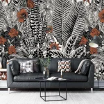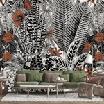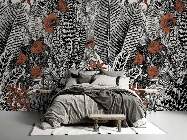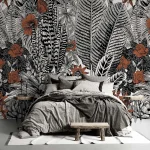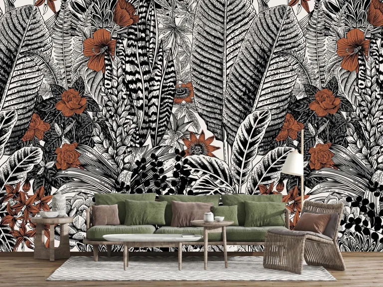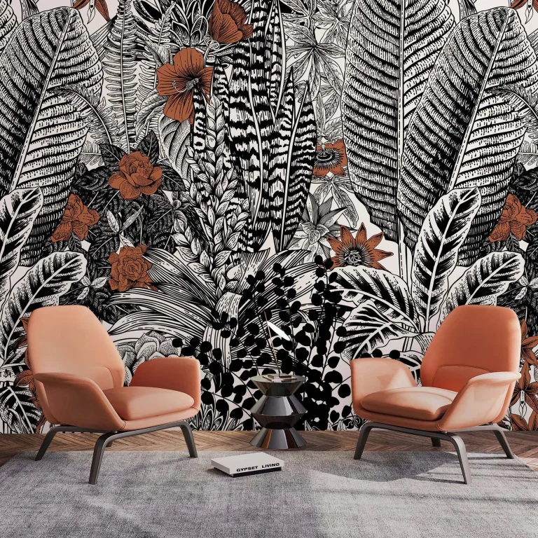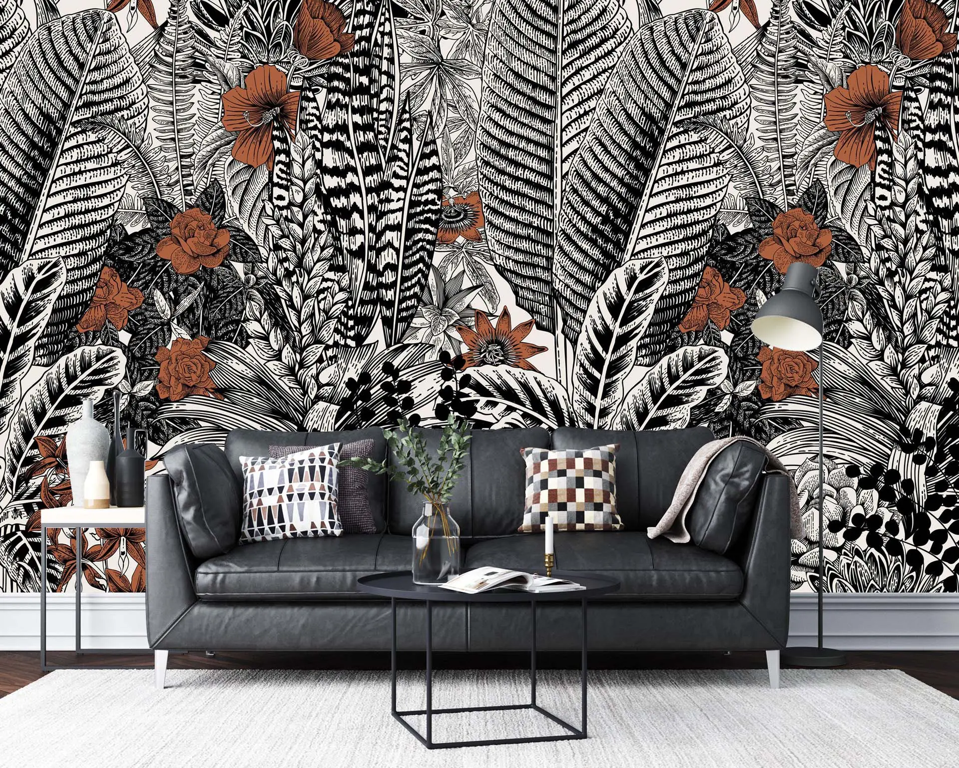 Artistic Black & White Tropical Leaves with Brown Flowers Wallpaper – Stylish and Modern Decor