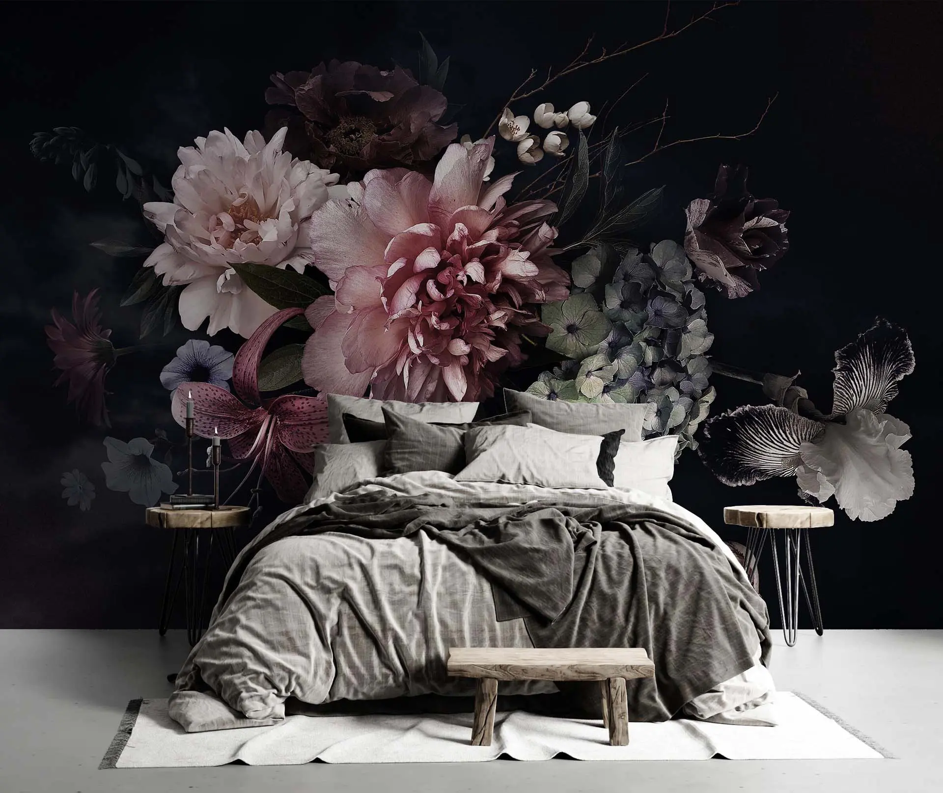 Artistic Floral Varieties on Dark Background Wallpaper – Bouquet Tableau for Elegant and Sophisticated Spaces