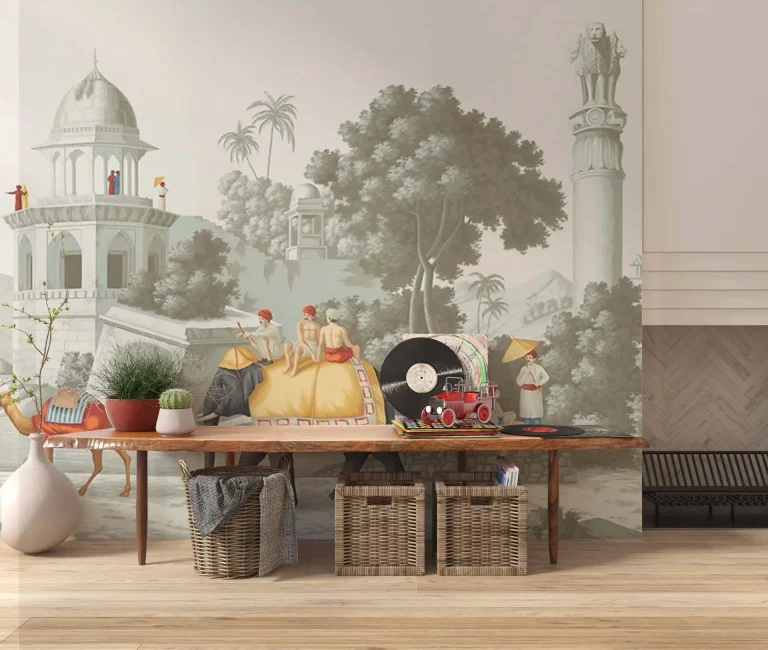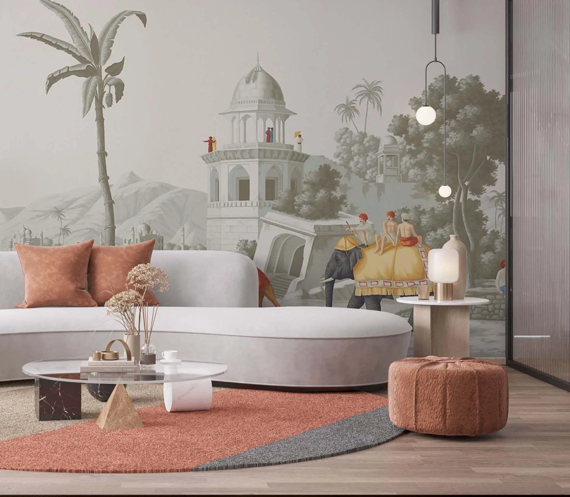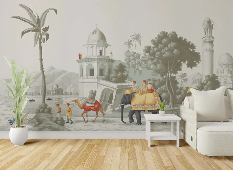 Artistic Historical Indian City Line Drawing Wallpaper with Colorful Camel, Elephant, & People