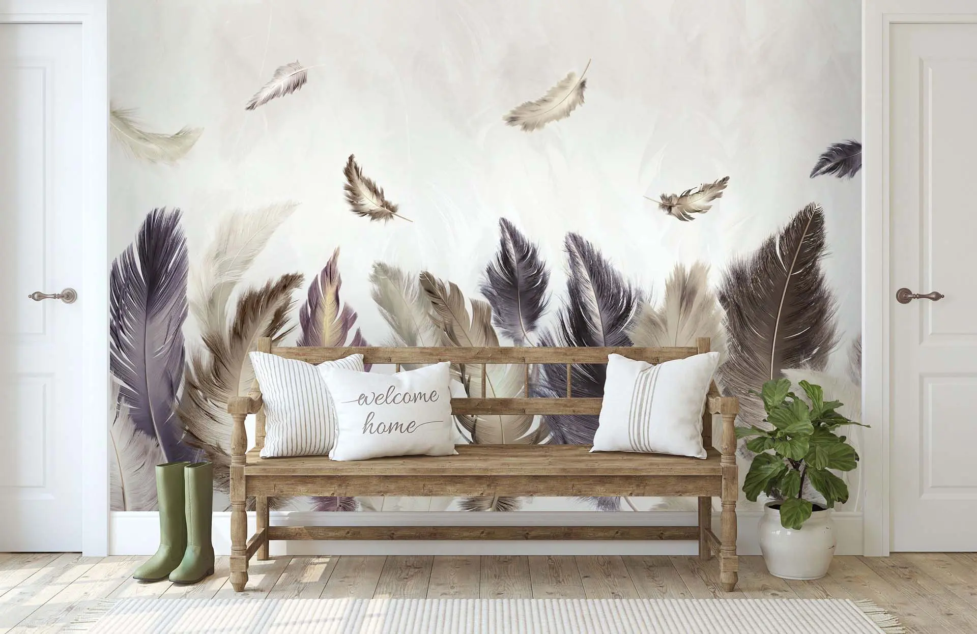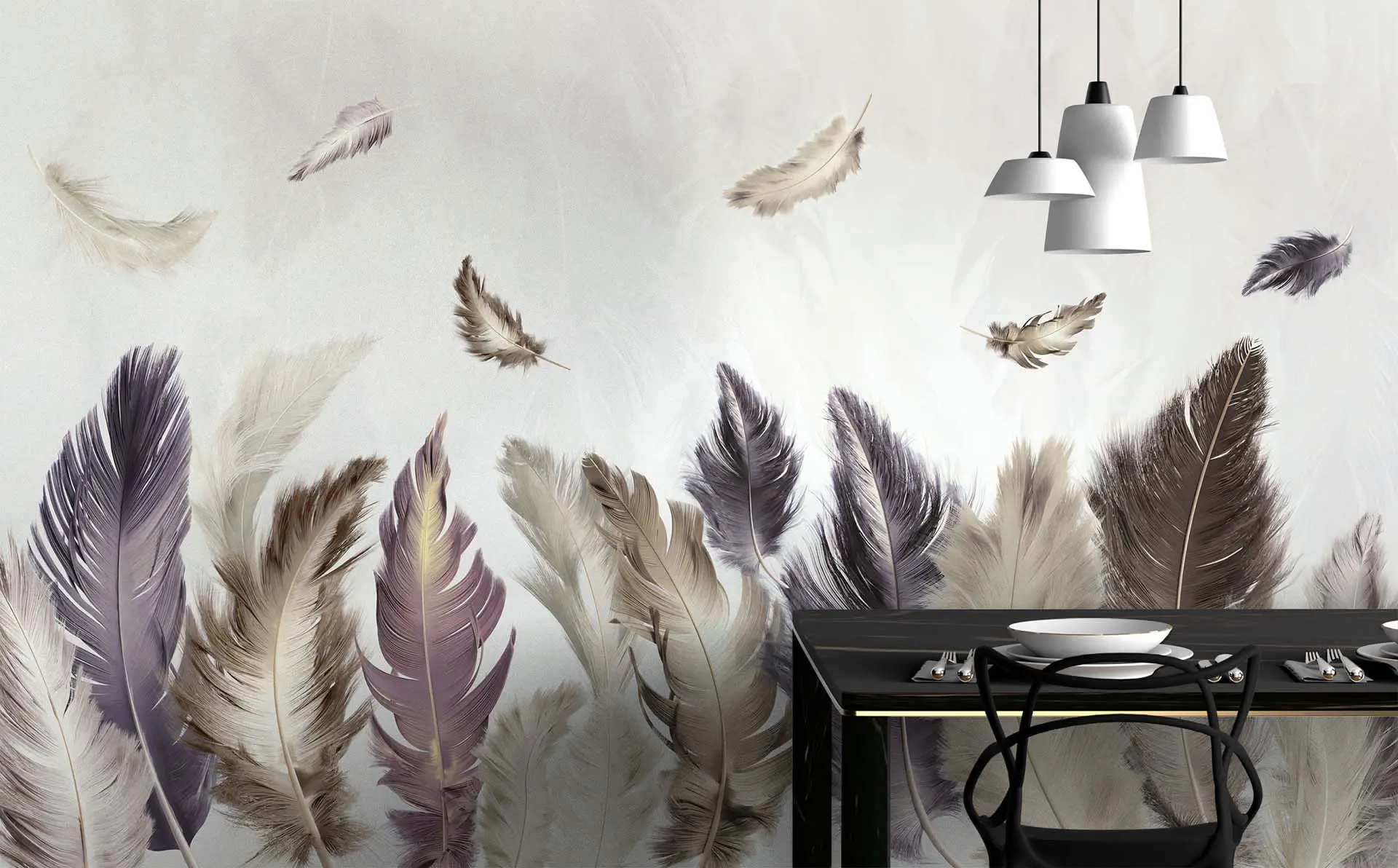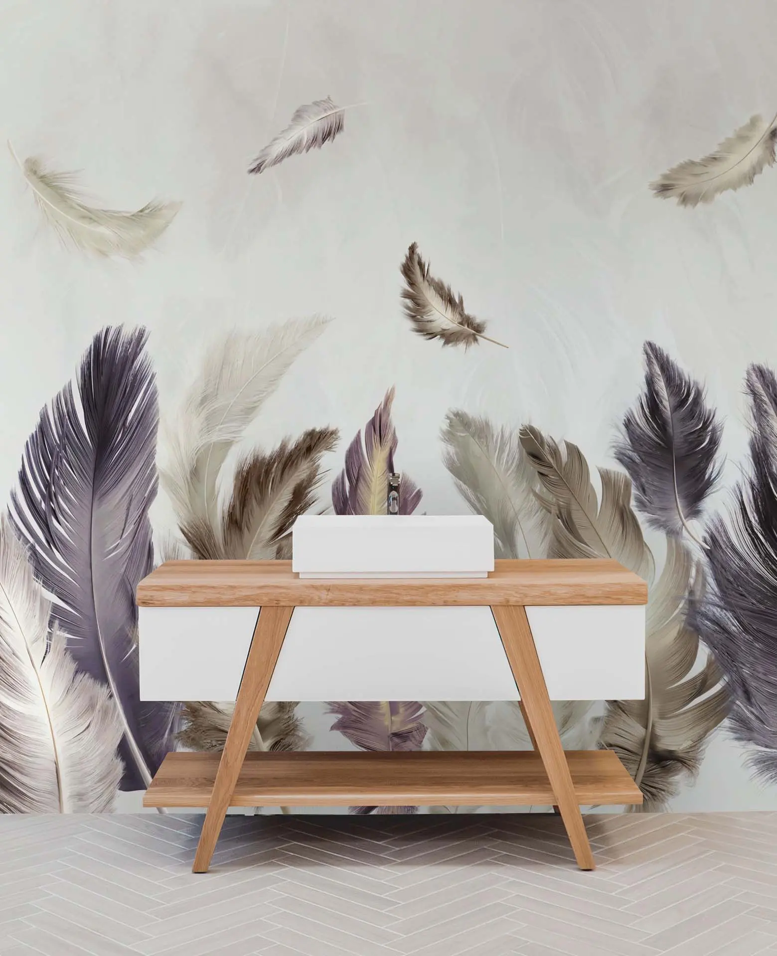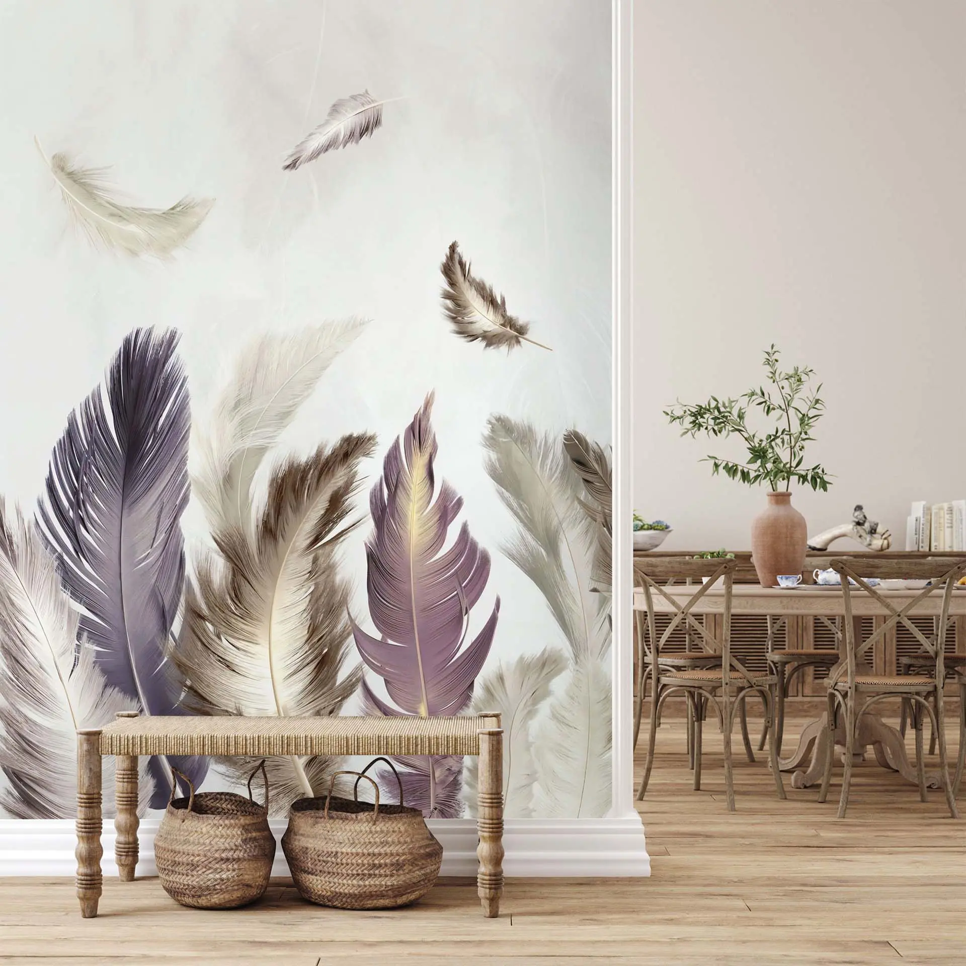 Artistic Pastel Feather Wallpaper – Purple, White, Brown Large Bird Feathers on White Background for Modern Decor