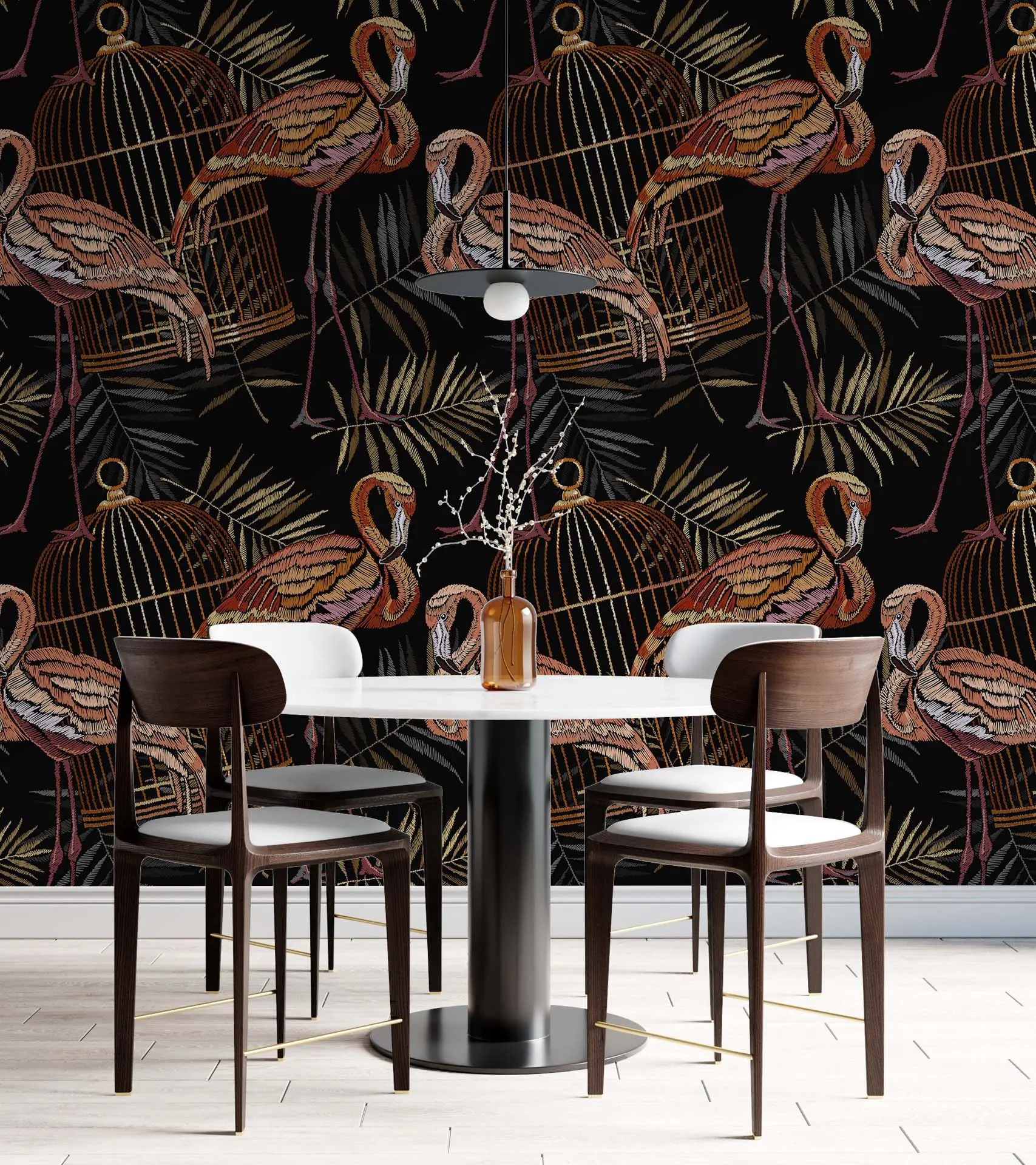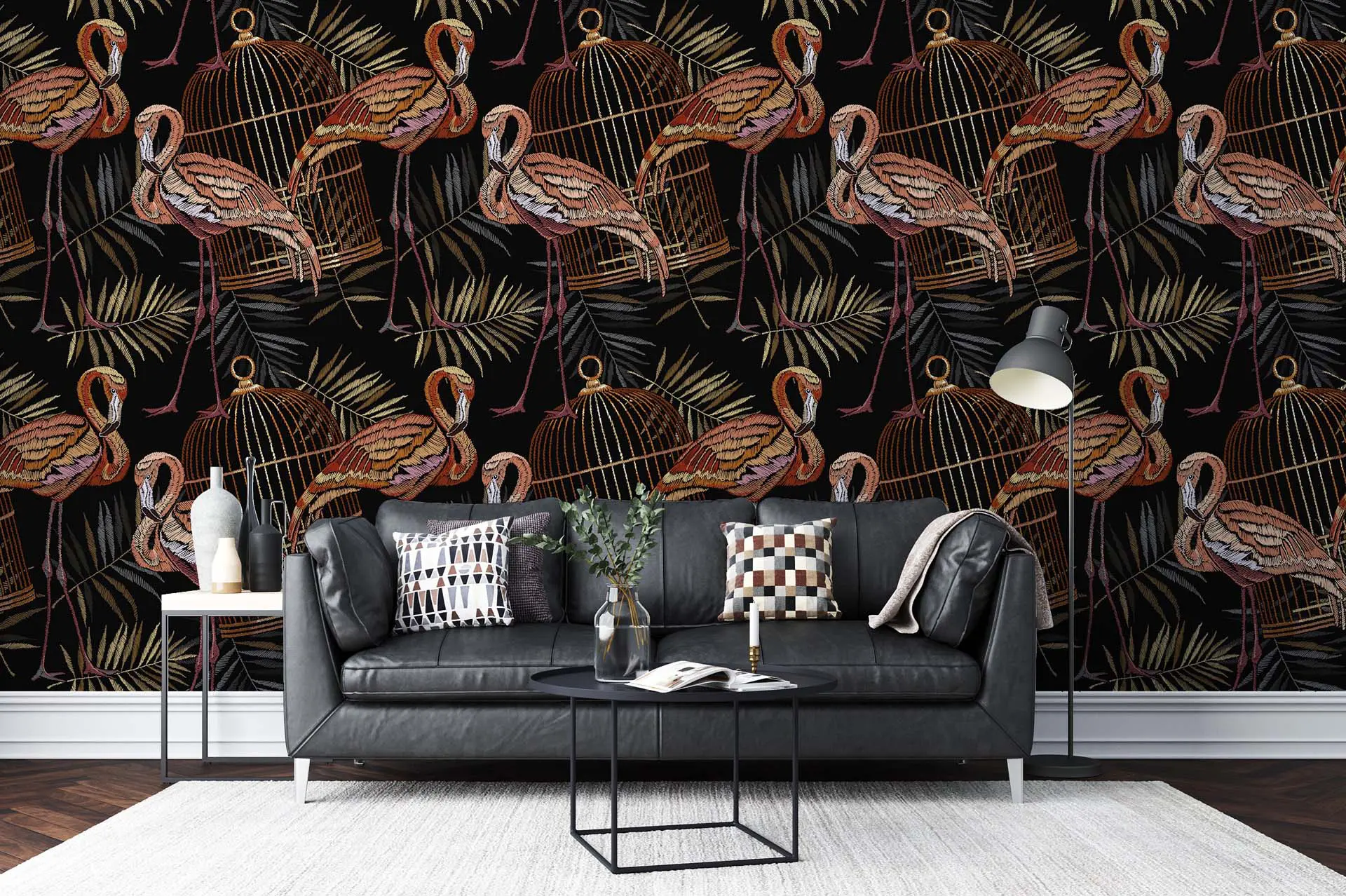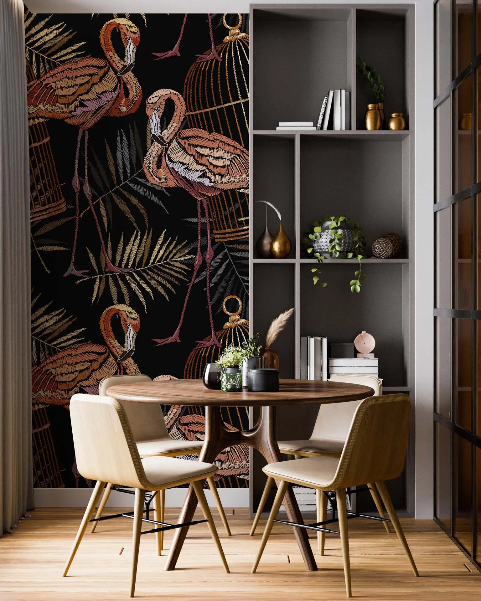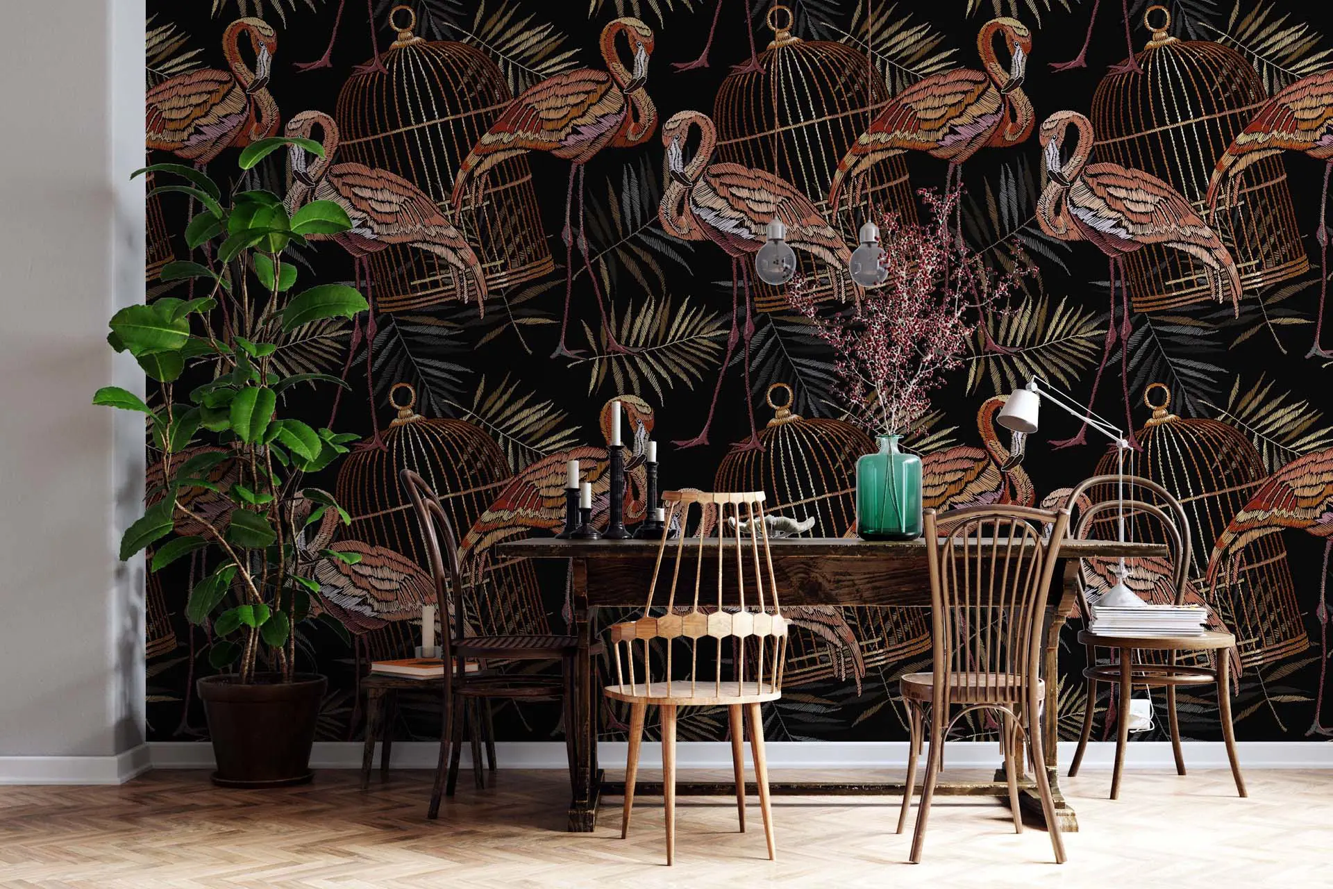 Artistic Tropical Flamingo & Dry Palm Wallpaper – Dark Themed Exotic Bird Decor for Stylish Rooms