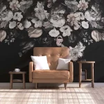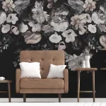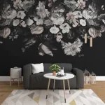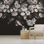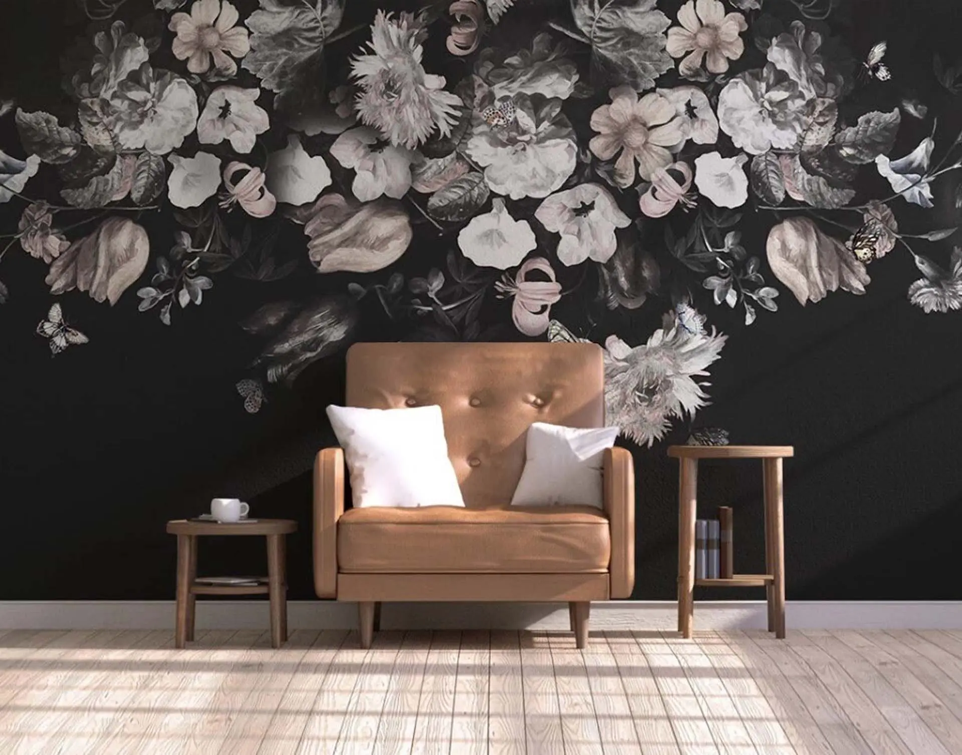 Artistic Vintage Wallpaper with Hanging Flowers on Black – Pastel Tones for Elegant Spaces