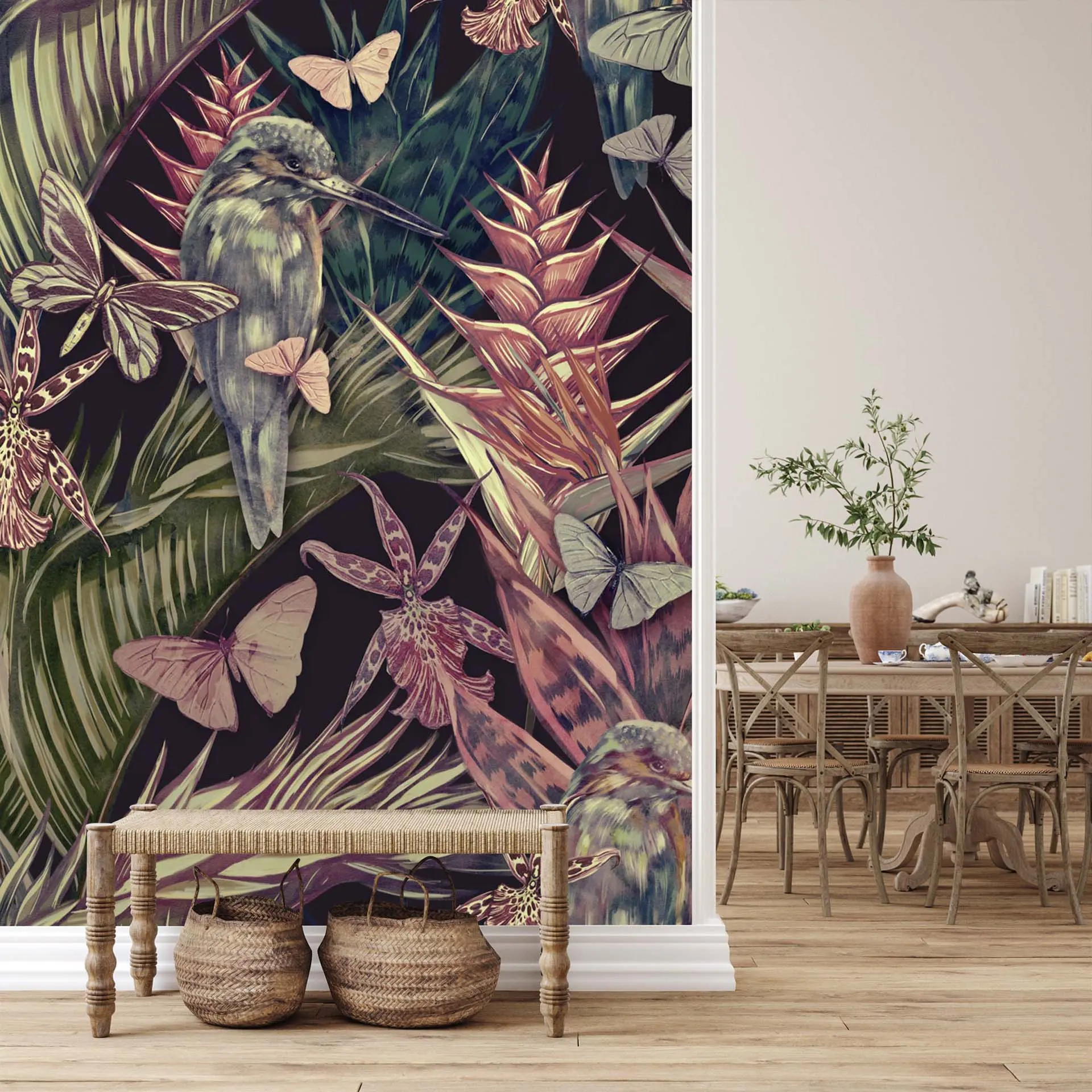 Artistic Wallpaper with Birds, Butterflies, Green and Pink Leaves on Black Background – Botanical Beauty