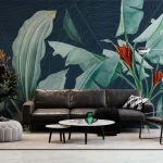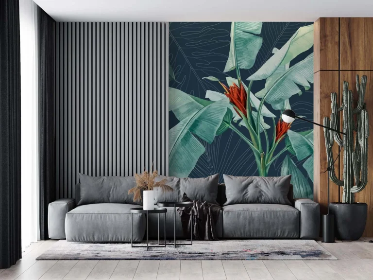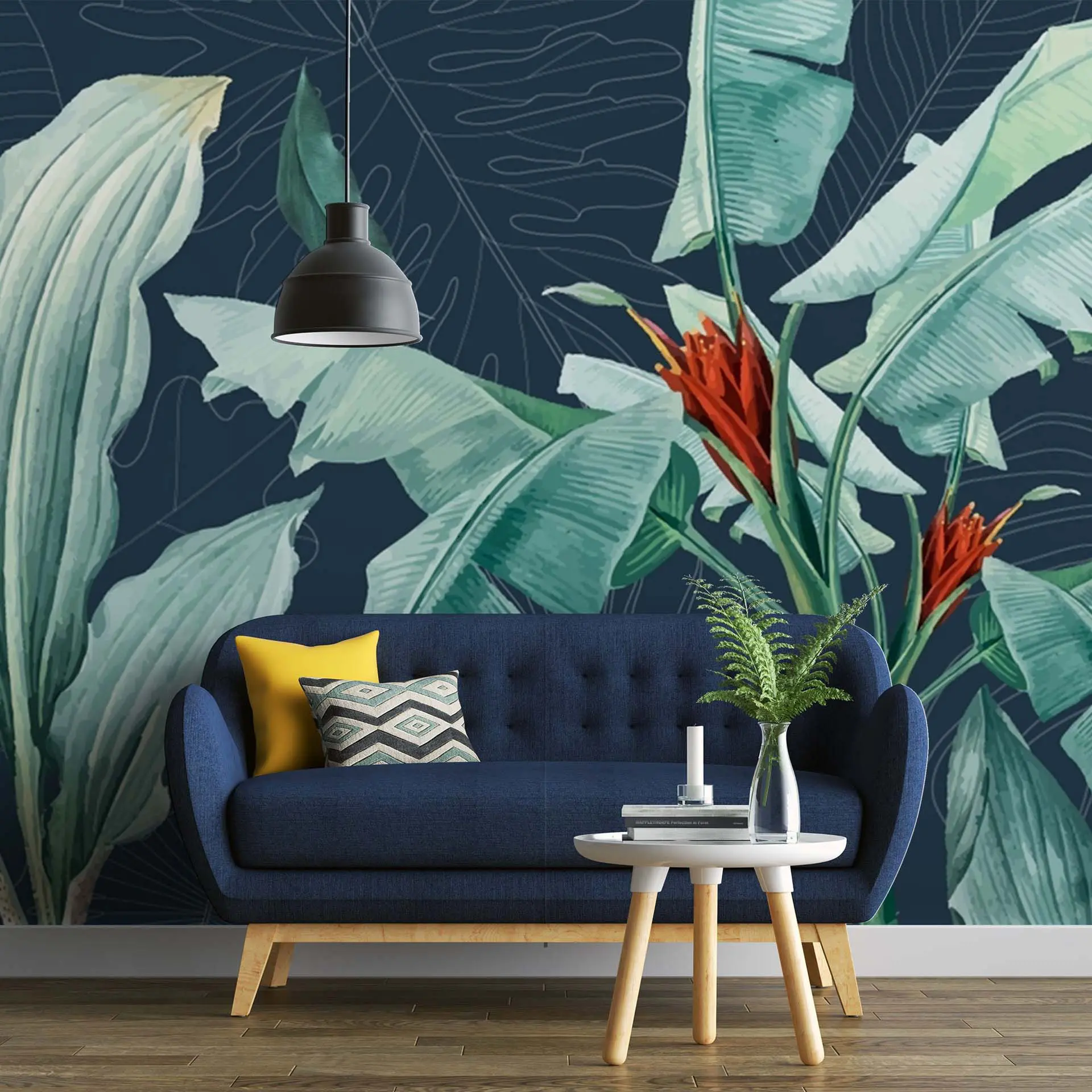 Artistic Wallpaper with Navy Background, Large Green Tropical Leaves & Red Flowers