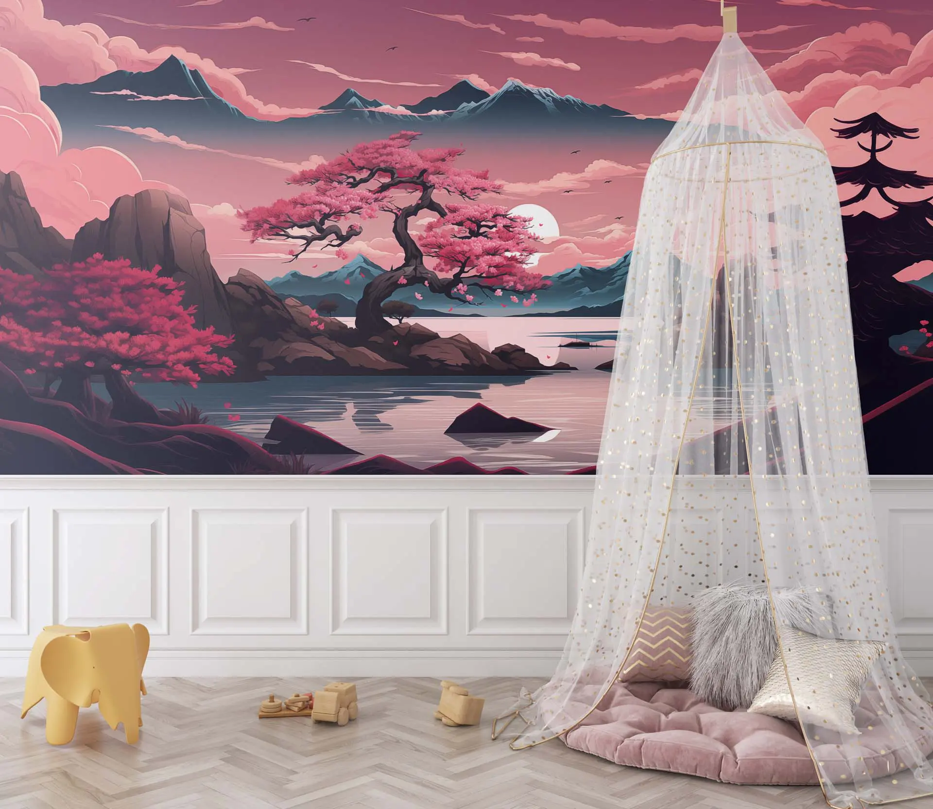 Beautiful Sunset with Pink Trees and Mountains Wallpaper – Dreamy Nature Wall Design for Bedrooms or Living Rooms
