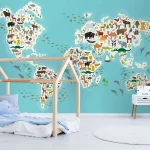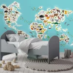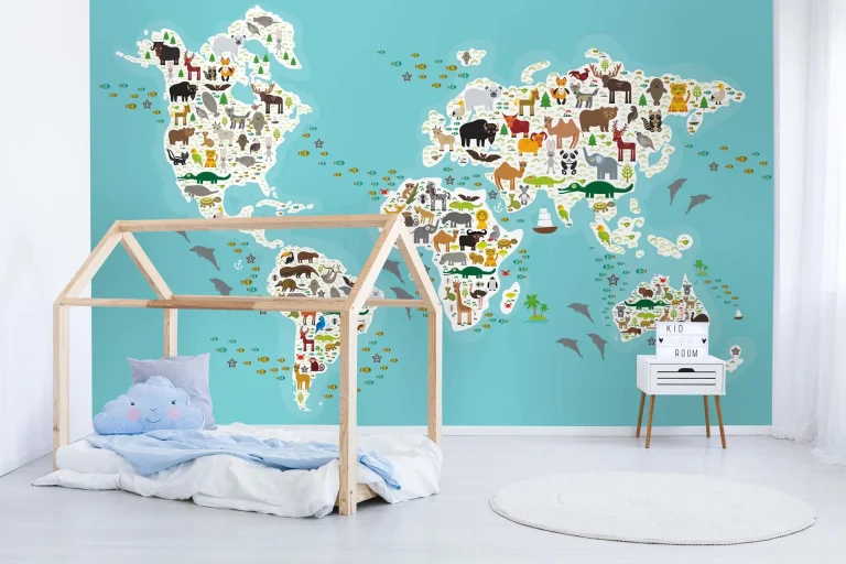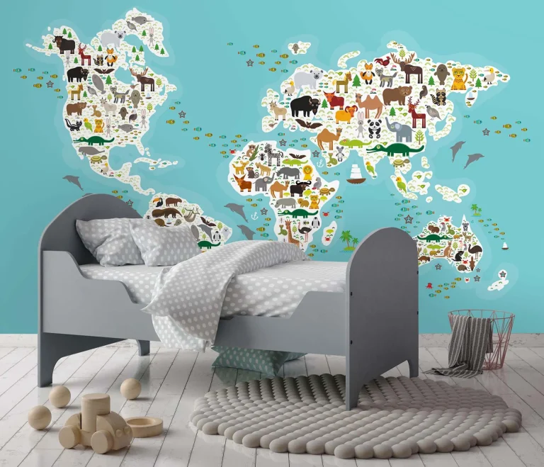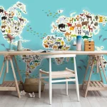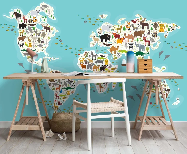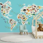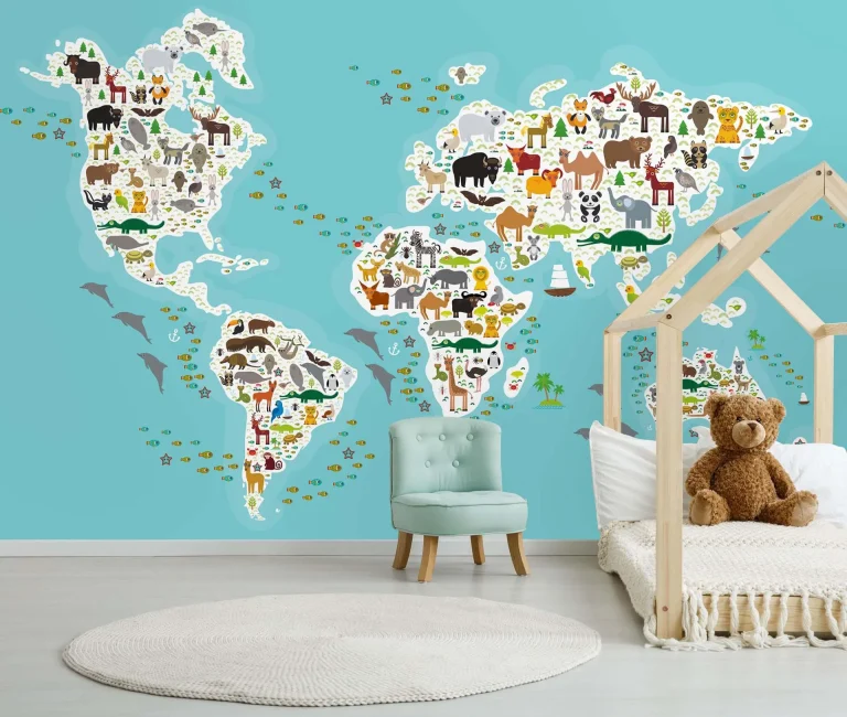 Cartoon Animal Atlas World Map on Blue Background – Vivid Colors for Children’s Room & Nursery