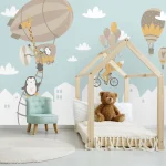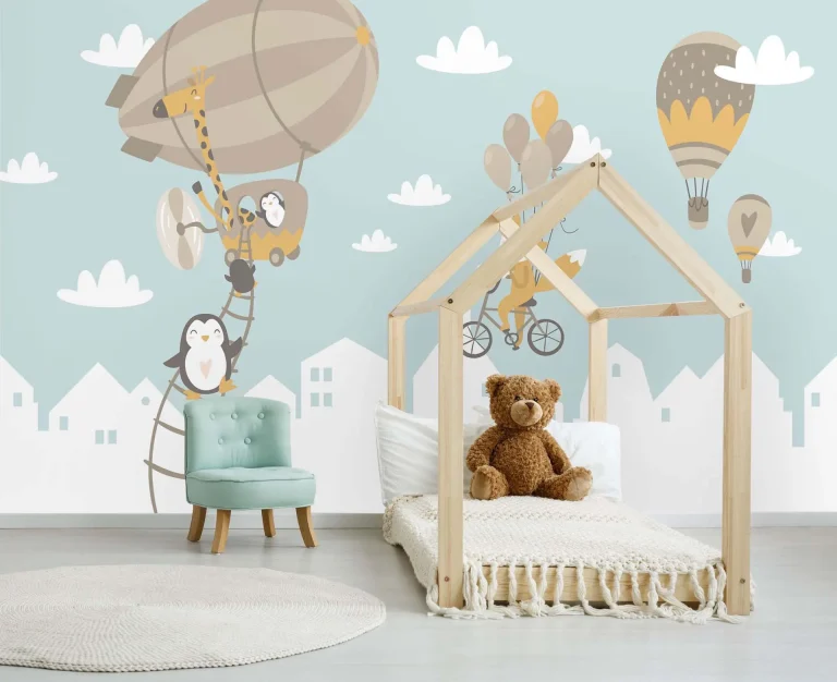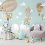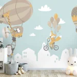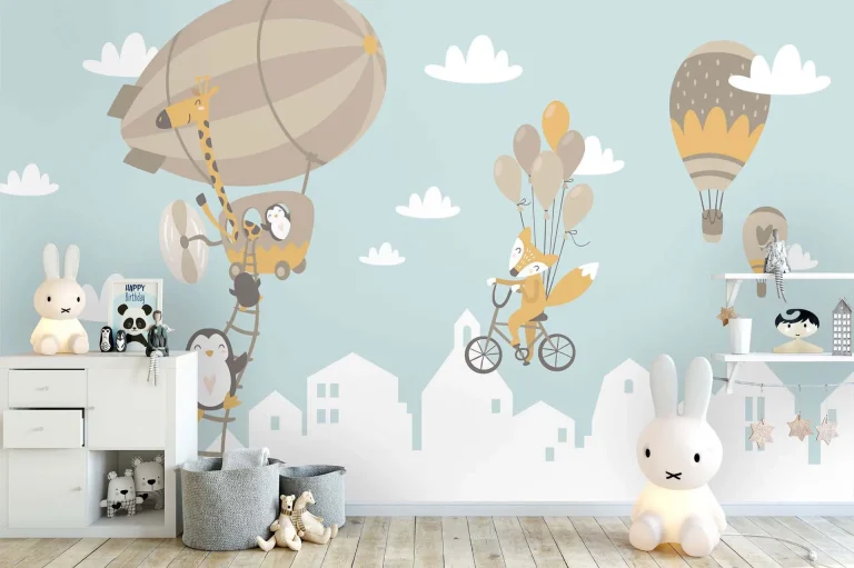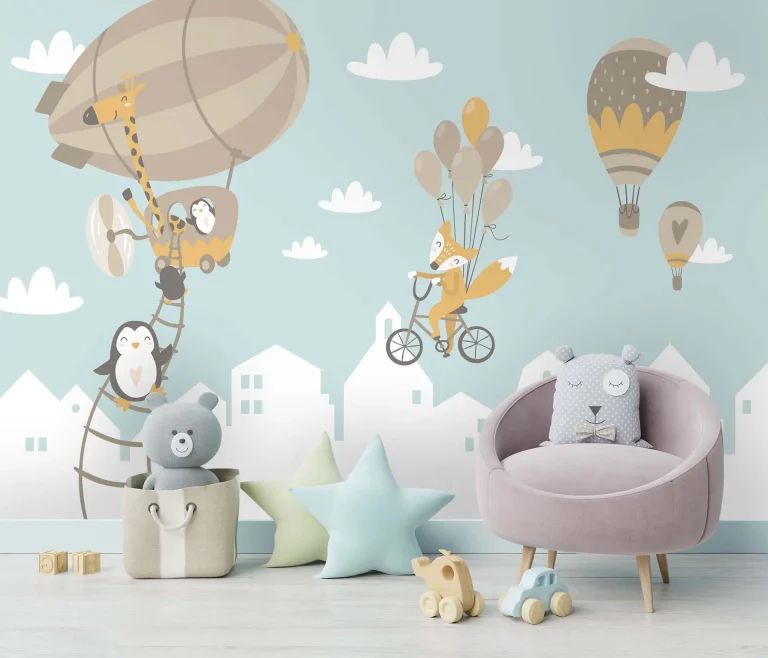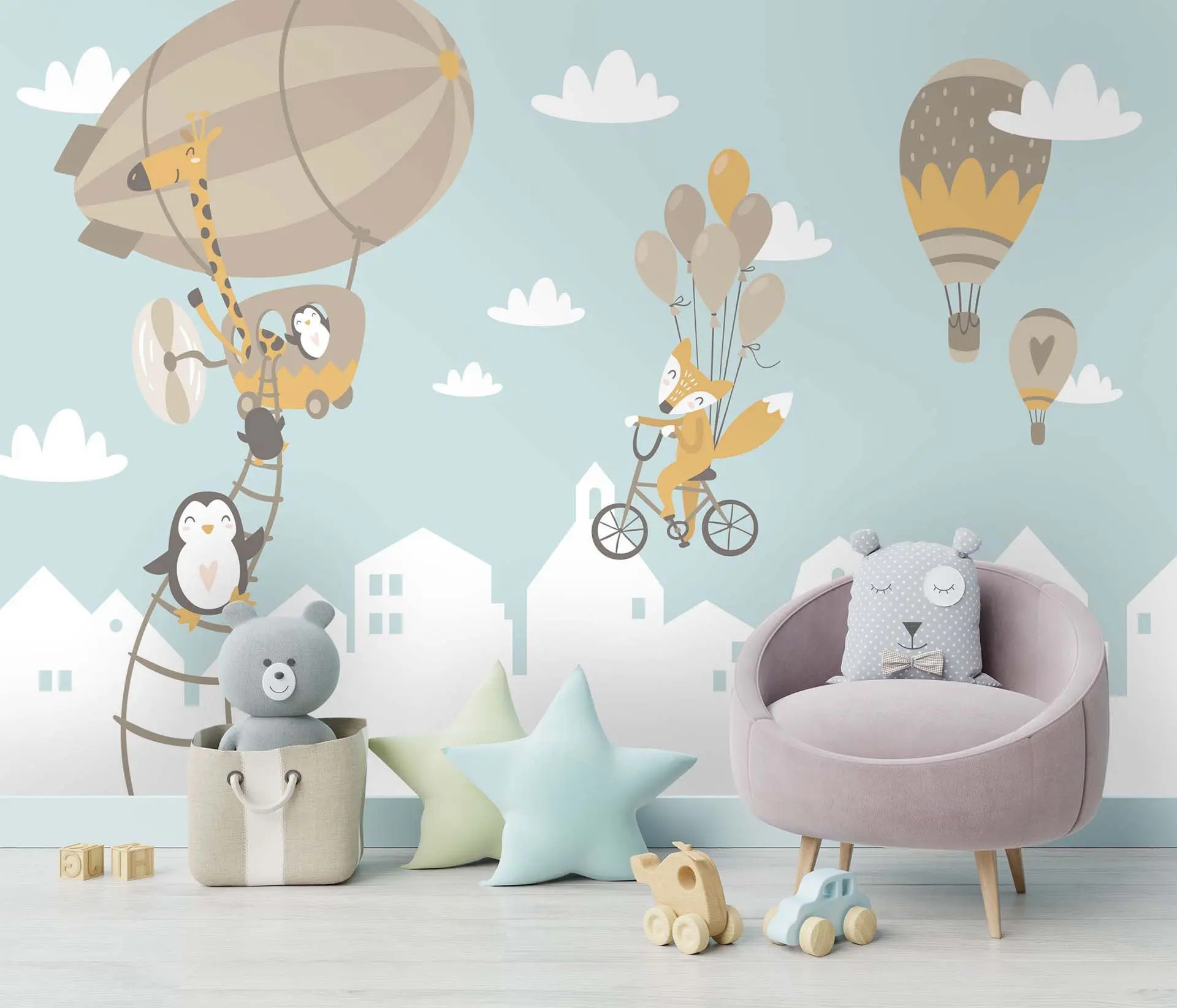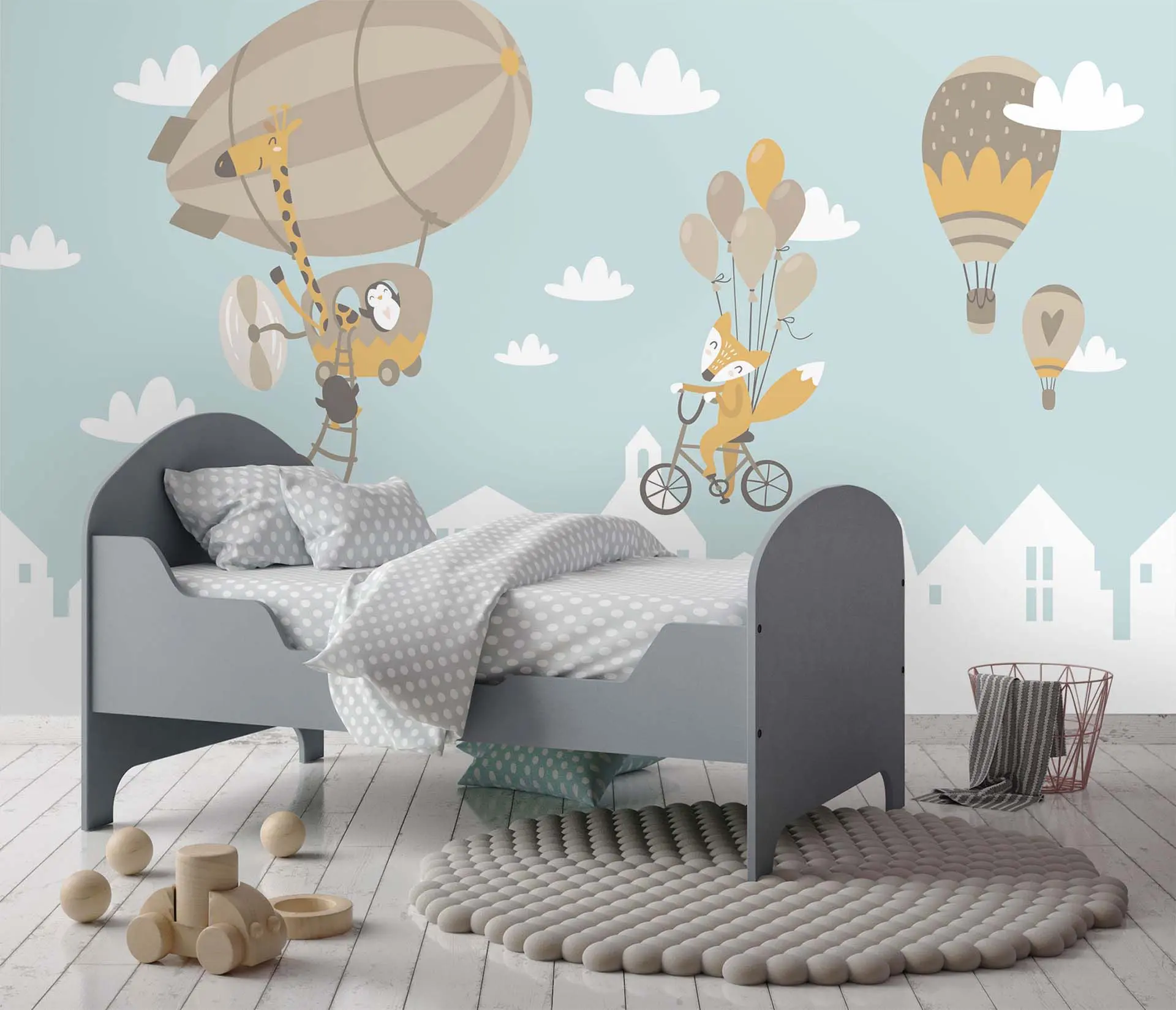 Cartoon Animals Flying with Zeppelins & Balloons Over City Wallpaper for Kids Room & Nursery