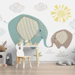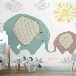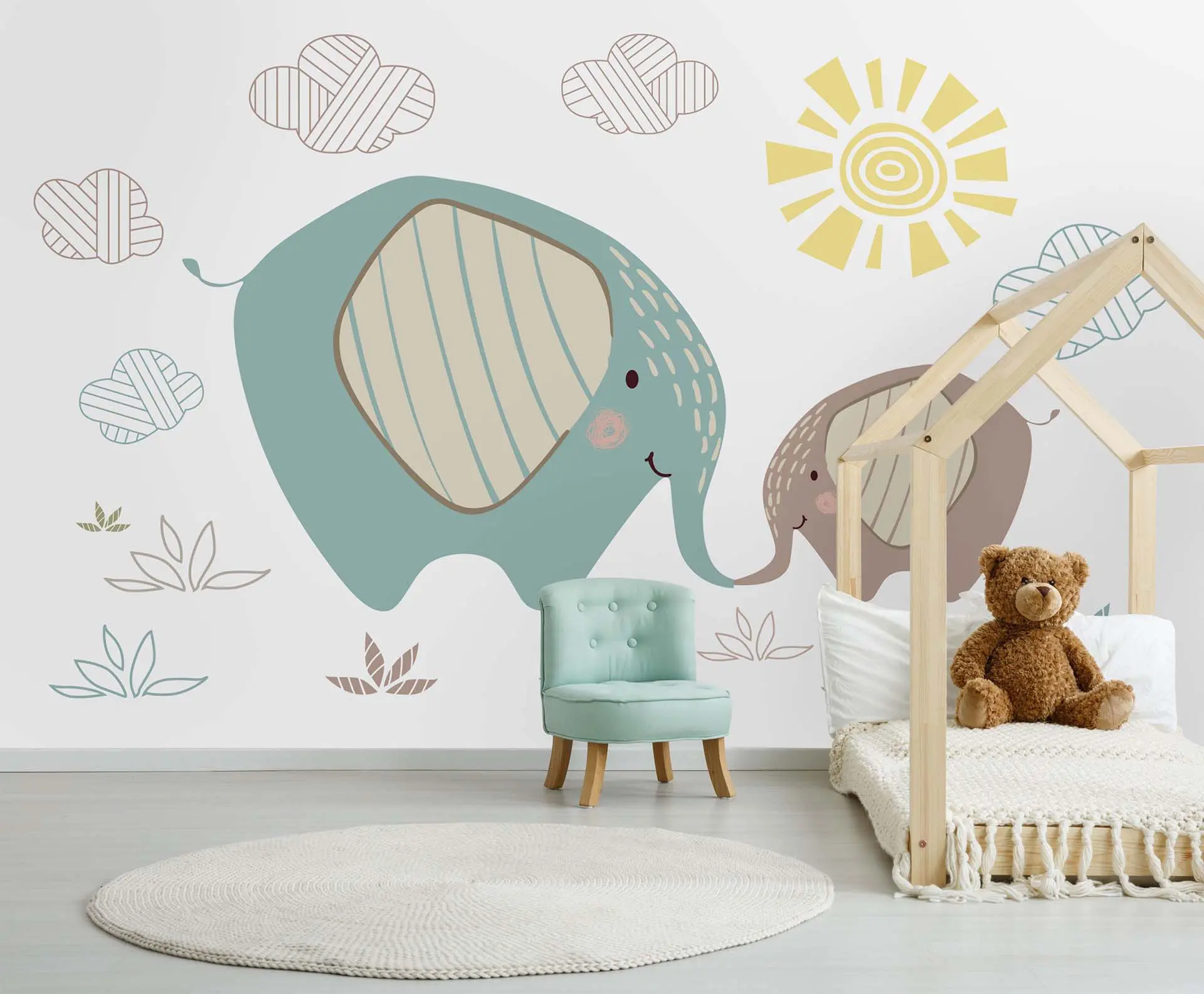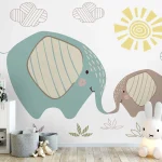 Cartoon Cute Elephant & Calf with Striped Clouds & Sun – Pastel Colors on White Background for Nursery