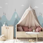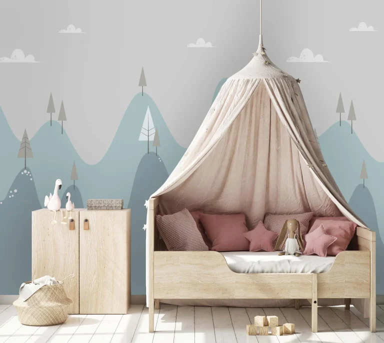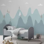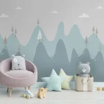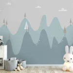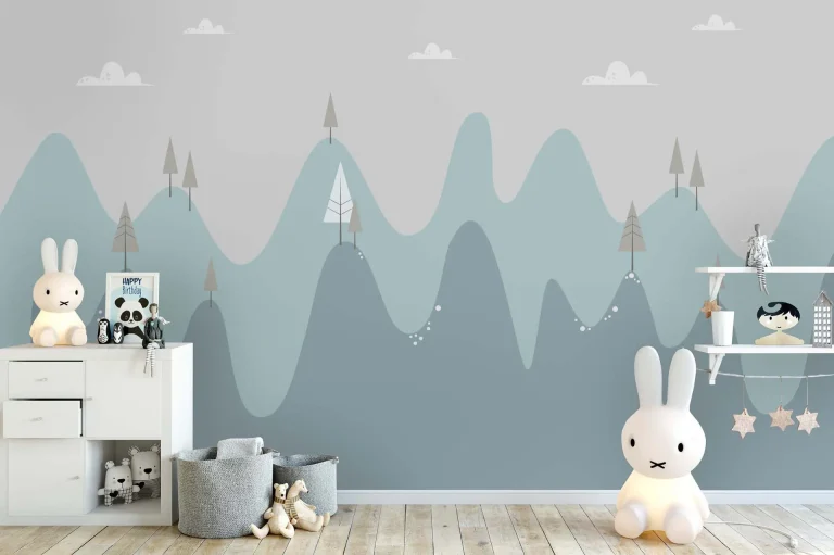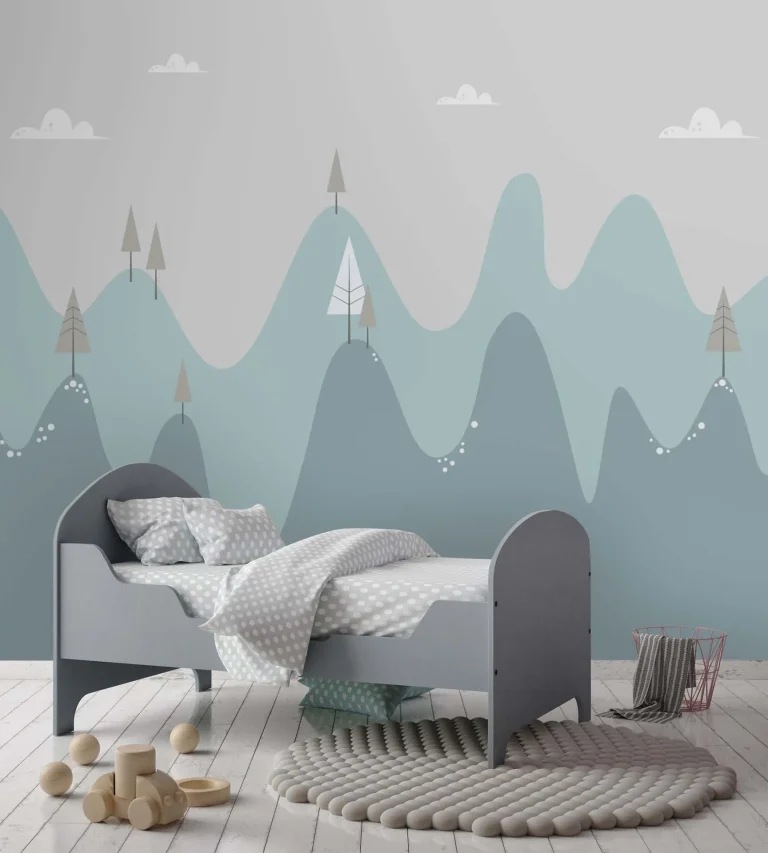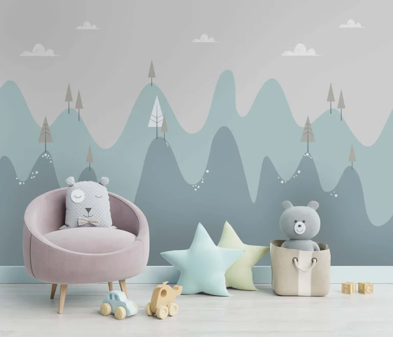 Cartoon Green & Blue Mountains with Grey Sky & White Clouds Wallpaper – Peaceful Decor for Baby & Kids Room