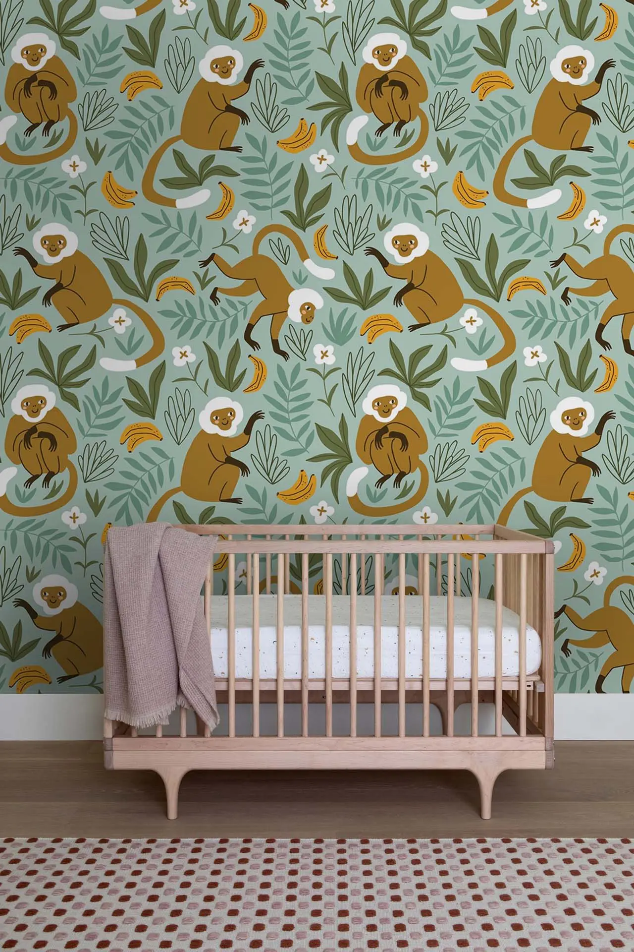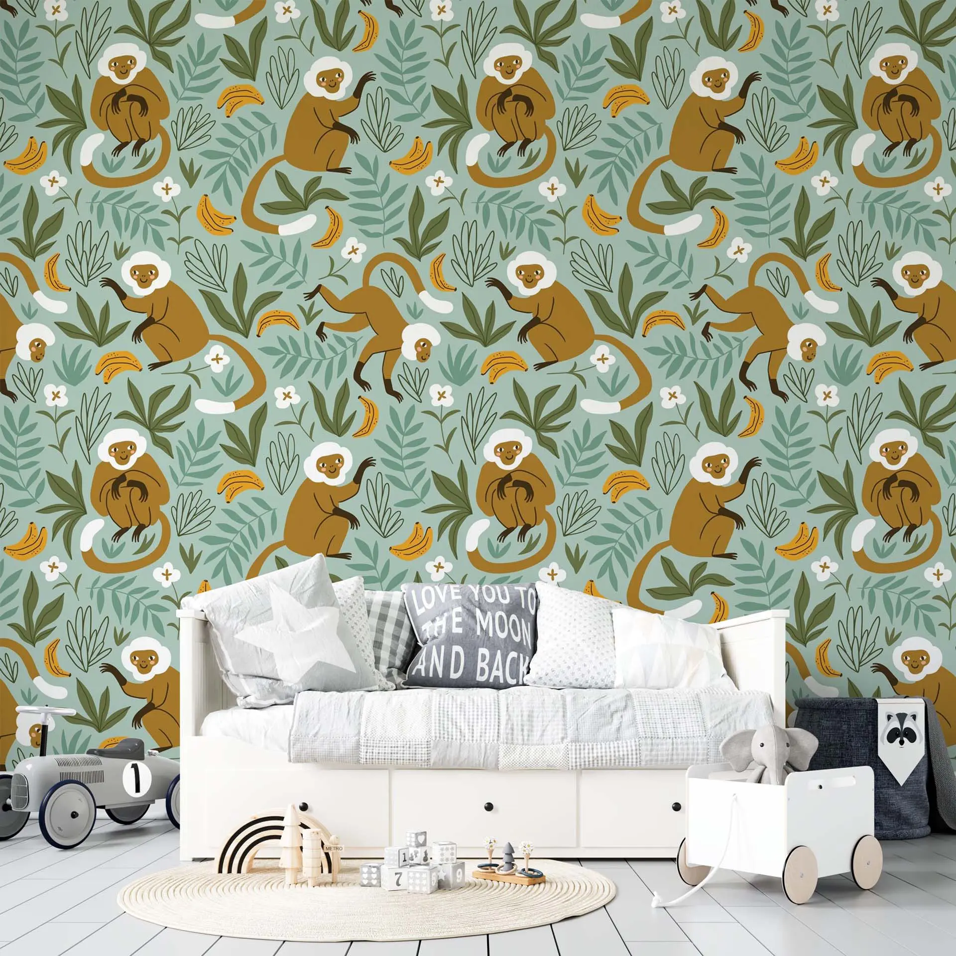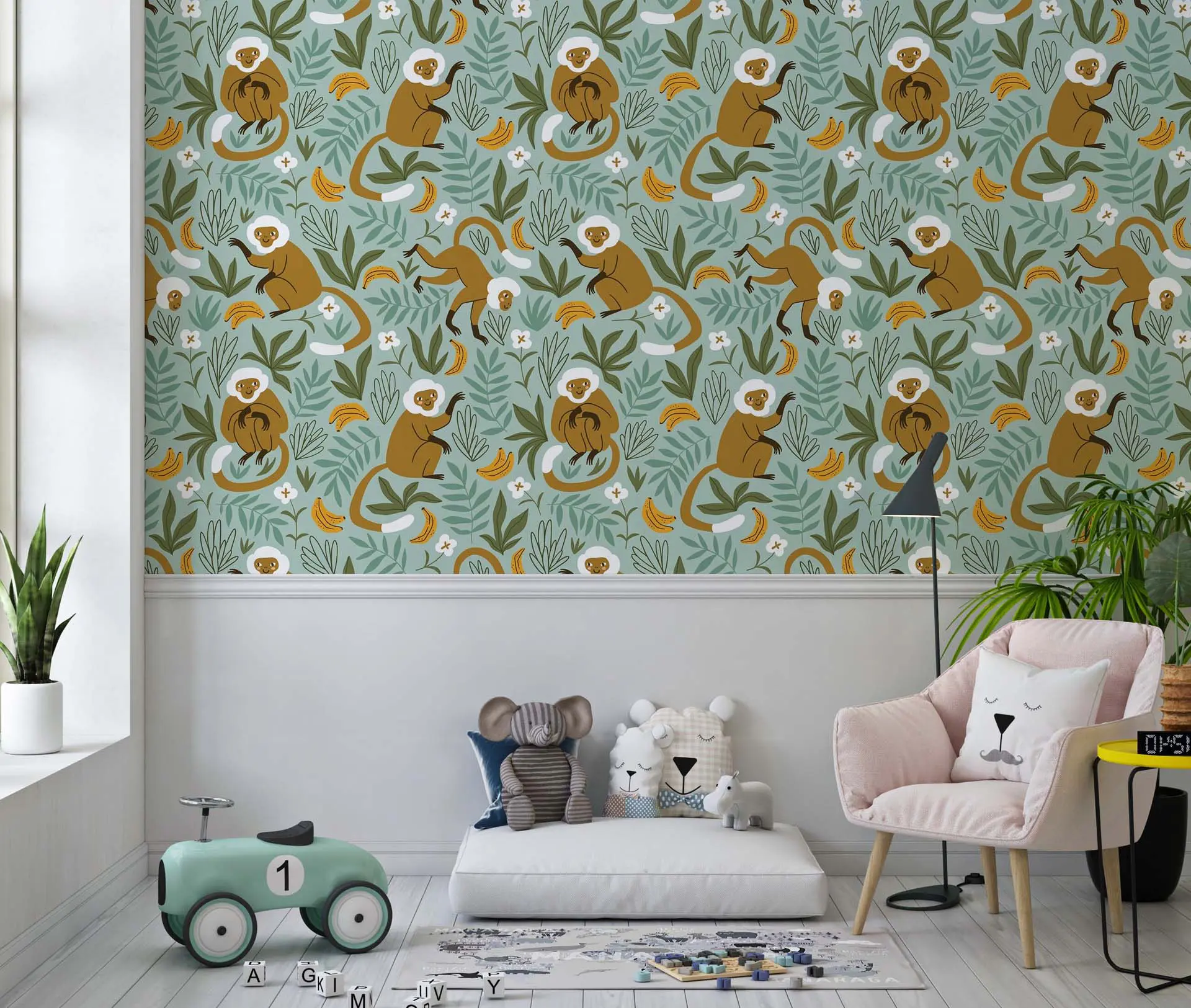 Cartoon Monkey with Bananas & Flowers Wallpaper – Green Background in Pastel Colors for Nursery