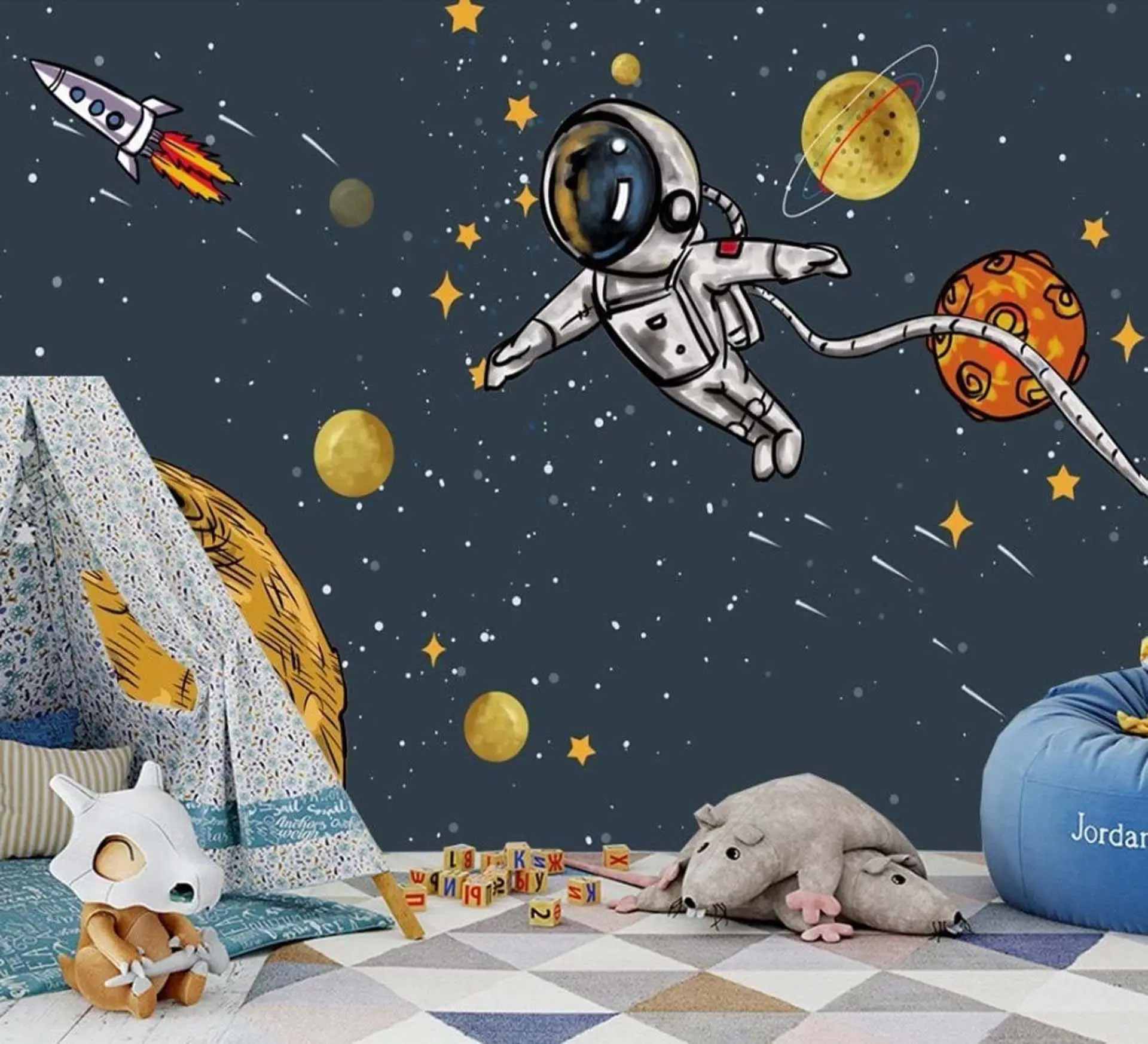 Cartoon Navy Background with Planets, Rocket, Space, Astronaut, Stars Wallpaper for Children’s Room & Nursery