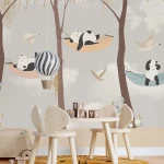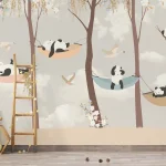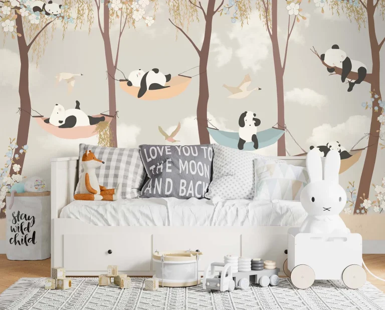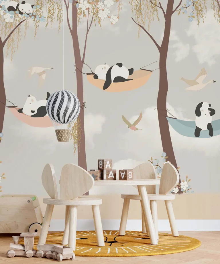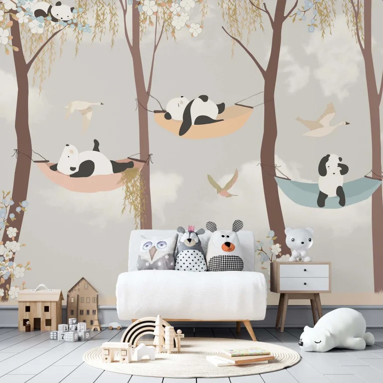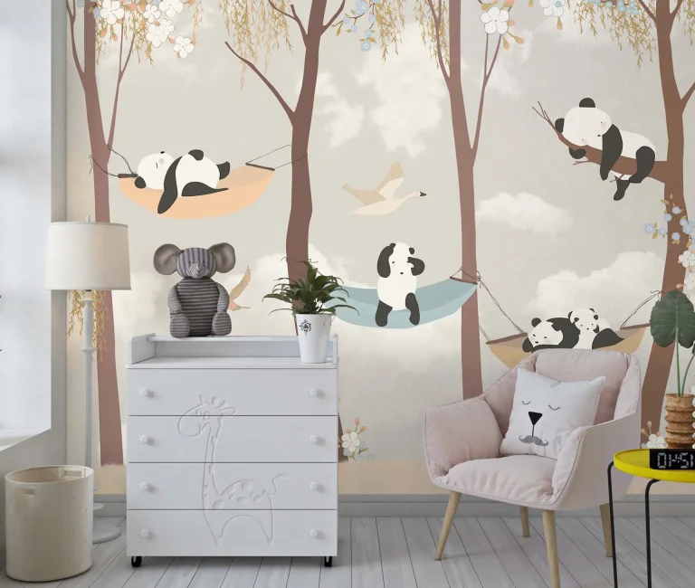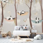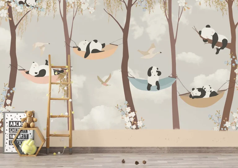 Cartoon Pandas Sleeping in Hammocks & Trees Wallpaper – Light Grey with White Clouds for Nursery