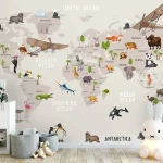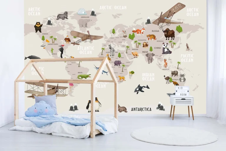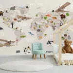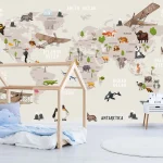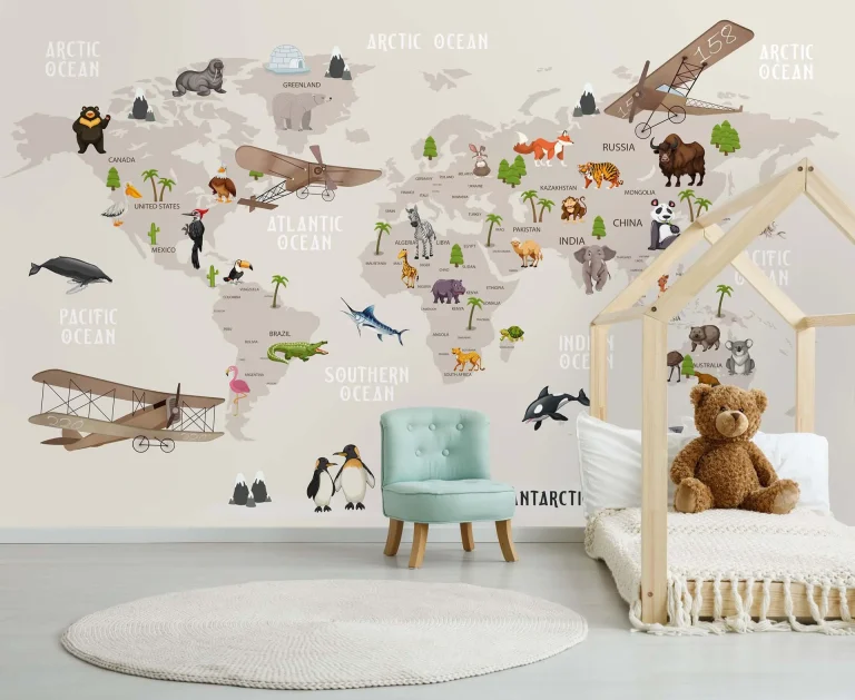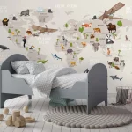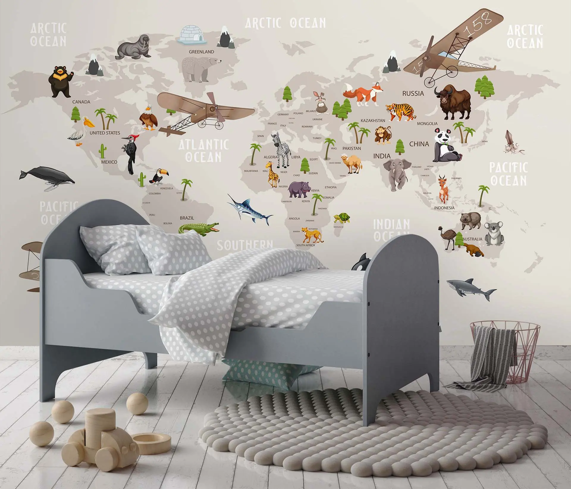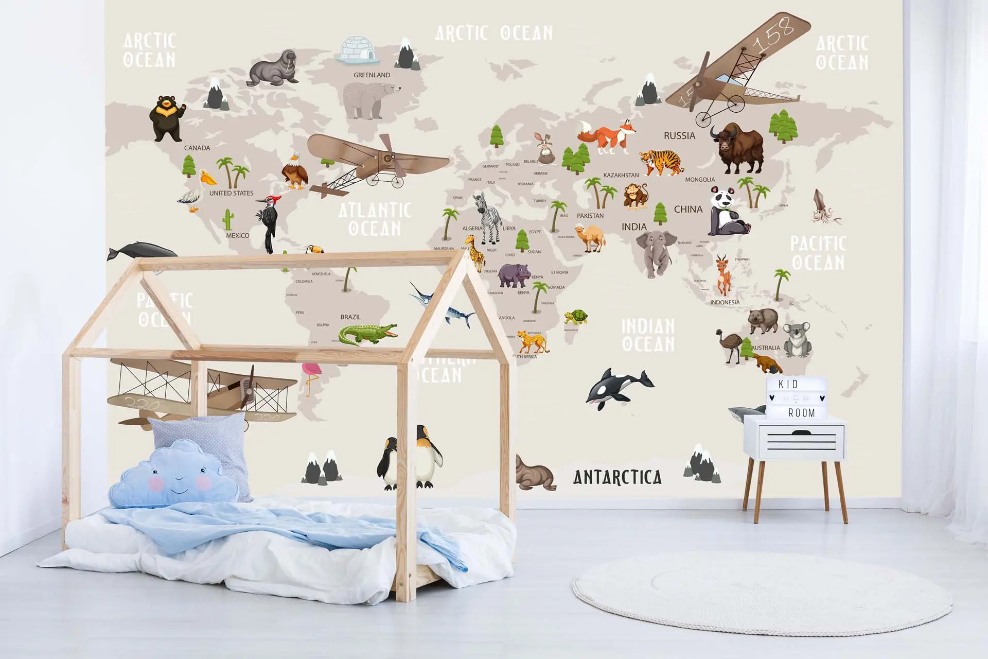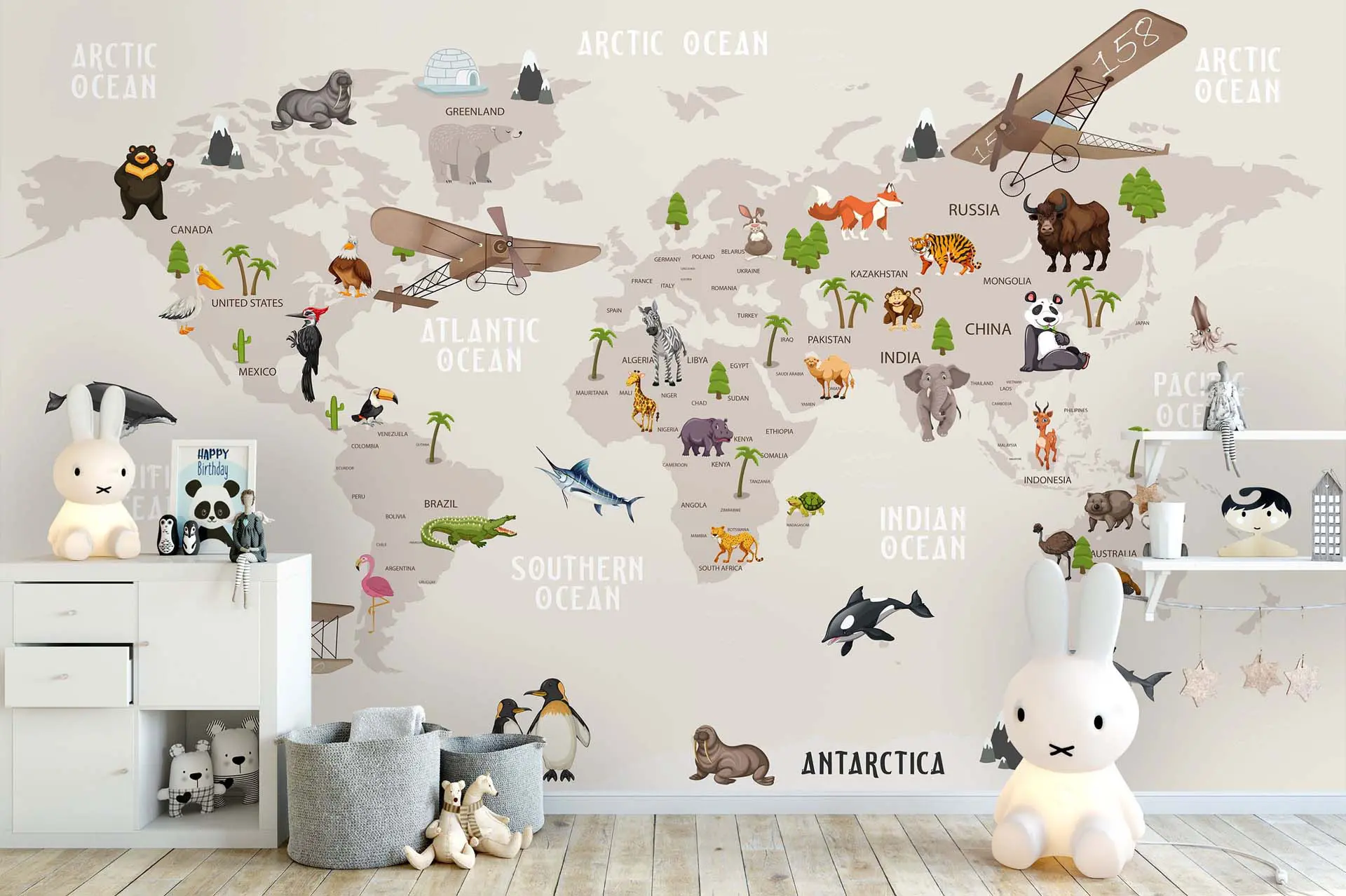Cartoon Retro Planes & Animals World Map on Beige Background for Children’s Room & Nursery