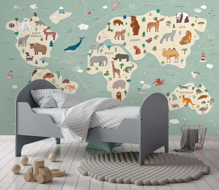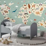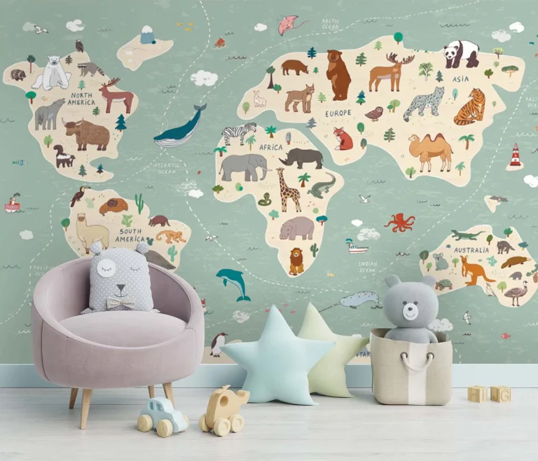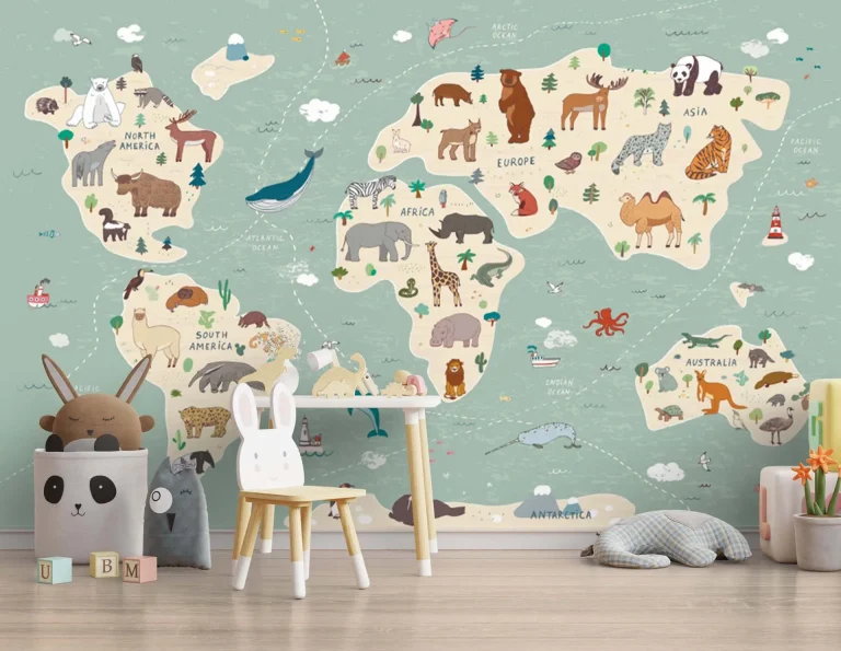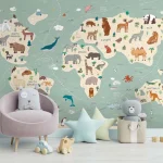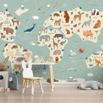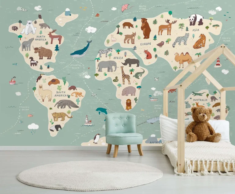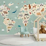 Cartoon World Map with Animals & Continent Names Wallpaper for Children’s Room & Nursery