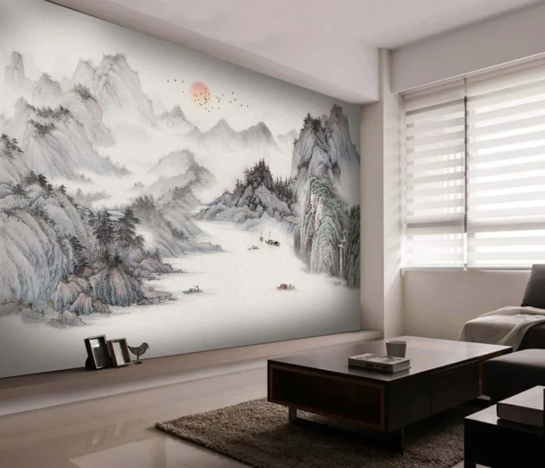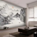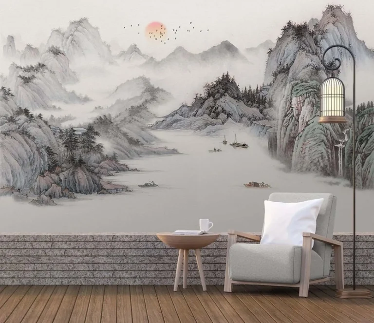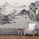 Chinoiserie Wallpaper with Misty Mountains, Waterfall, River, Boats at Sunset – Peaceful, Artistic