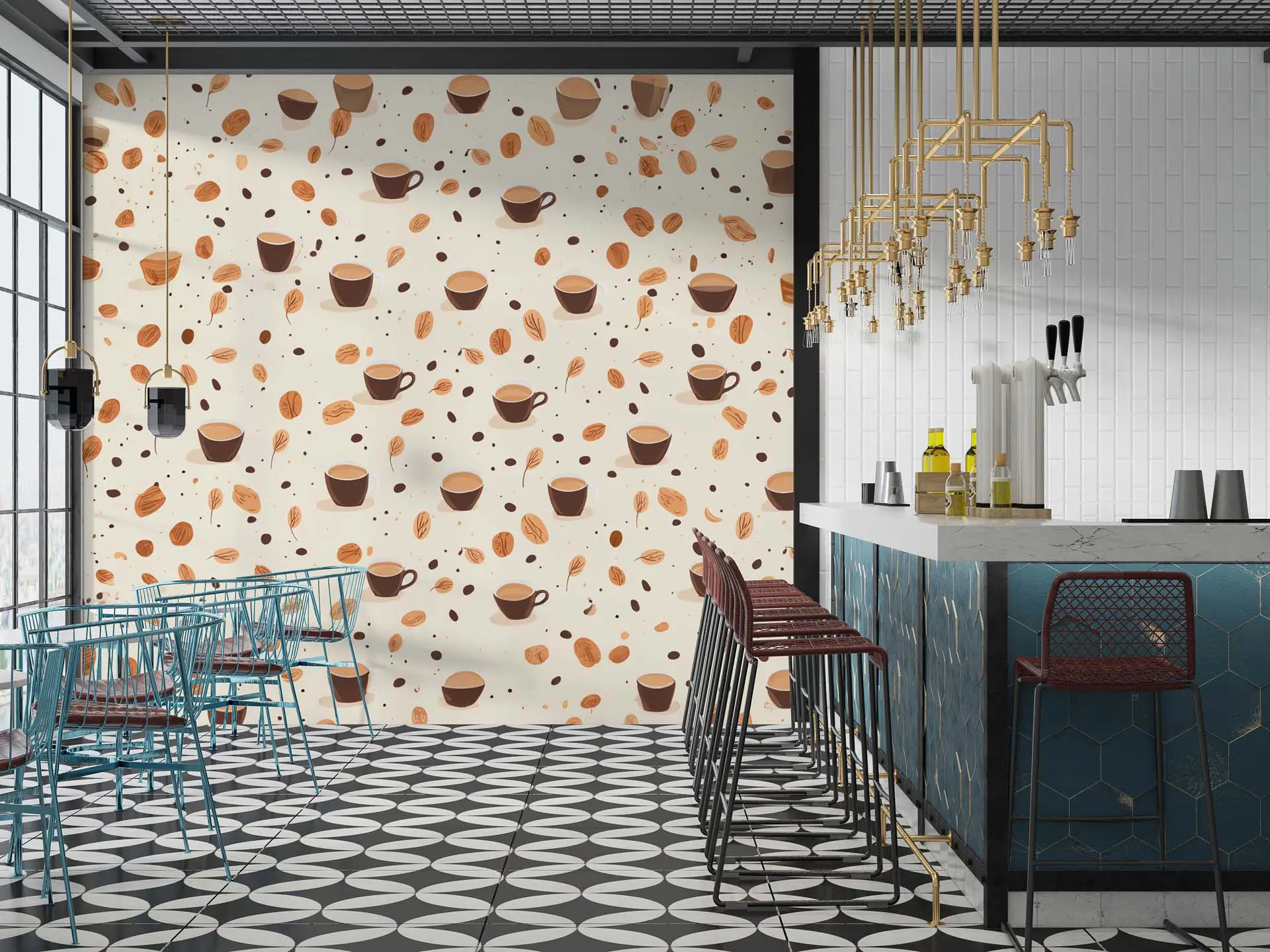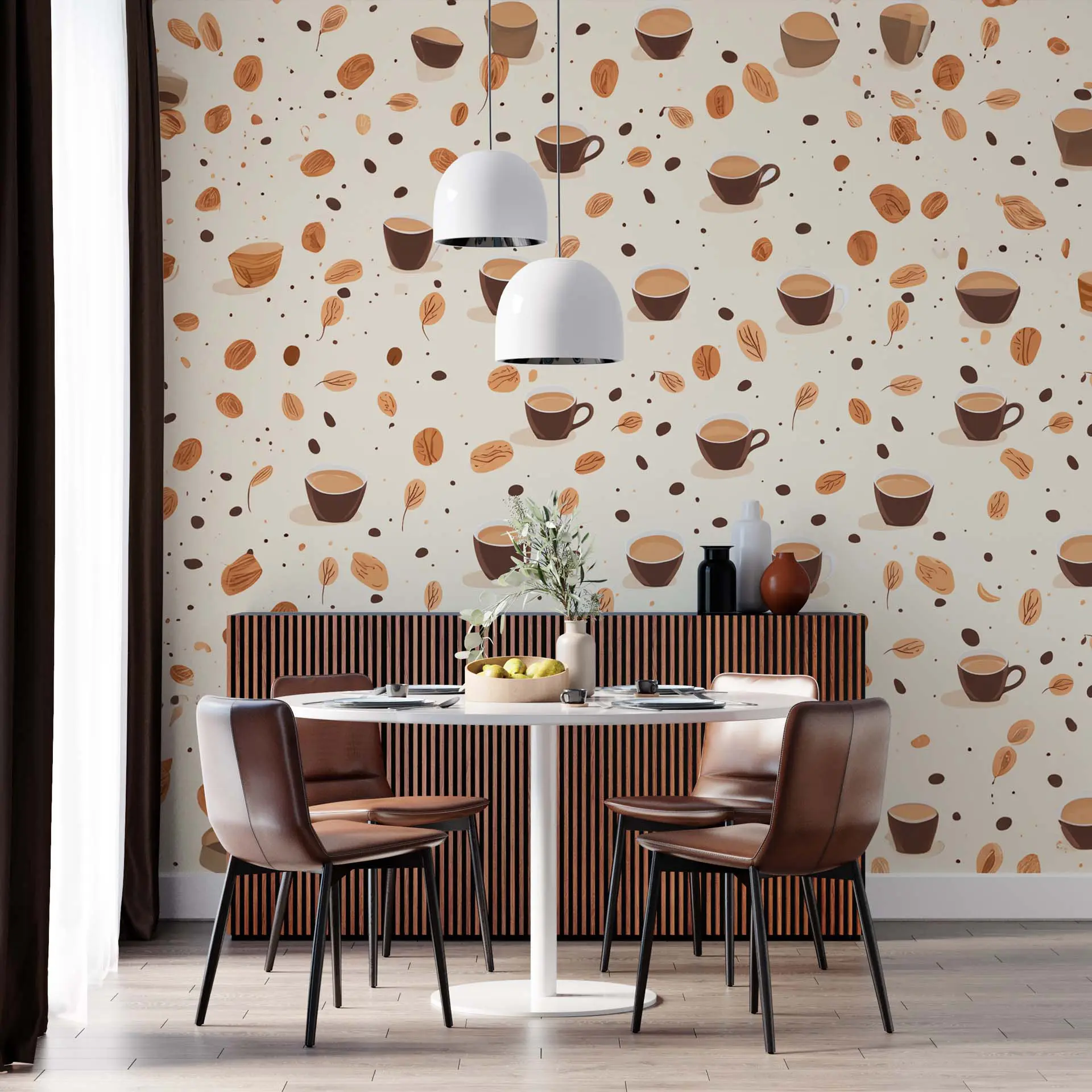 Coffee Cups and Nuts Pattern Wallpaper – Cozy and Inviting Wall Design for Cafes or Kitchens