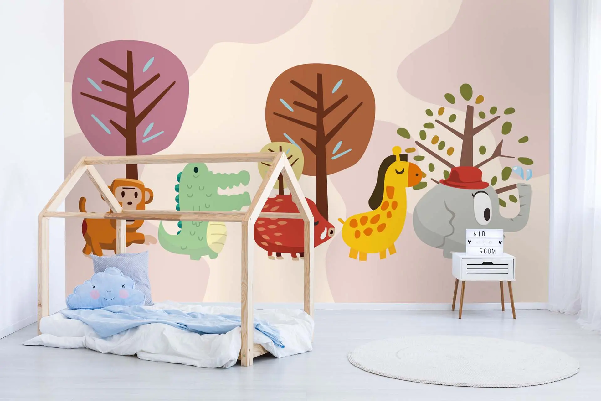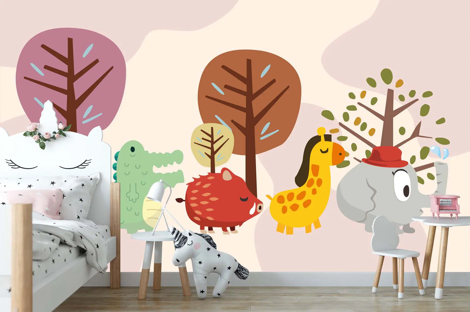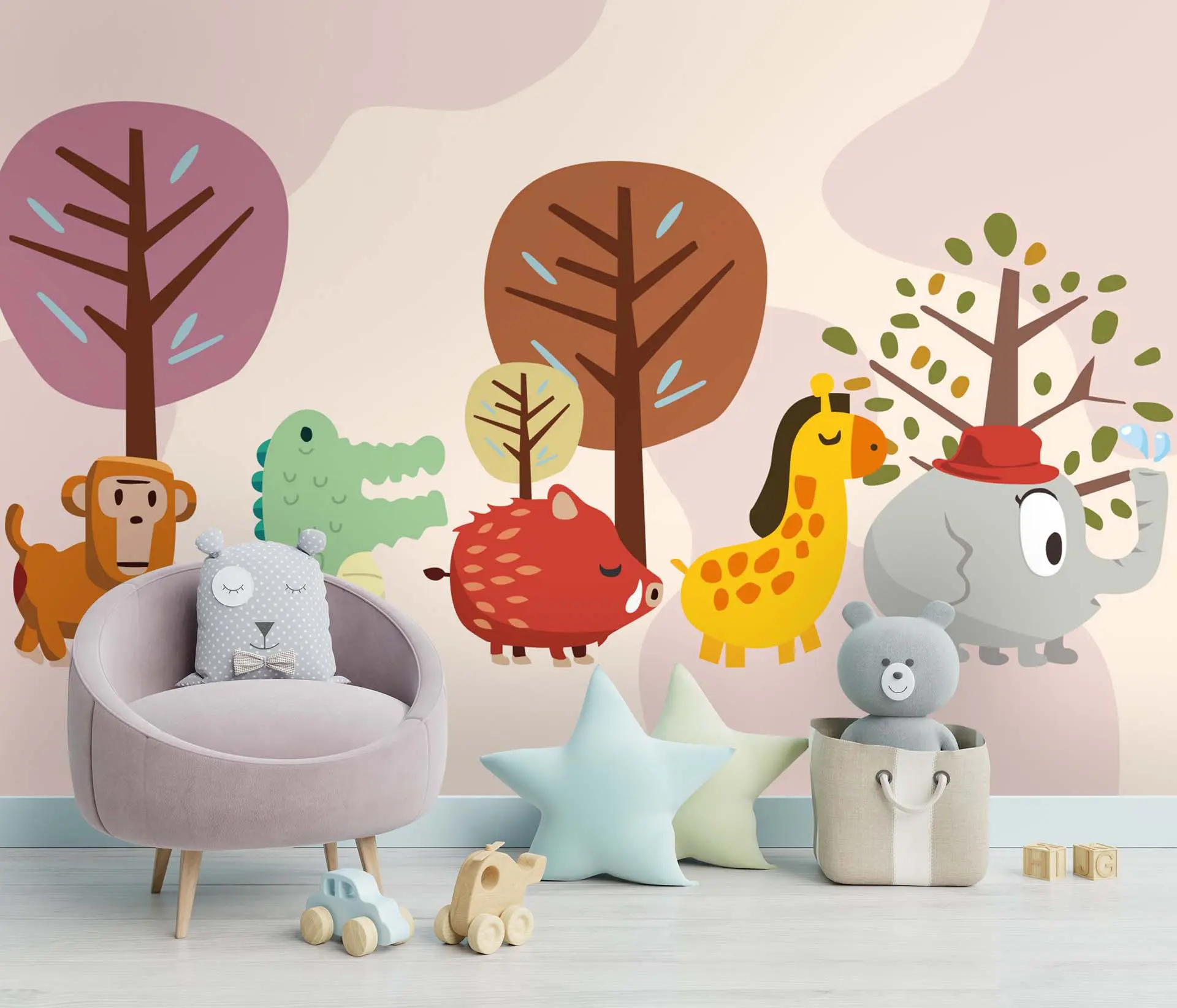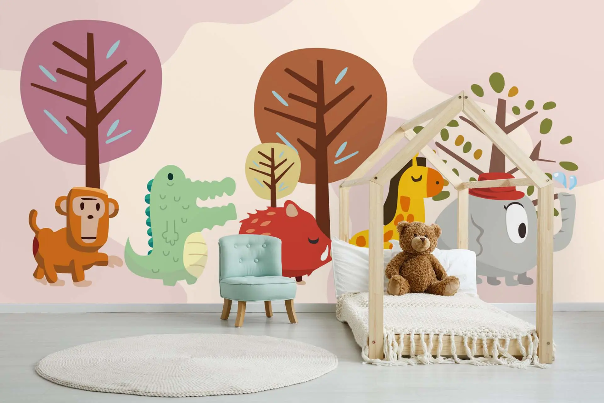 Colorful Cute Animal Characters Wallpaper – Crocodile, Elephant, Monkey, Giraffe in Pastel for Nursery