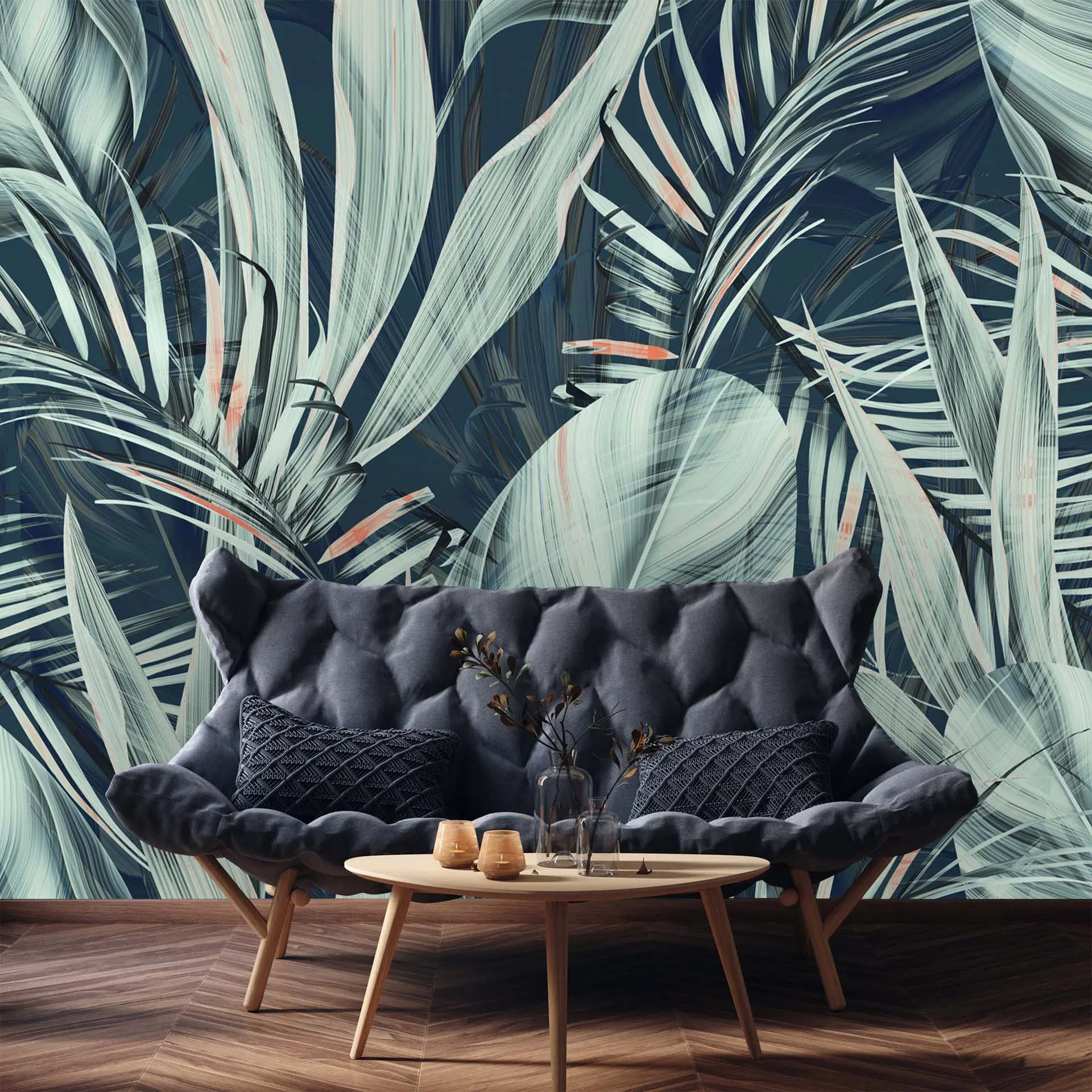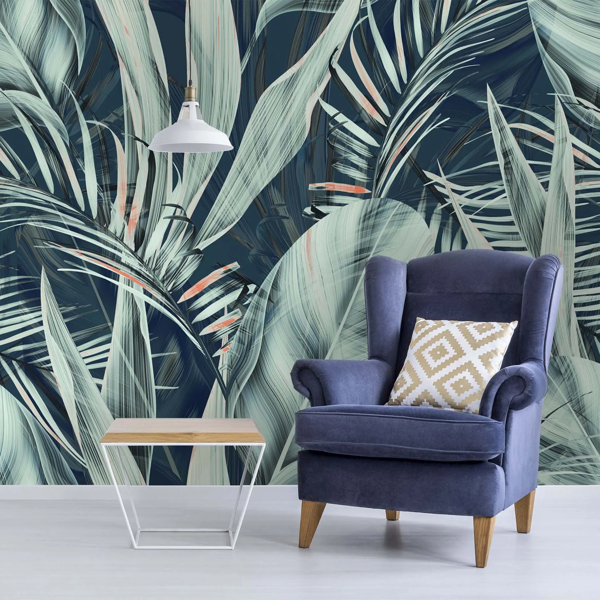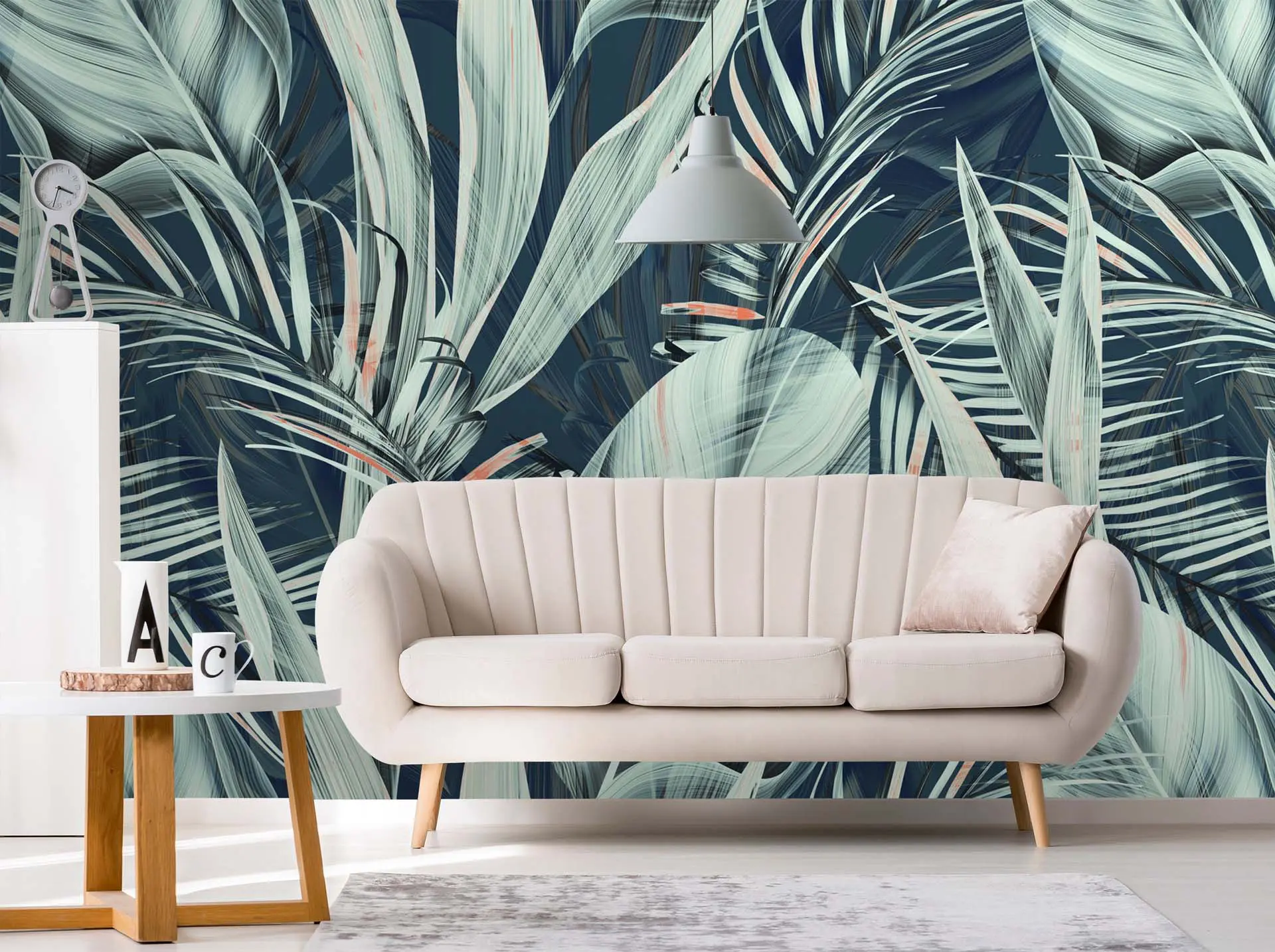 Dark Background Tropical Green Leaves Wallpaper – Lush Botanical Design for Modern Interiors