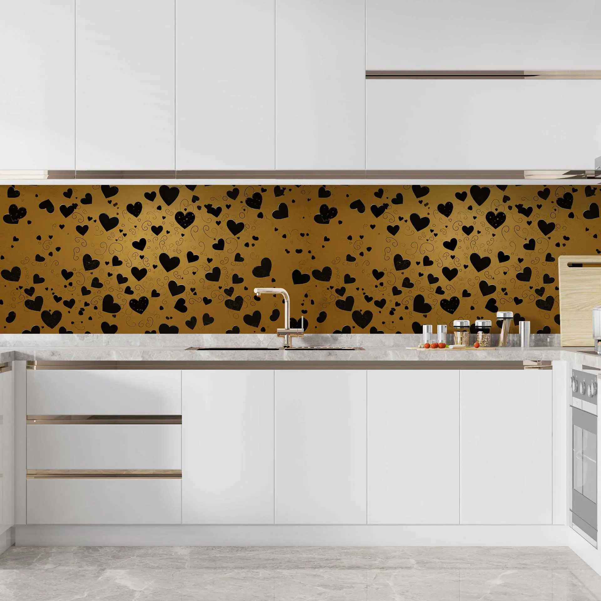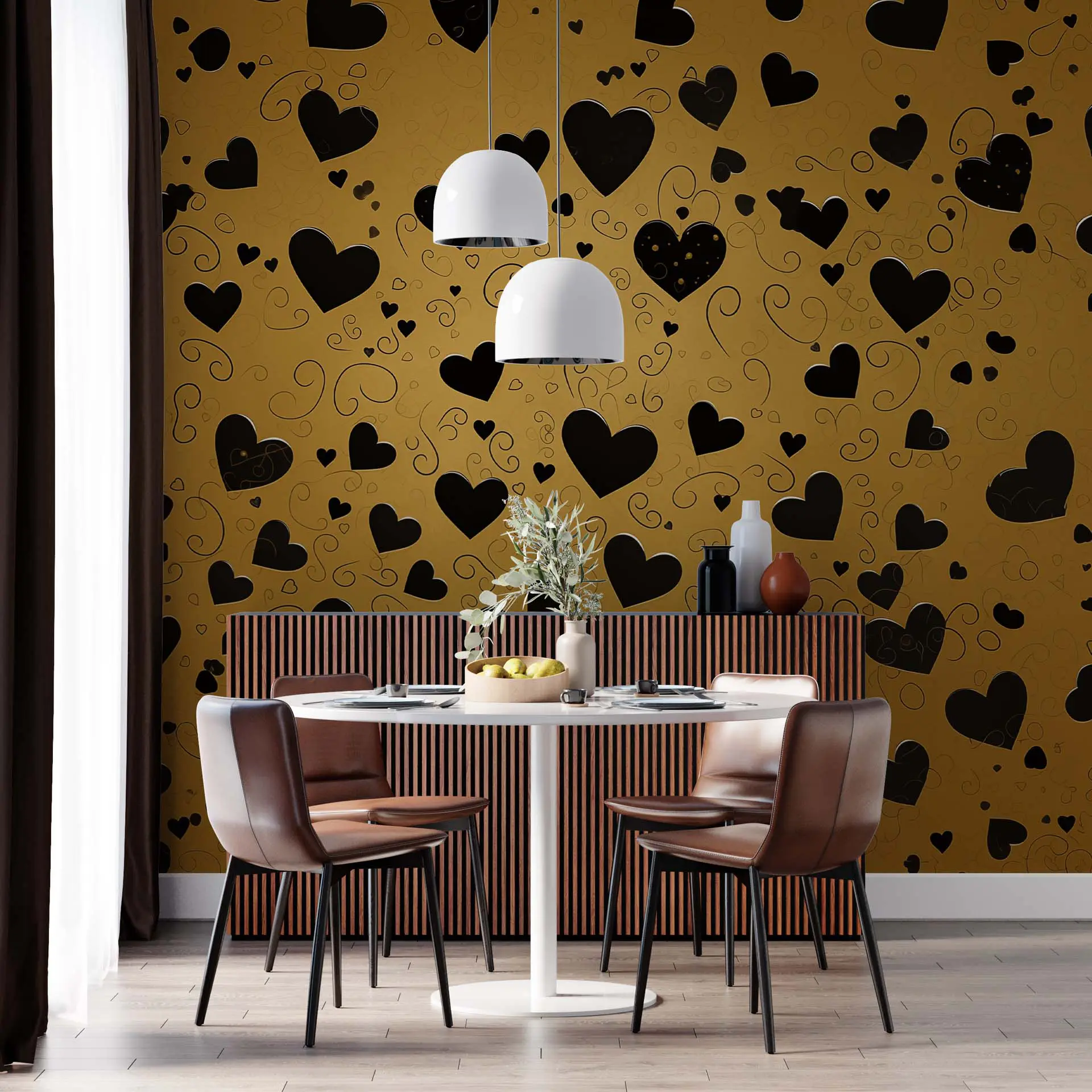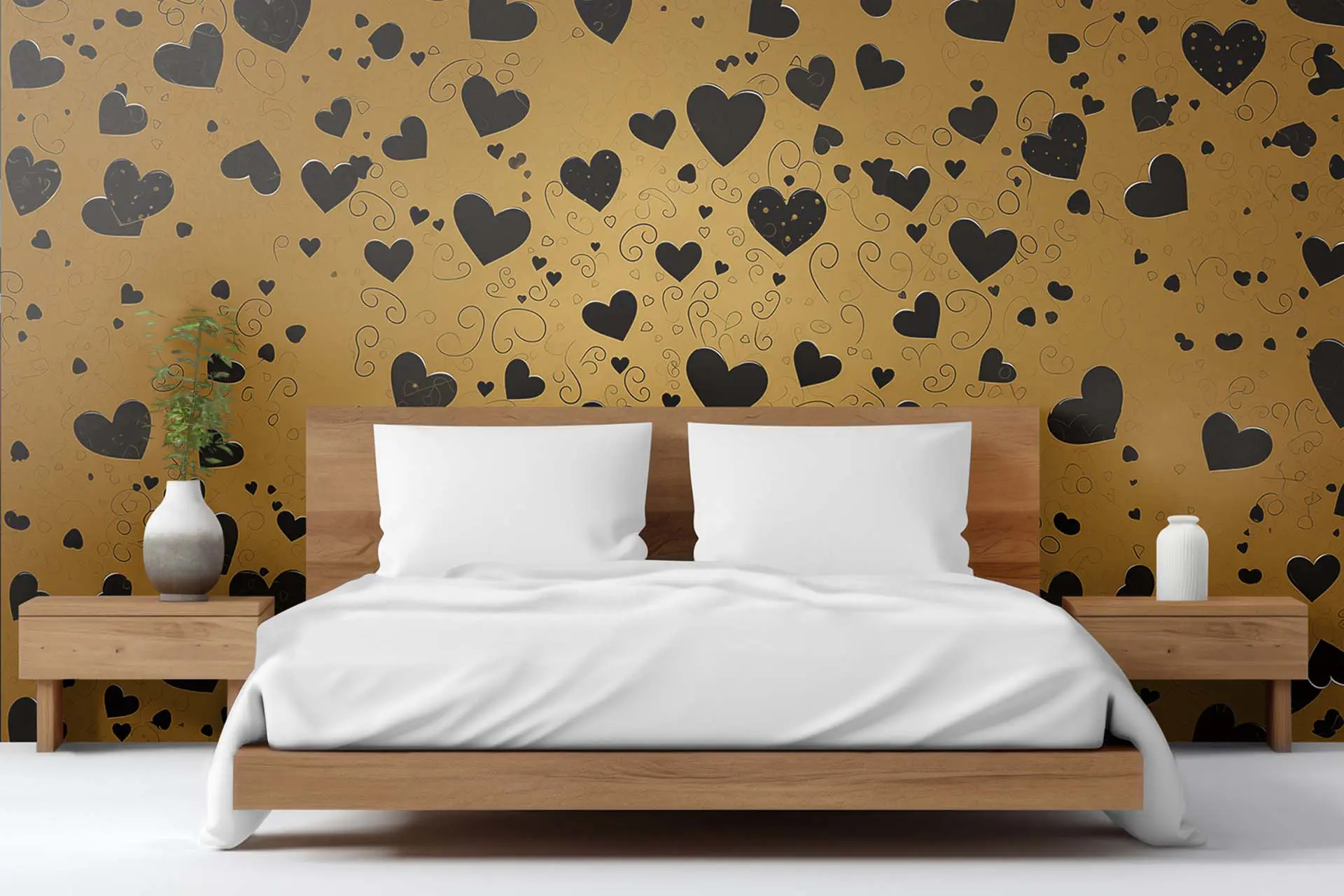 Elegant Black Heart Pattern on Gold Background Wallpaper – Romantic Wall Design for Bedroom or Living Room