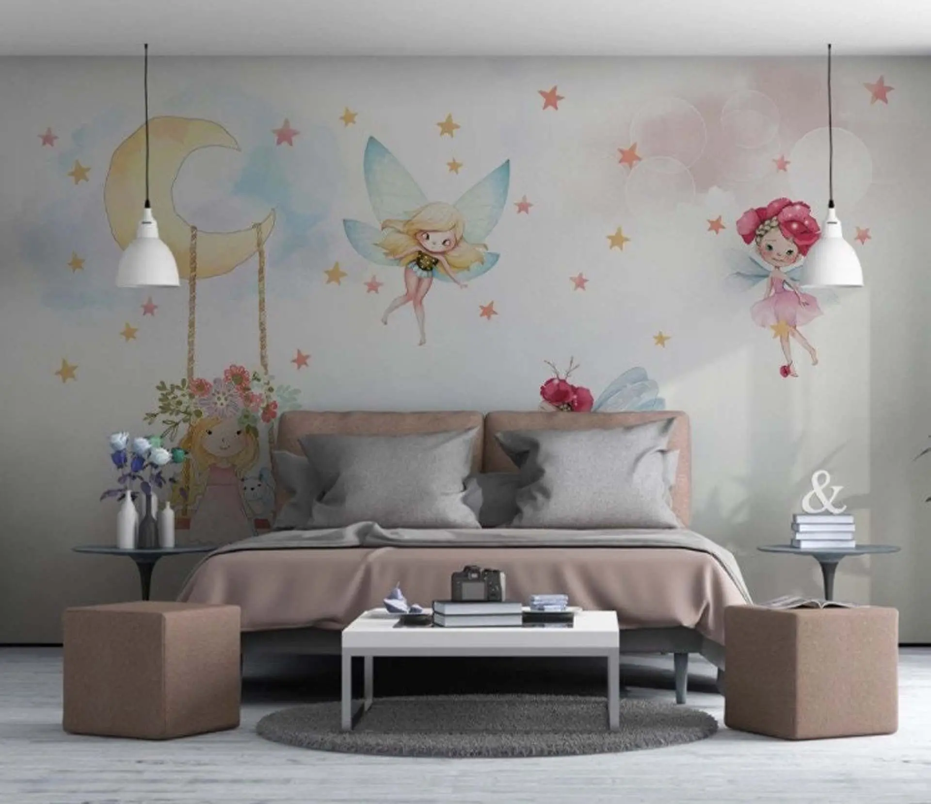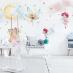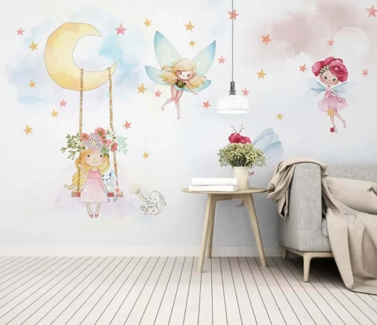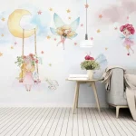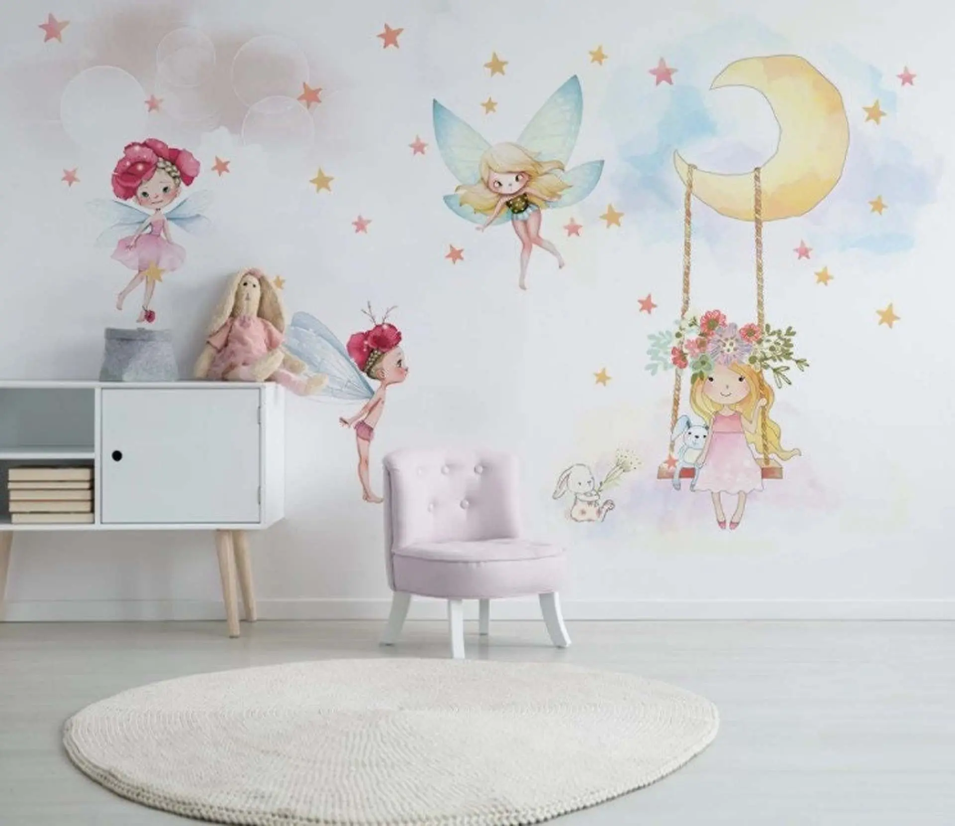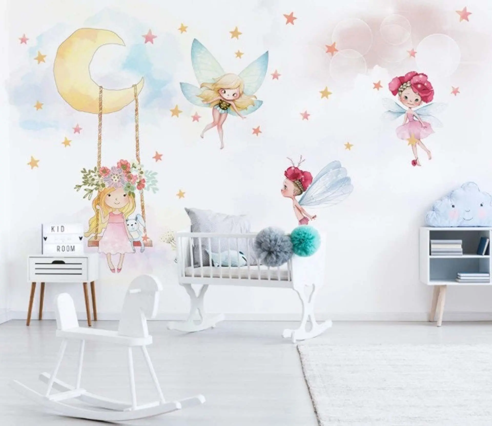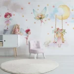 Girl on Swing Under Crescent Moon Wallpaper with Flying Fairies & Colorful Stars for Baby & Girl’s Nursery