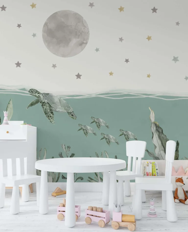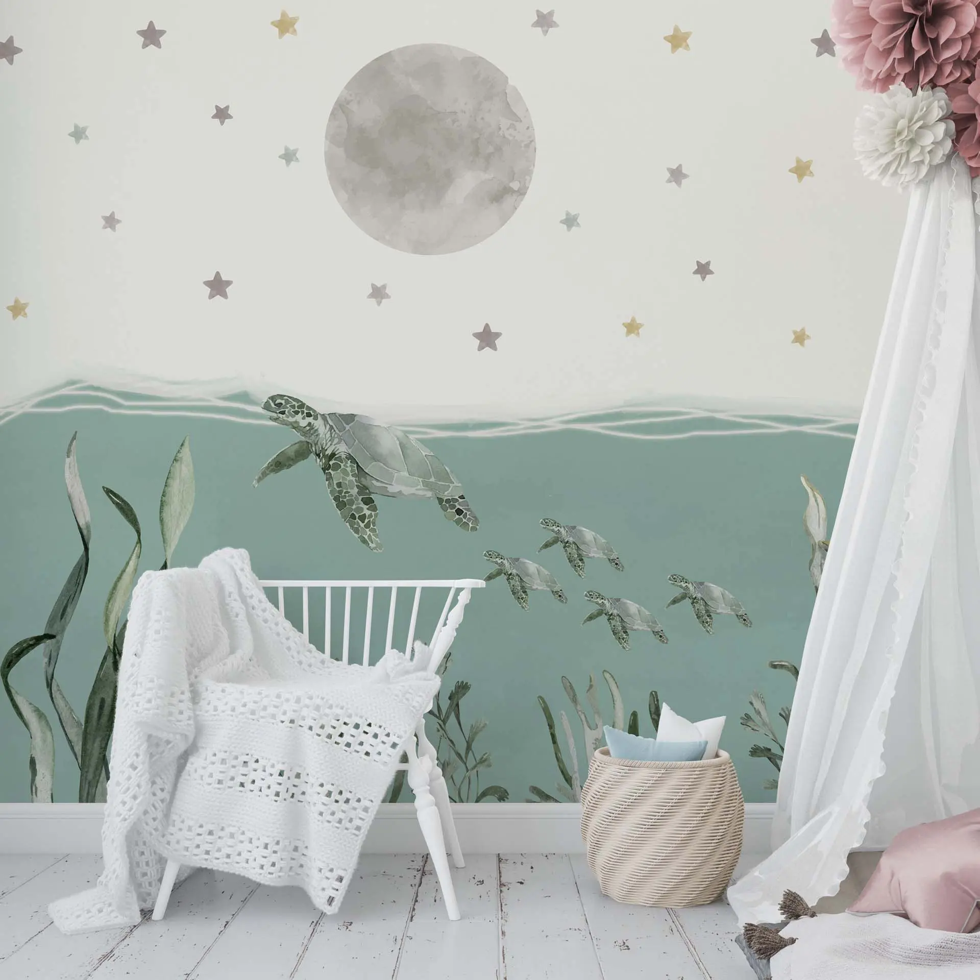 Grey Moon with Colorful Stars, White Sky, and Sea Turtles Swimming in the Ocean – Pastel Colored Wallpaper