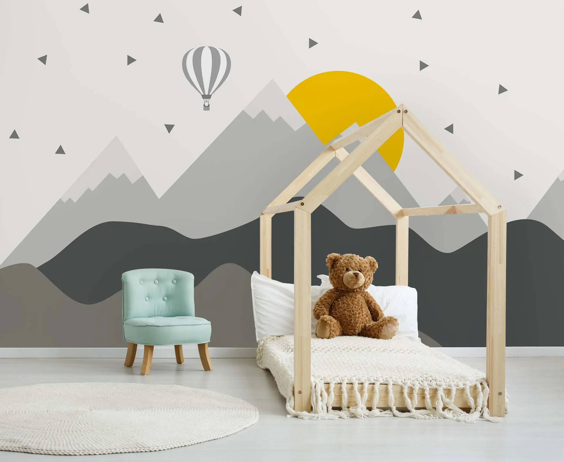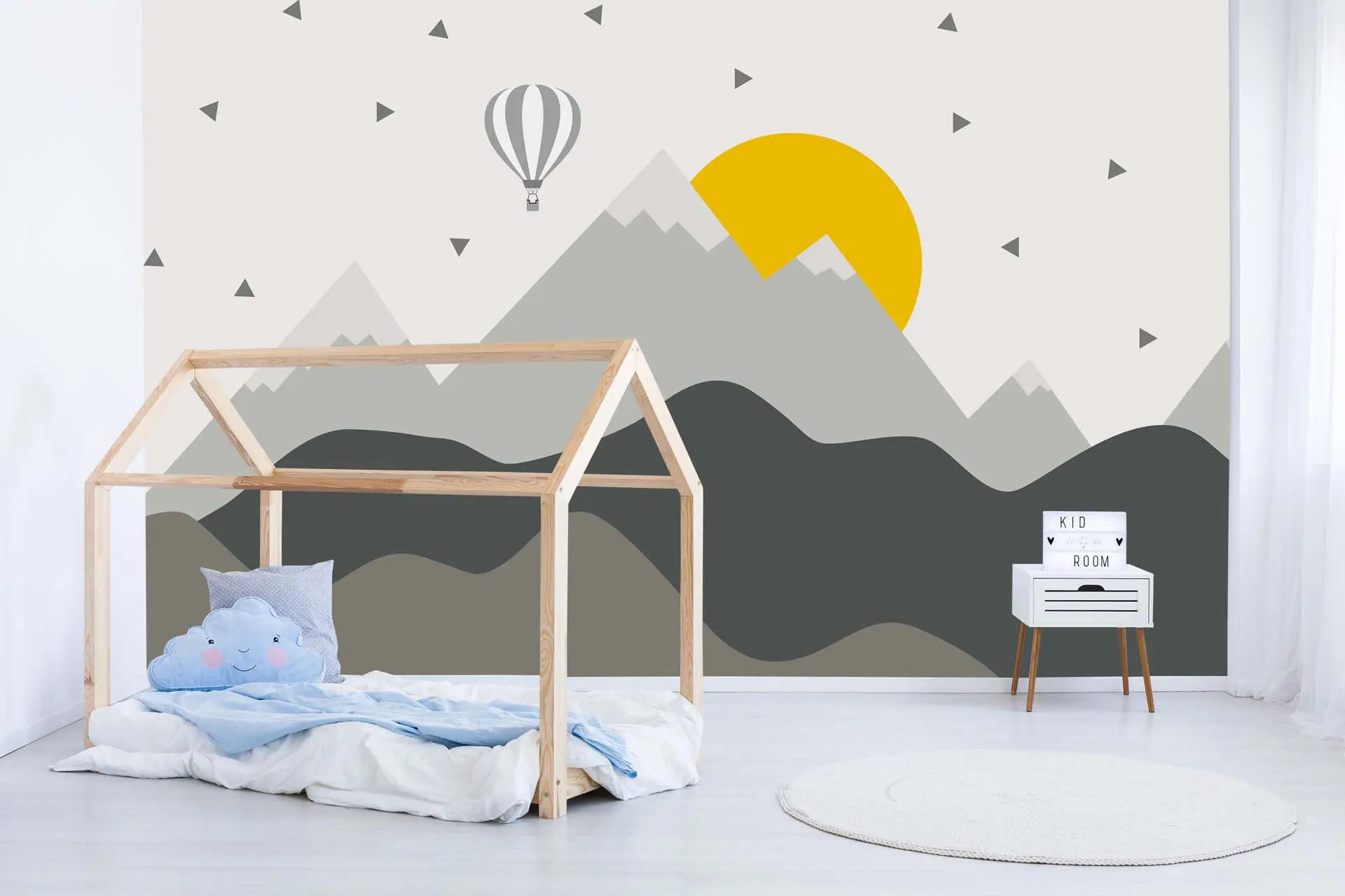 Grey Tones with Sharp Snowy Mountains, Hot Air Balloon, Big Yellow Sun Wallpaper for Nursery