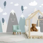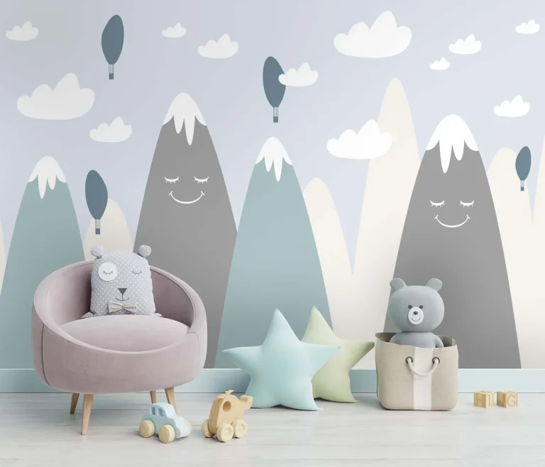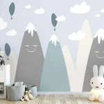 Happy Snowy Mountains in Blue & Grey with White Clouds & Hot Air Balloons for Nursery