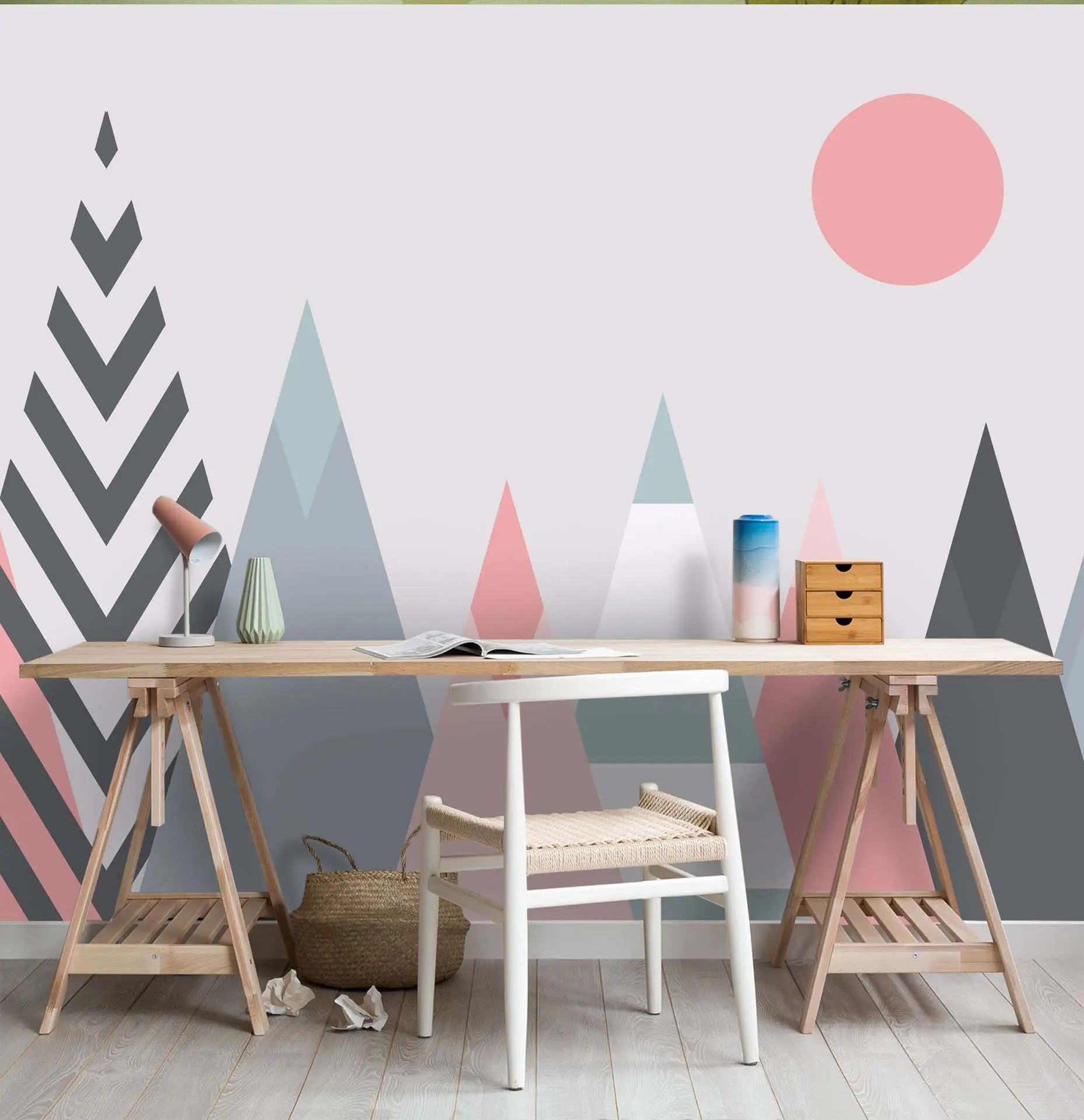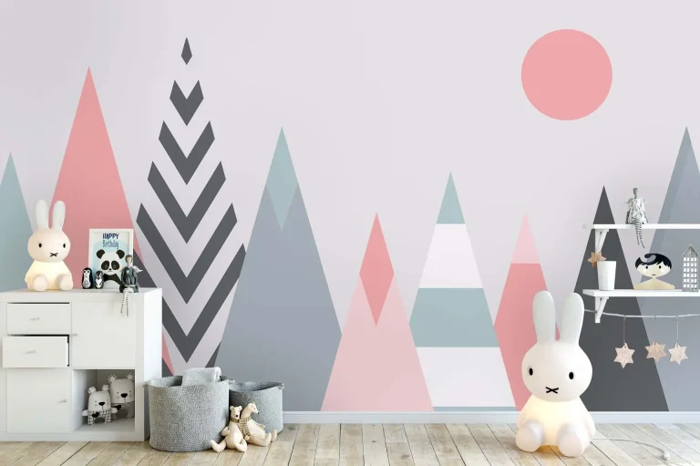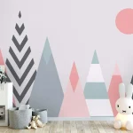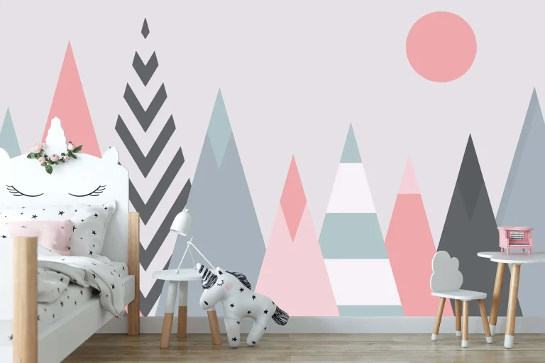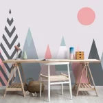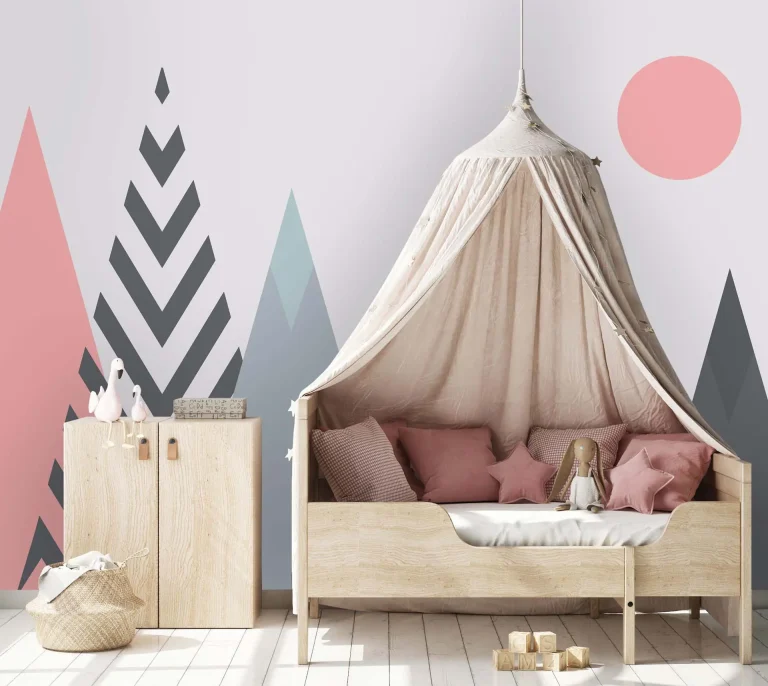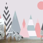 Light Sky with Patterned Sharp Mountains & Pink Sun – Pastel Colors for Baby & Child Room Decor
