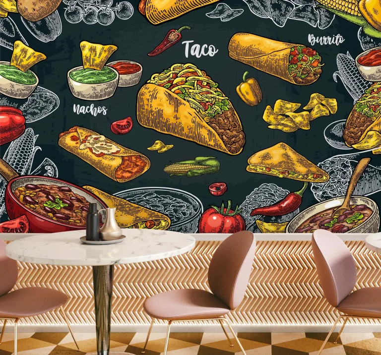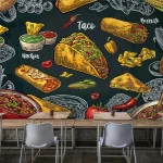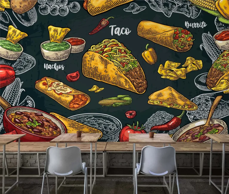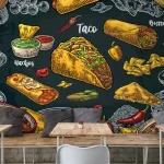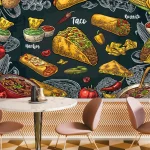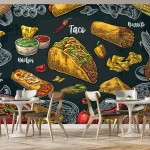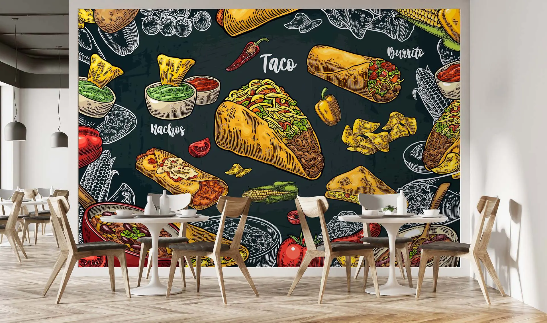 Mexican Food Chalkboard Inspired Wallpaper: Tacos, Spices for Restaurant & Kitchen Decor