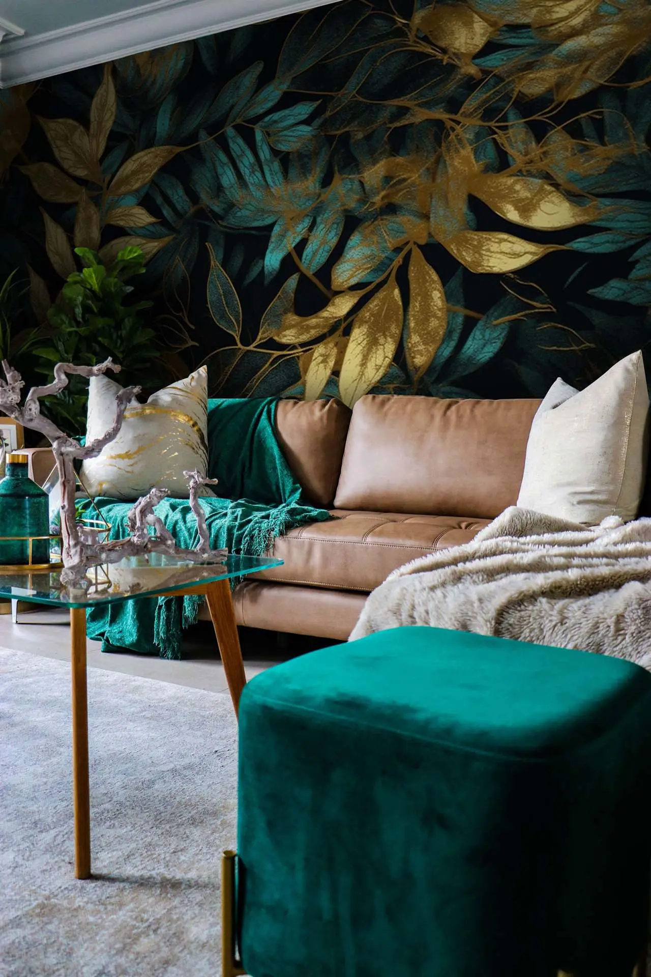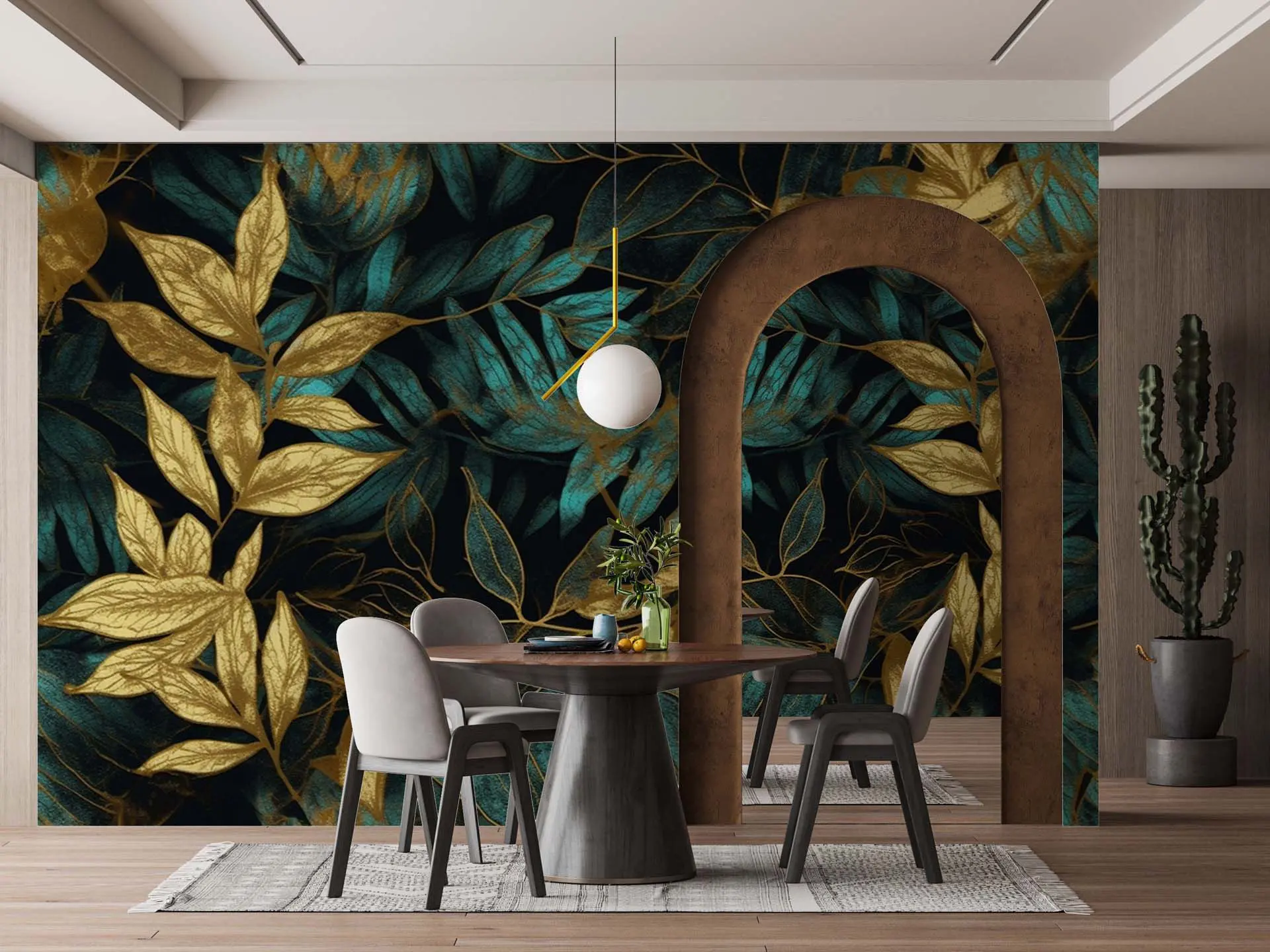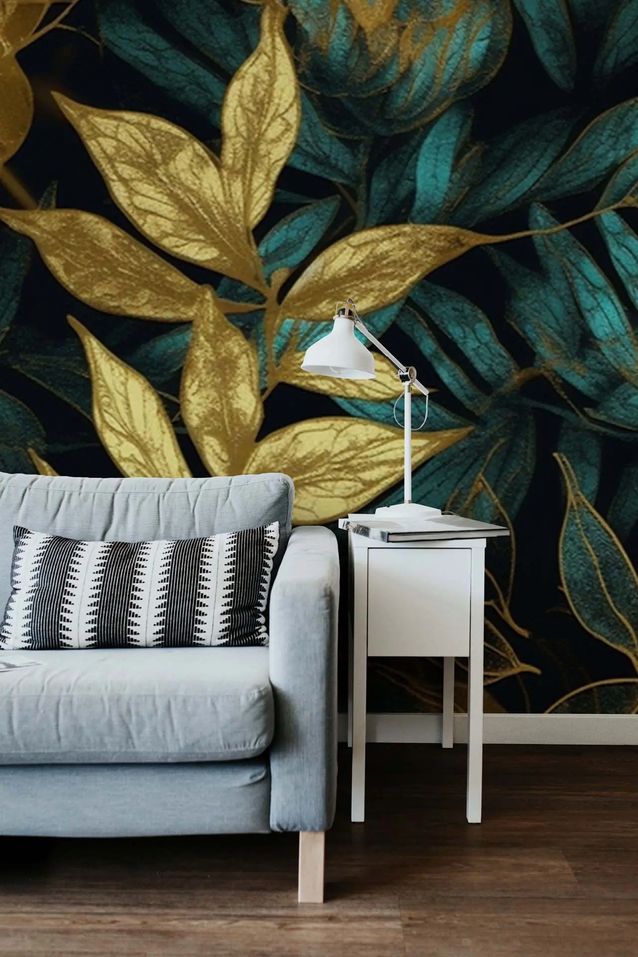 Modern Artistic Wallpaper with Black, Gold & Turquoise Leaves – Autumn Themed Elegance for Stylish Rooms