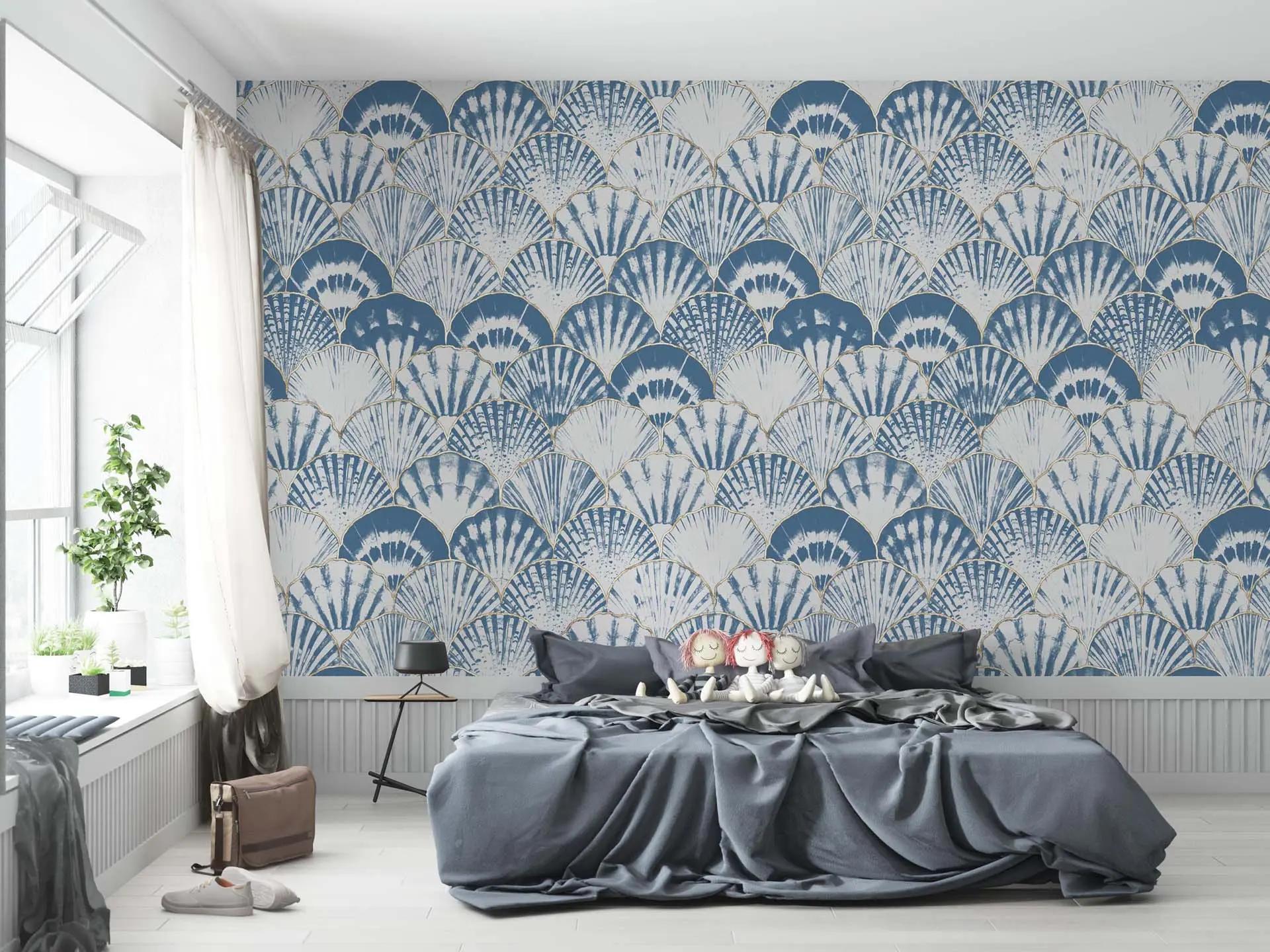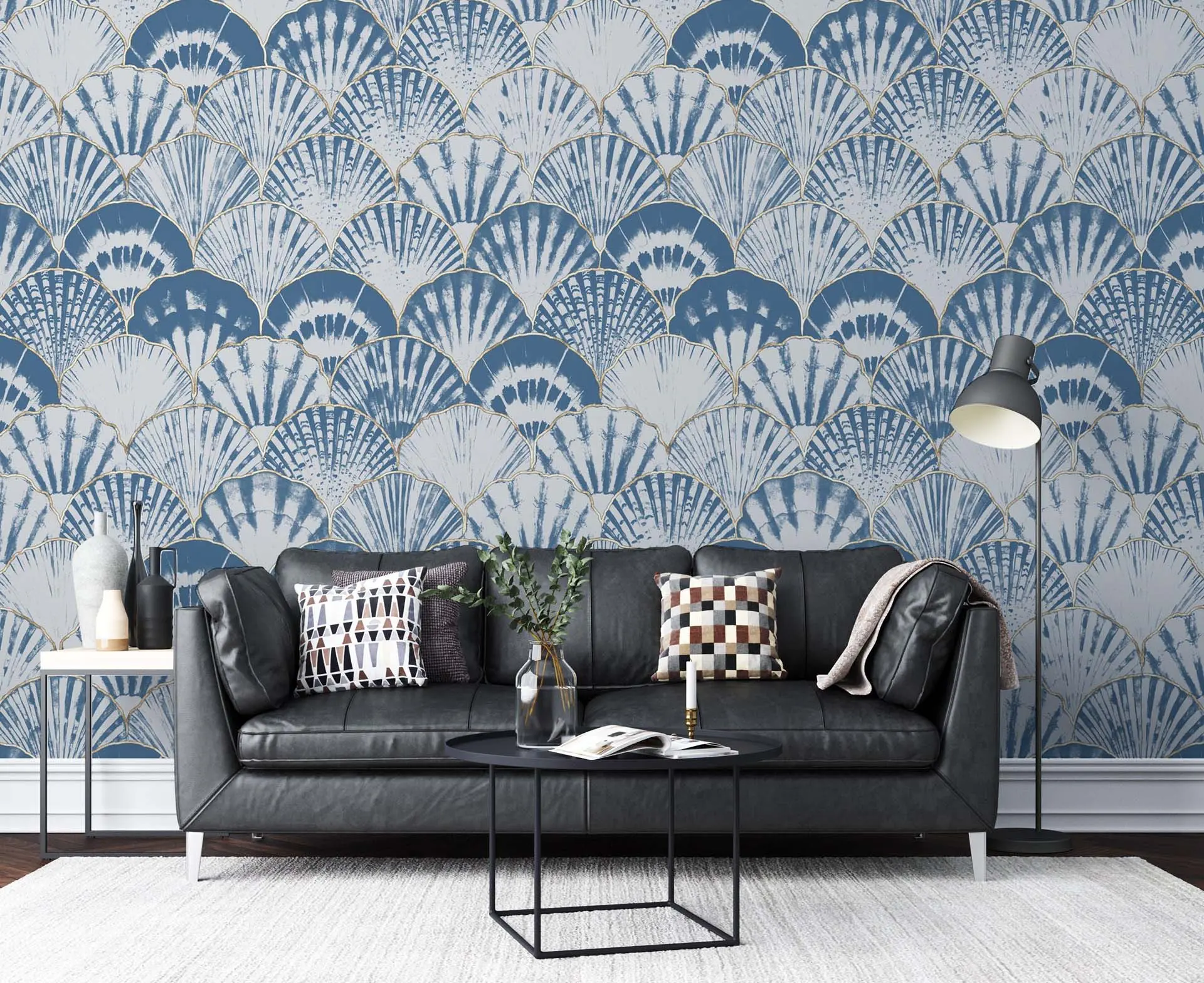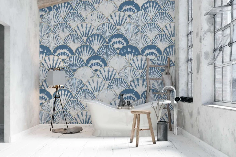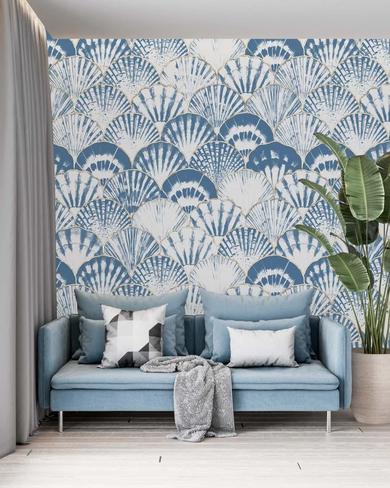 Modern Chic Wallpaper with Gold Lines & Distressed Blue Oysters in Various Patterns – Pastel Colors