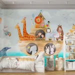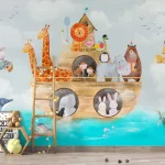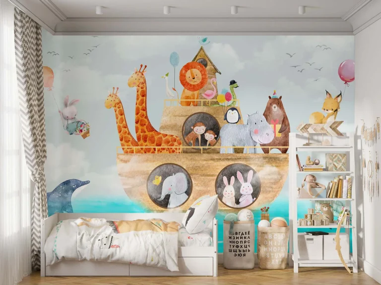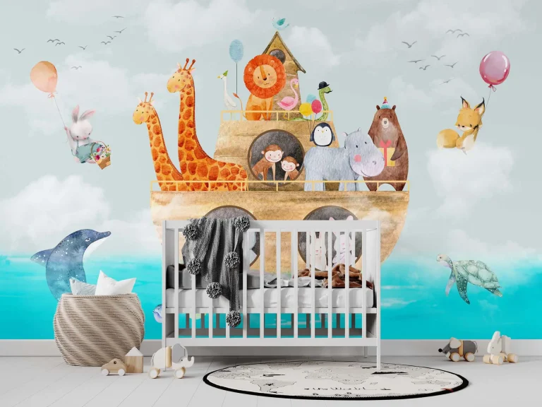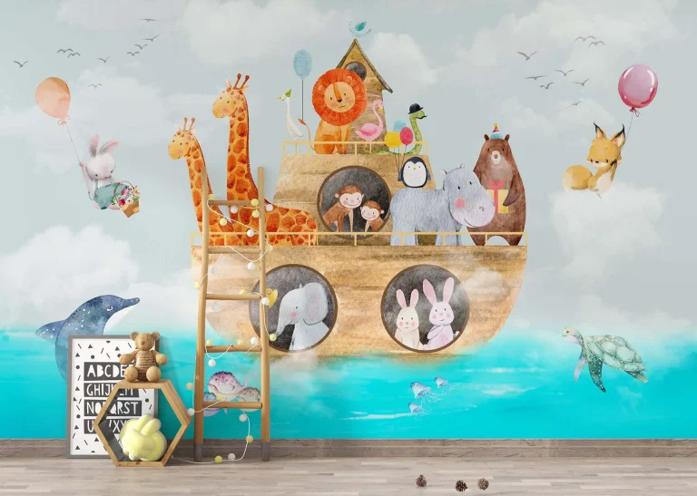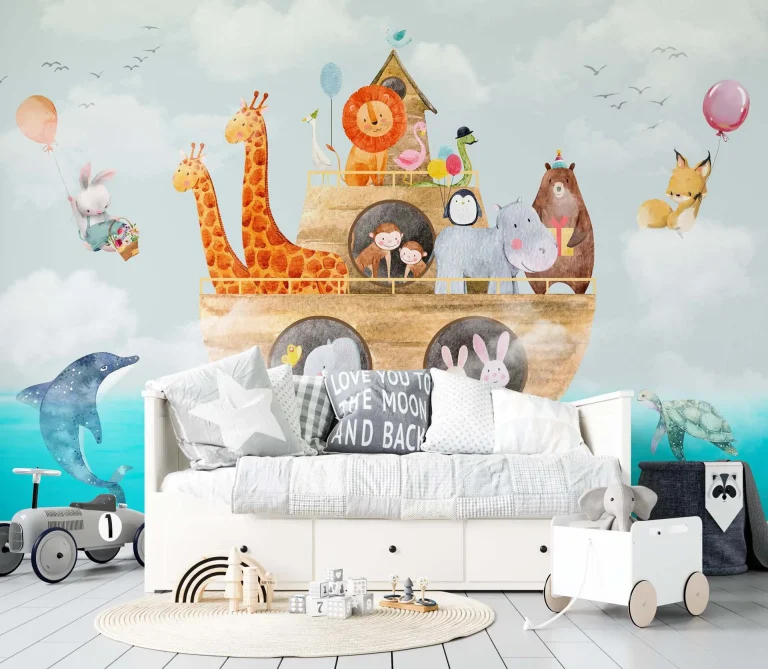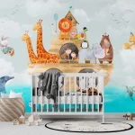 Noah’s Ark Pastel Cartoon Wallpaper – Animals, Giraffe, Lion, Dolphin for Baby & Kids Room and Nursery