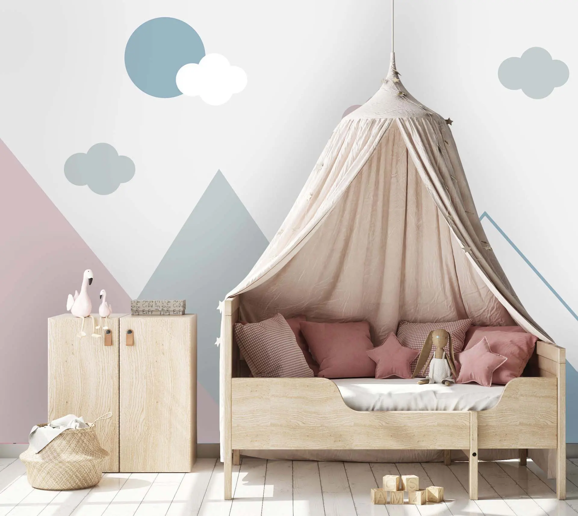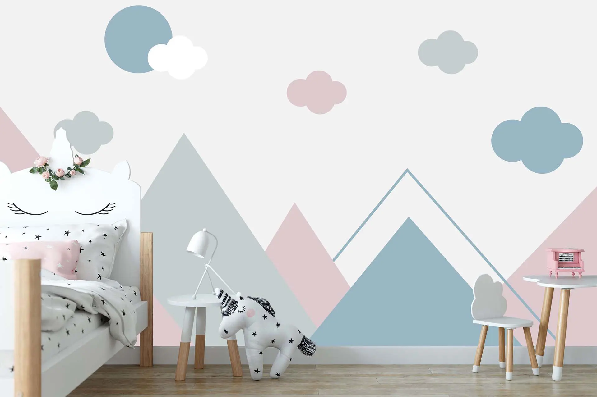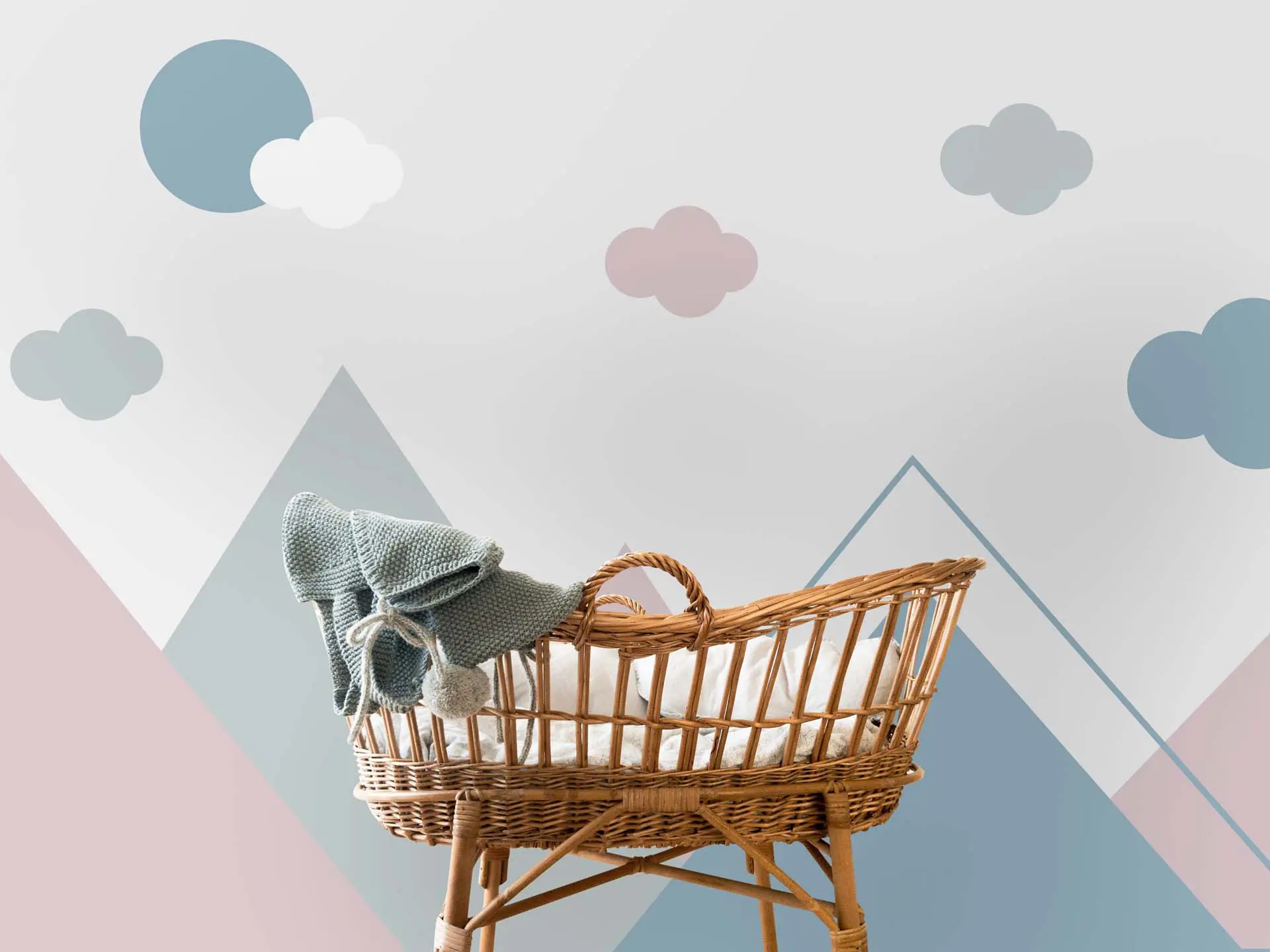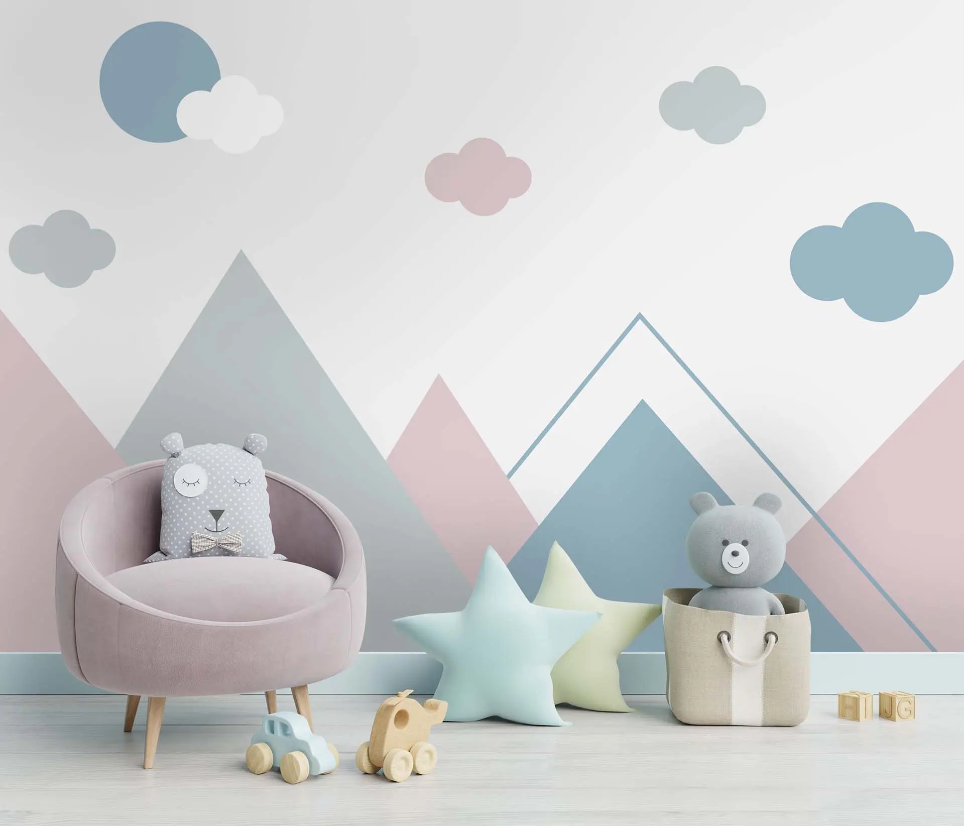 Pastel Colored Sharp Mountains & Clouds on Light Sky Background – Pink, Blue, Grey for Nursery