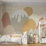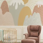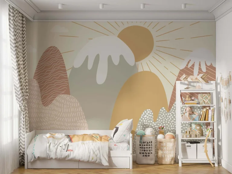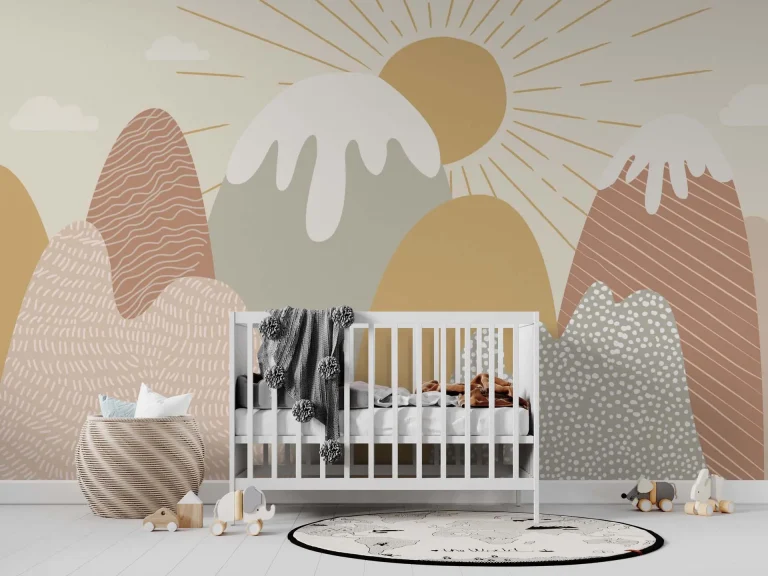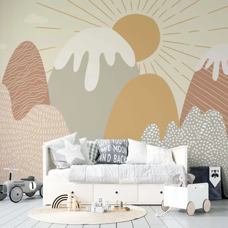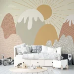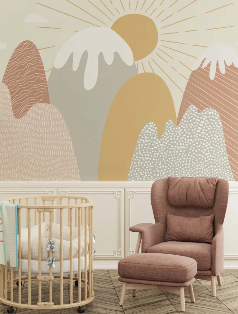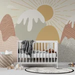 Pastel Nursery Wallpaper – Childlike Snowy Mountains & Sun Drawing for Kids Room & Preschool Decor