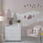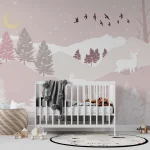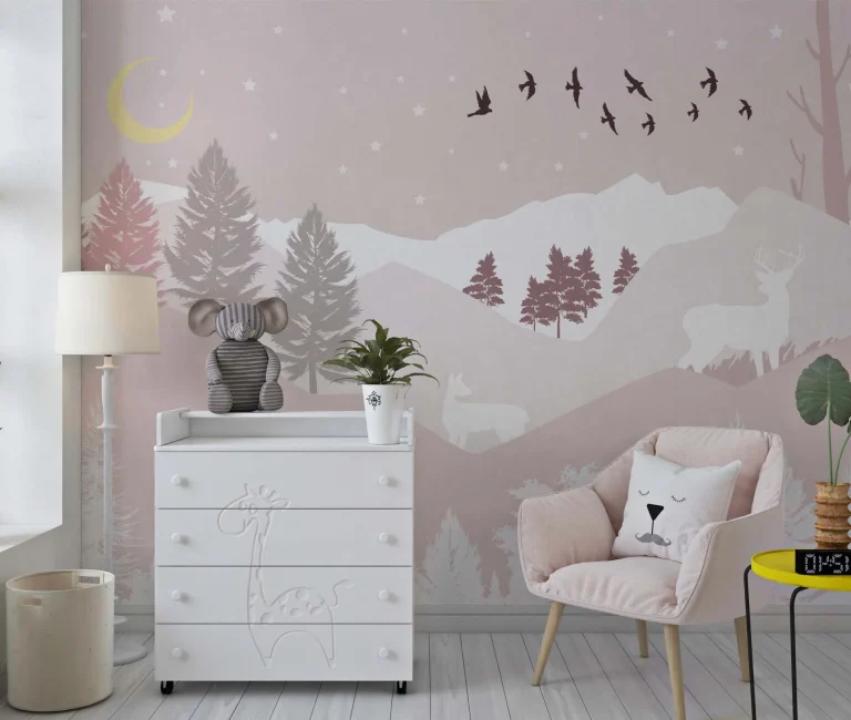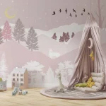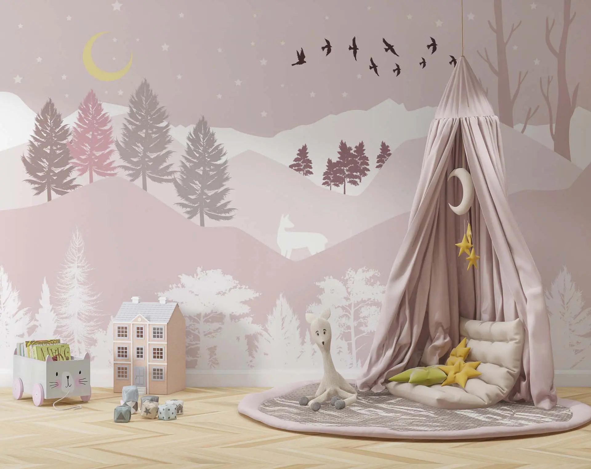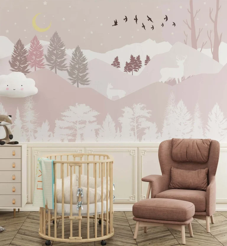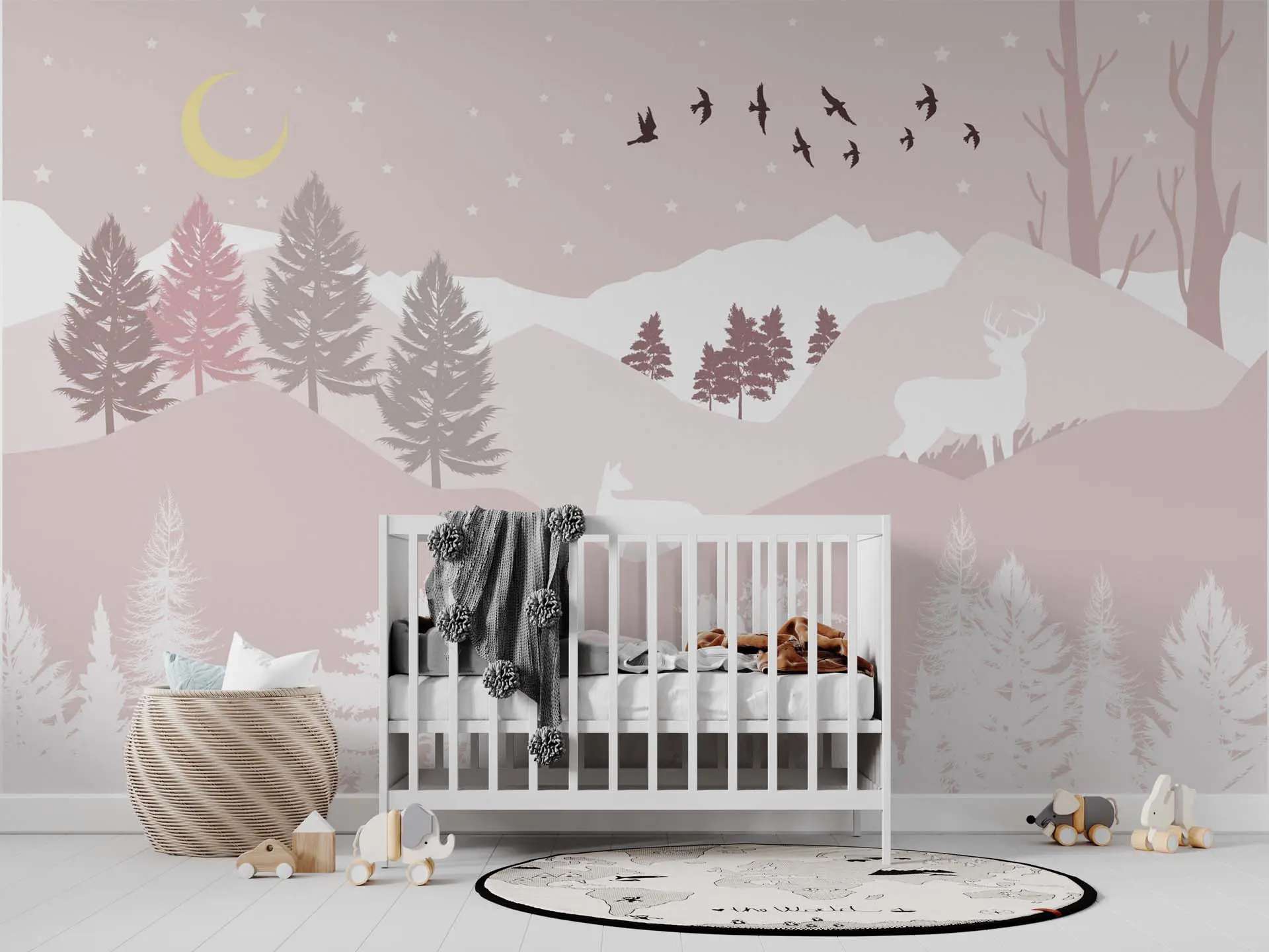 Pastel Pink Mountain & Sky Scene with Crescent, White Trees for Child’s Room & Nursery Deco