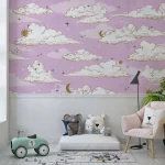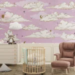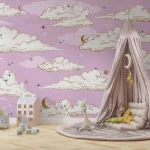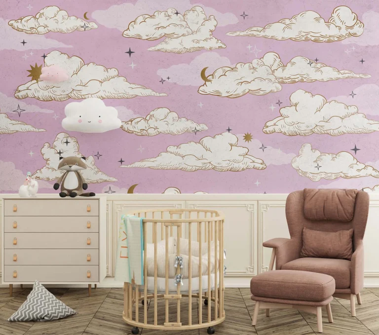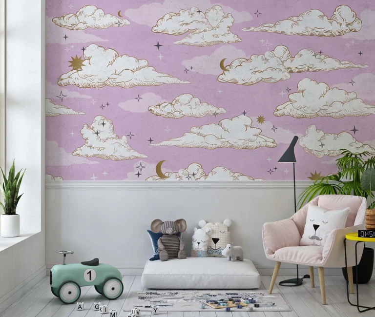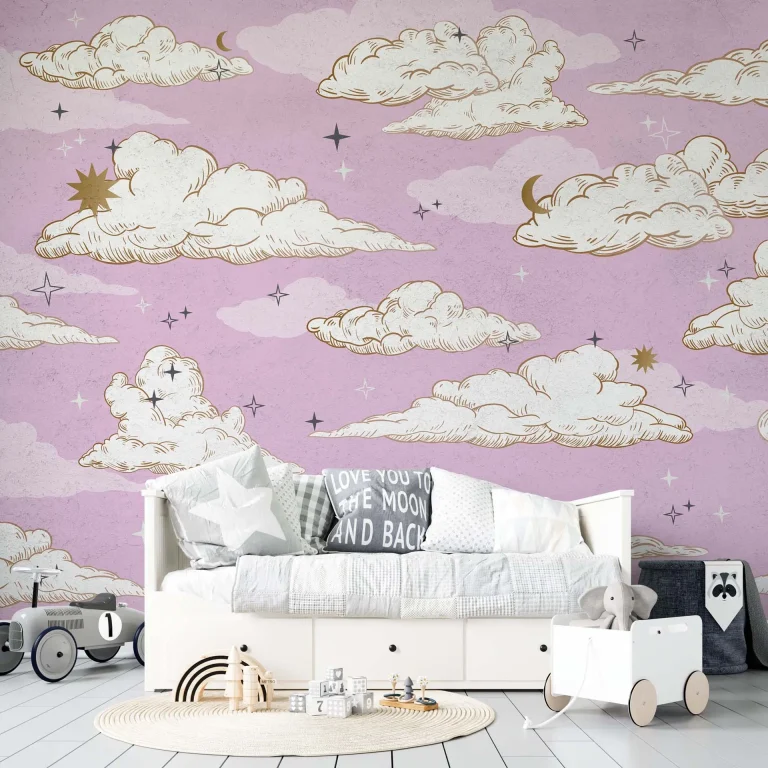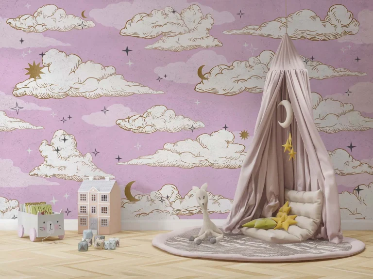 Pastel Pink Sky Wallpaper with Crescent, Stars, White Clouds for Baby Girl’s Room & Nursery