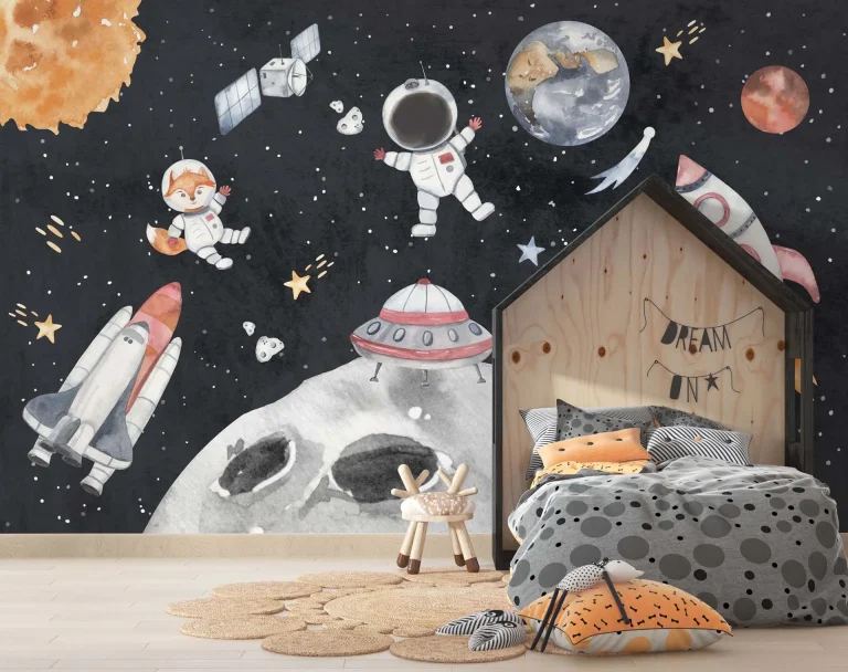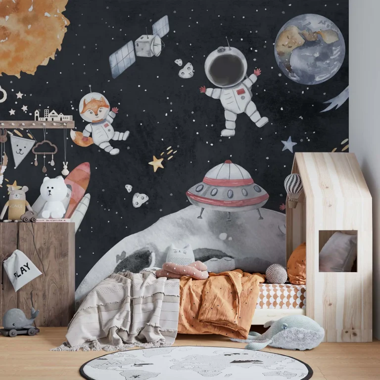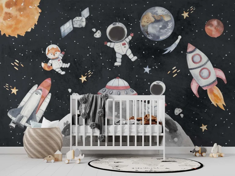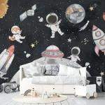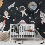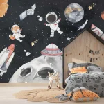 Pastel Space Themed Wallpaper – Astronauts, Rockets, Planets for Baby & Kids Room and Nursery