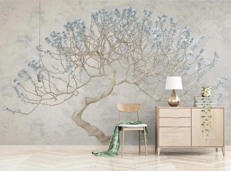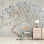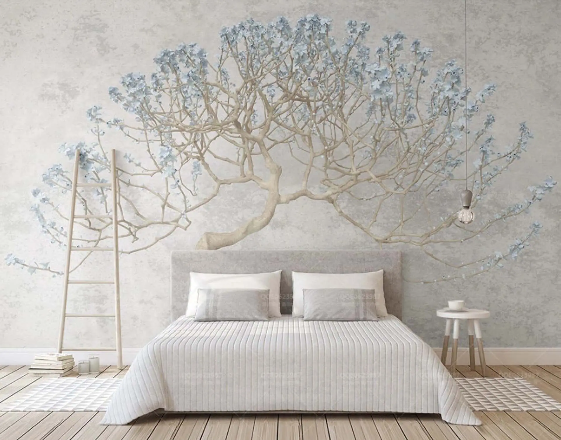 Patterned Light Grey Background with Iconic Tree in Blue Spring Flowers – Artistic Nature Modern