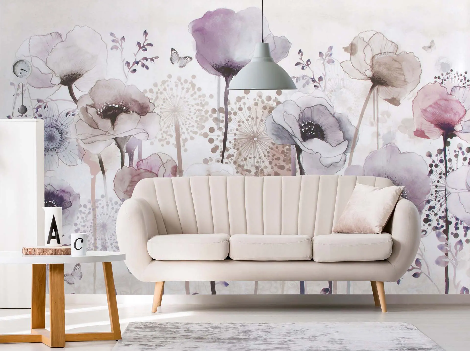 Peaceful Artistic Wallpaper with Pastel Colors & Watercolor Big Flowers – Botanical & Butterflies Design