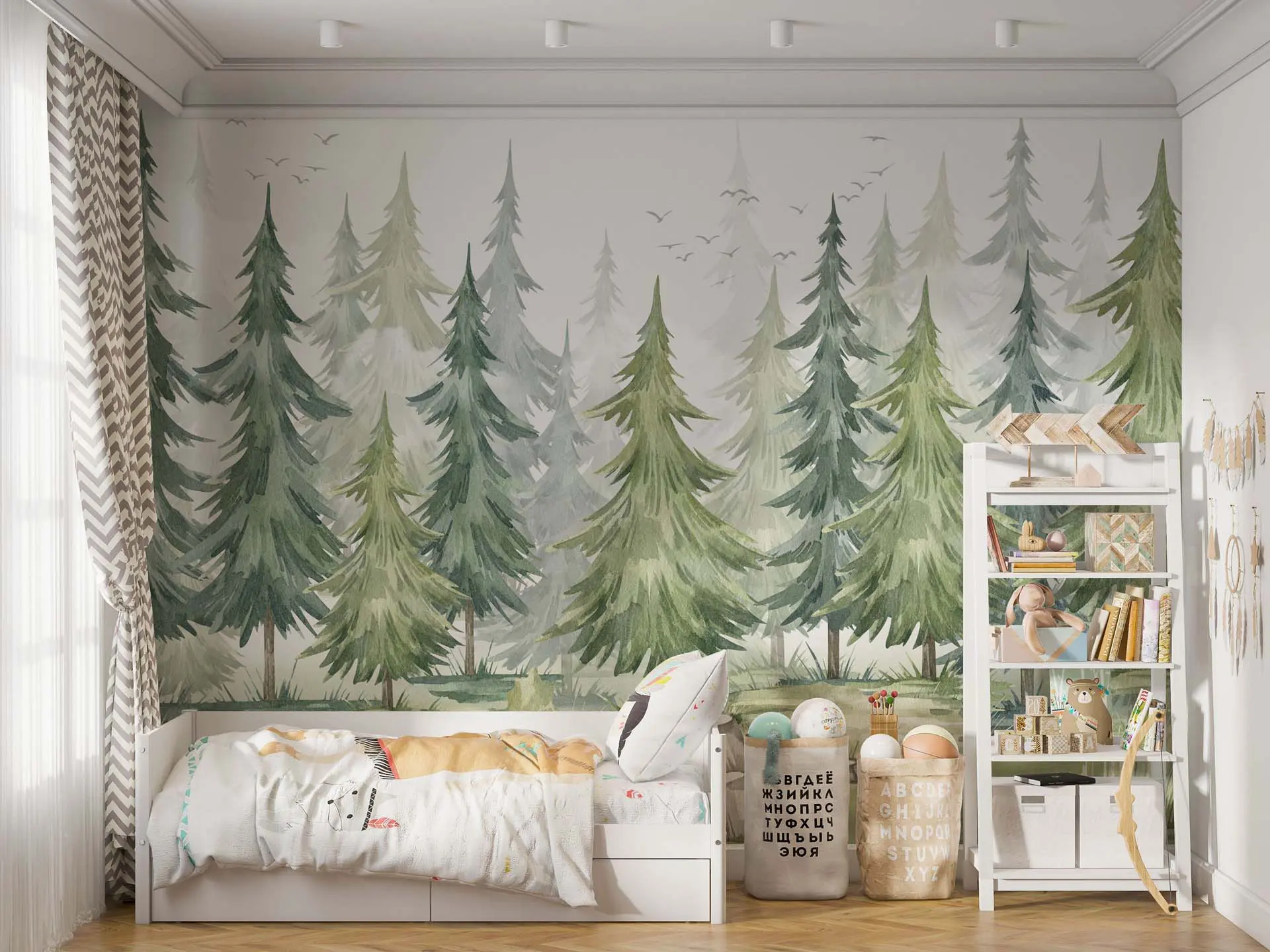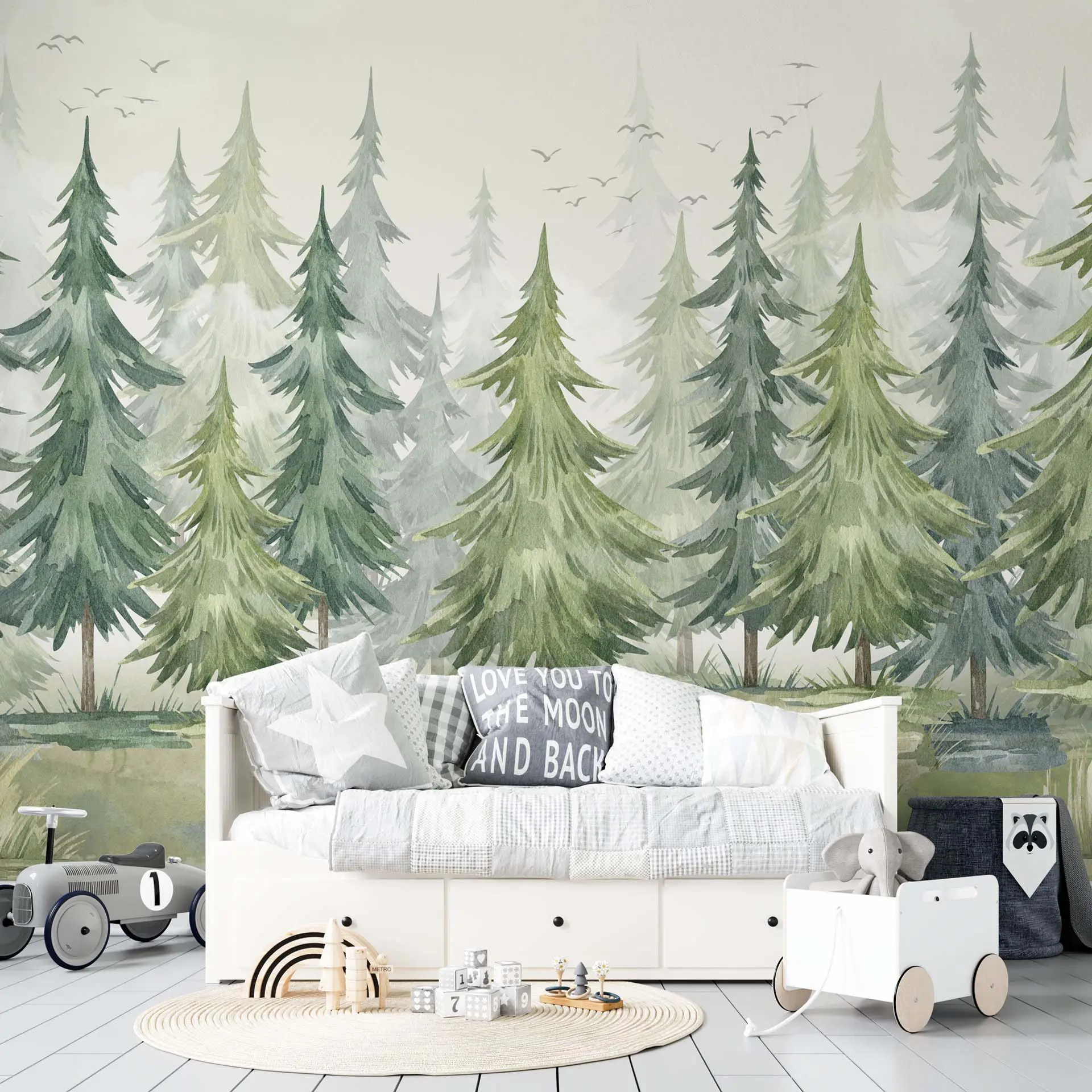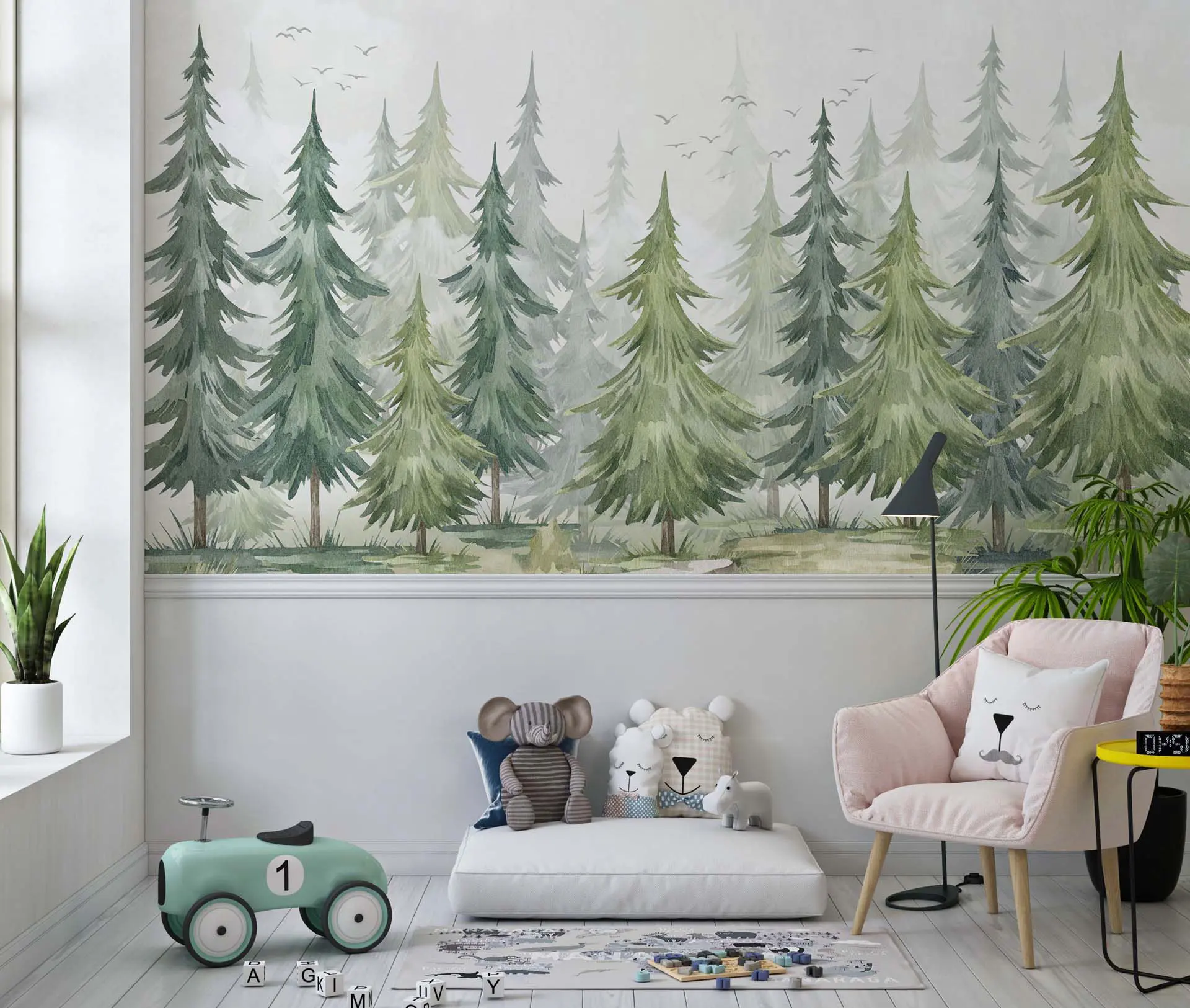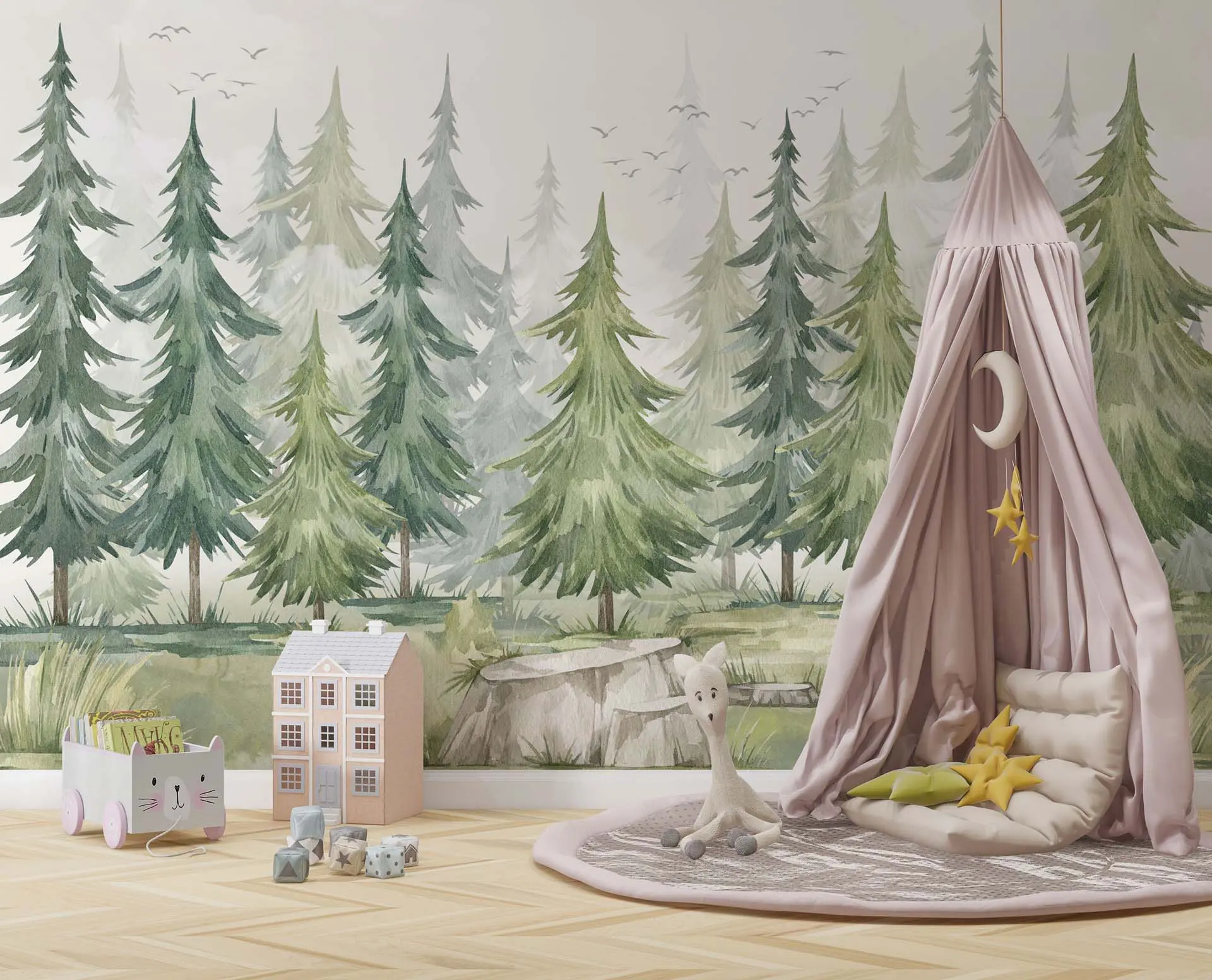 Peaceful Pine Tree Forest Watercolor Wallpaper with White Mist for Nursery
