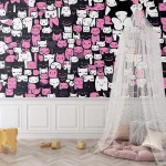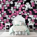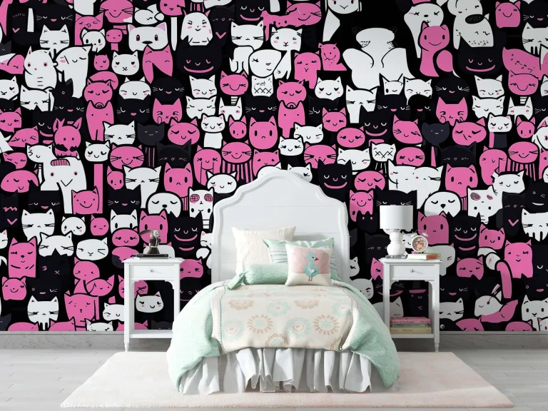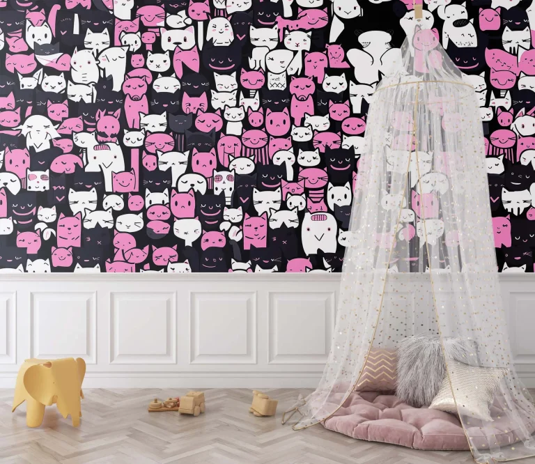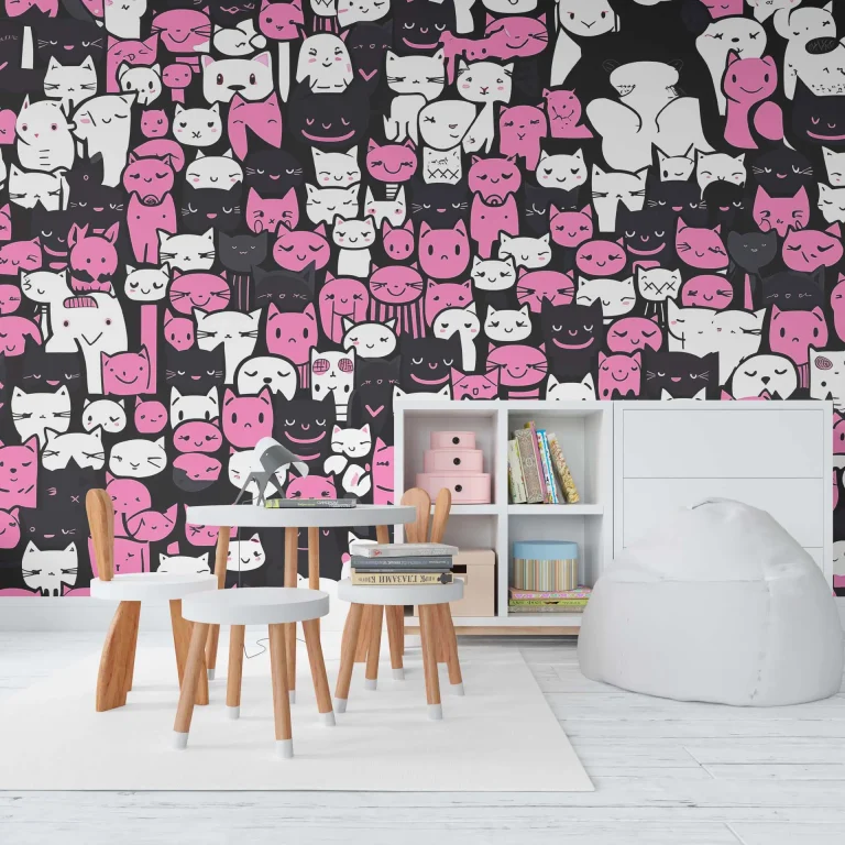 Playful Cat-Themed Cartoon Wallpaper in Pink, White, and Black – Perfect for Kids’ Rooms, Nurseries, and Playrooms