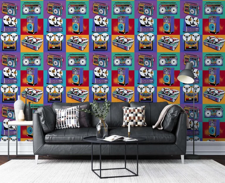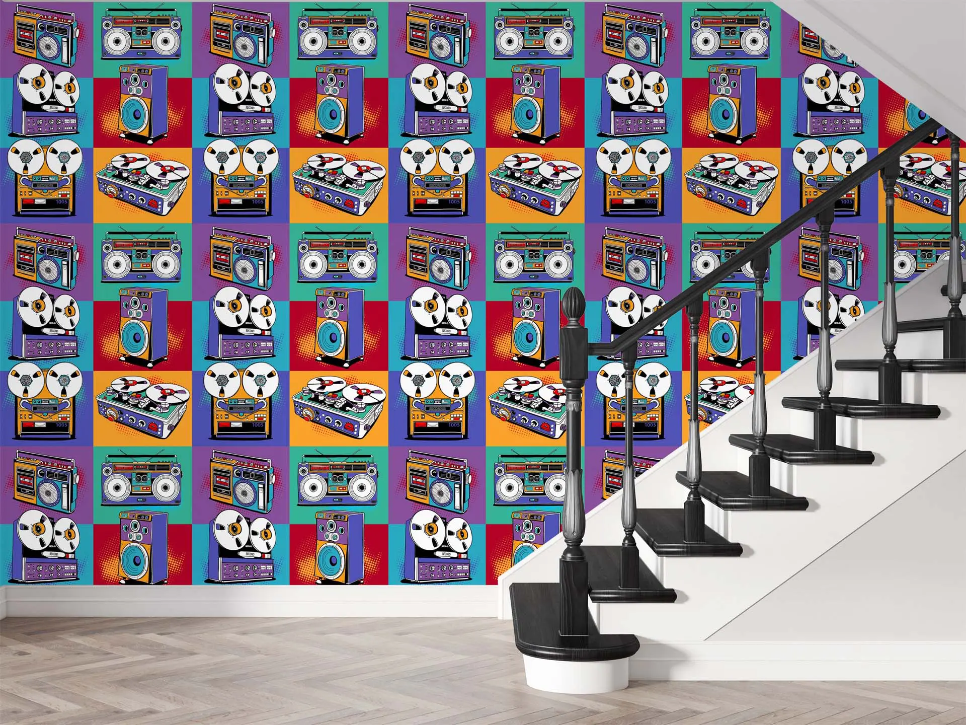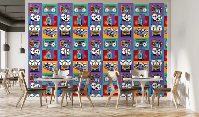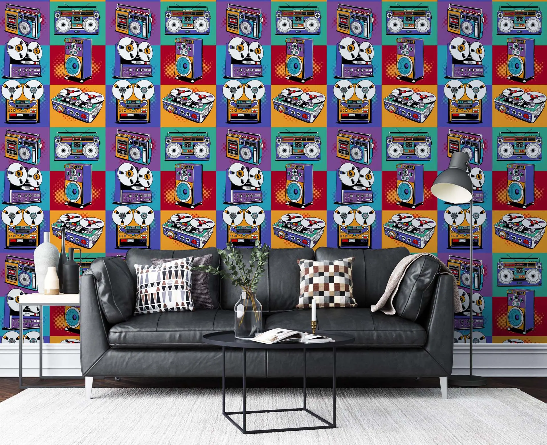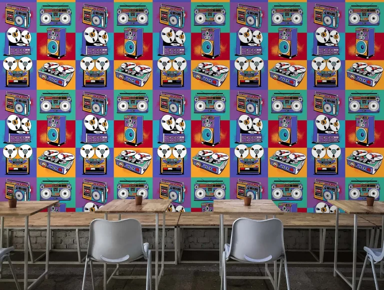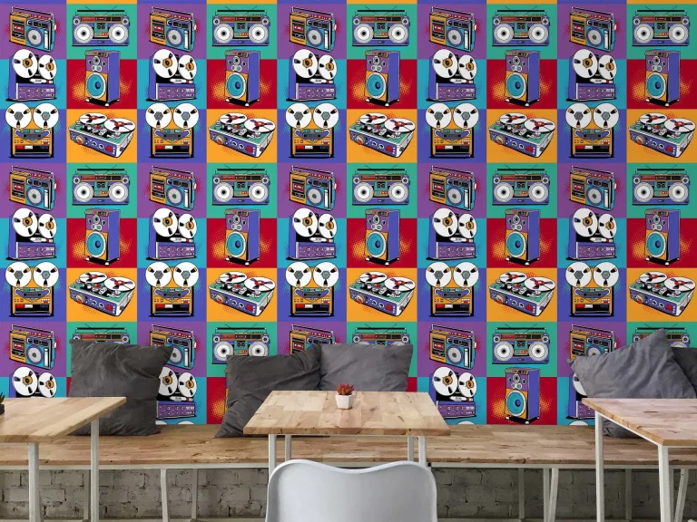 Retro Music Wallpaper – Vintage Audio Equipment & Pop Art Design for Cafe, Bar & Bistro Decor