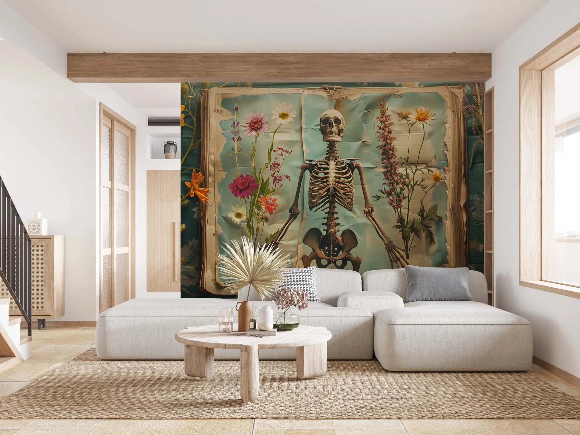 Skeleton and Flowers Art Wallpaper – Unique and Intriguing Wall Design for Creative Spaces or Art Studios