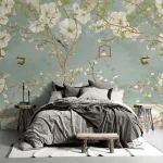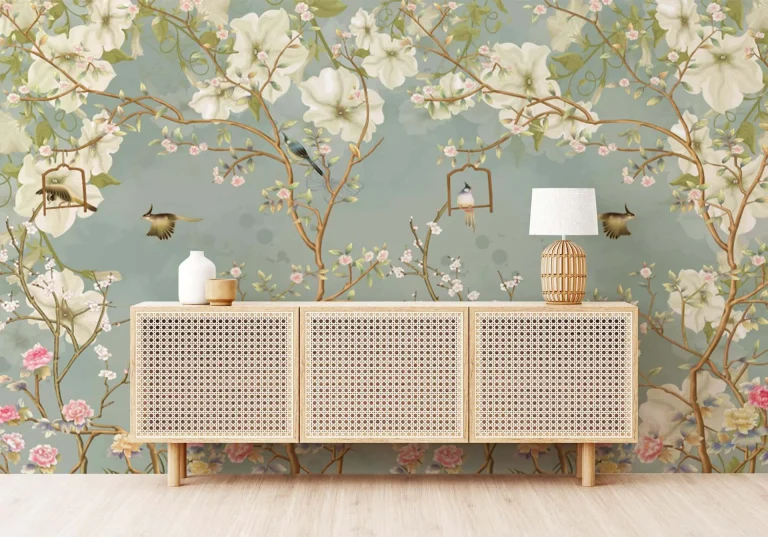 Spring Blossoms & Birds on Blue Background Wallpaper – Nature, Chinoiserie for Peaceful Decor