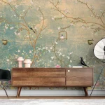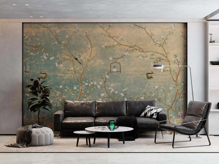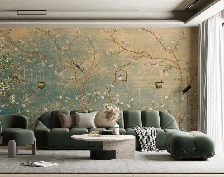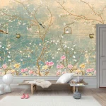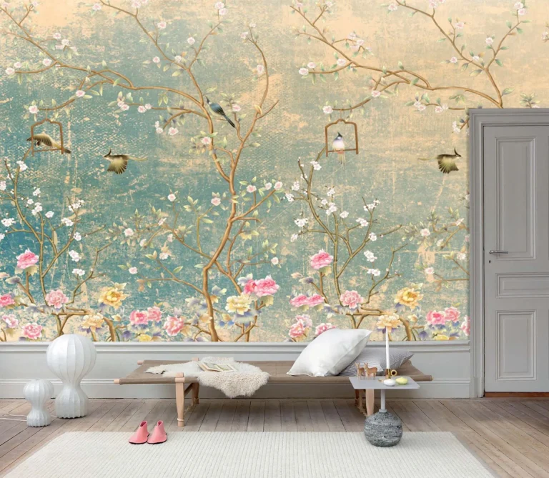 Spring Watercolor Chinoiserie Wallpaper with Birds & Trees – Peaceful Decor