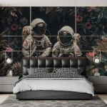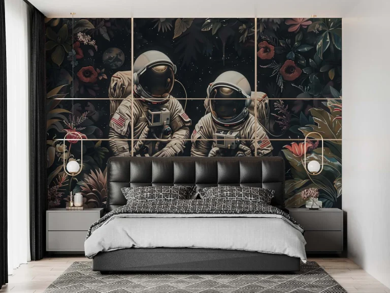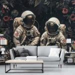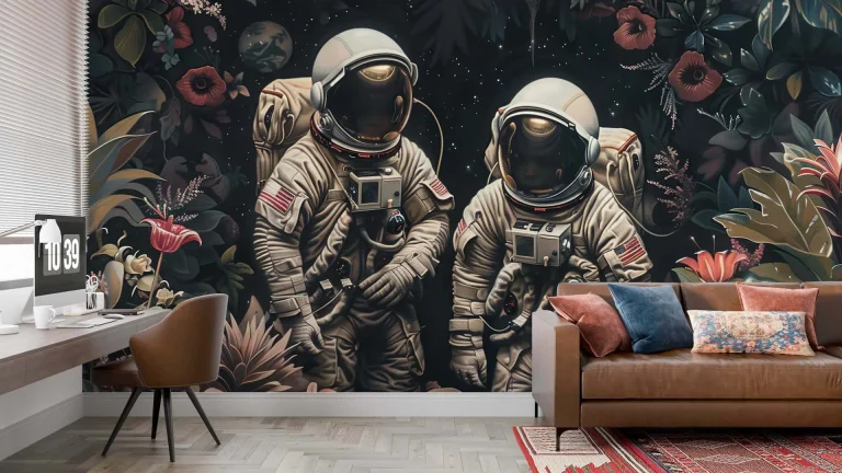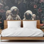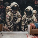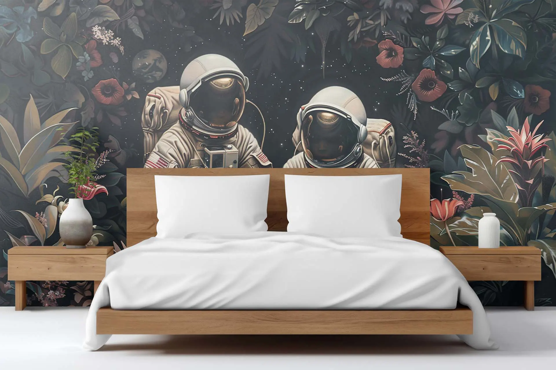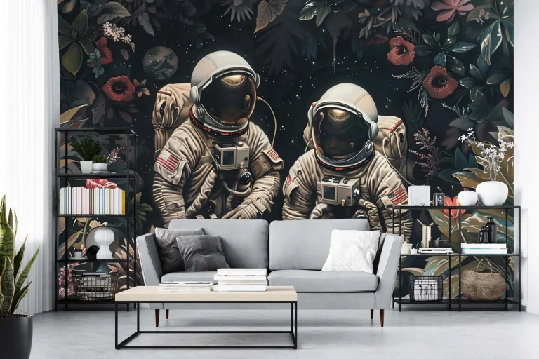 Surreal Astronauts in Botanical Space Wallpaper – Ideal for Creating a Unique and Artistic Ambiance in Any Room