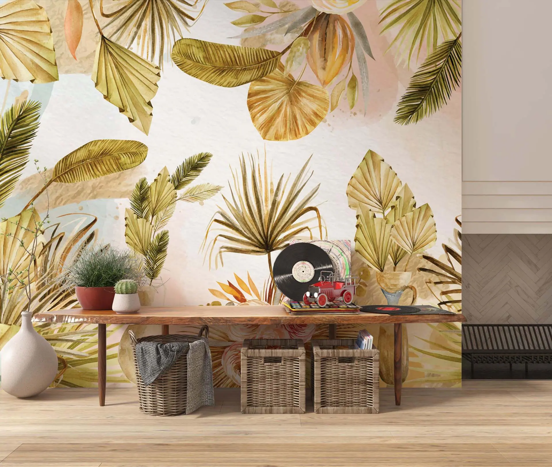 Tropical Bohemian Style Wallpaper with Pastel Yellow Leaves, Vases, Flowers – Exotic Artistic Decor