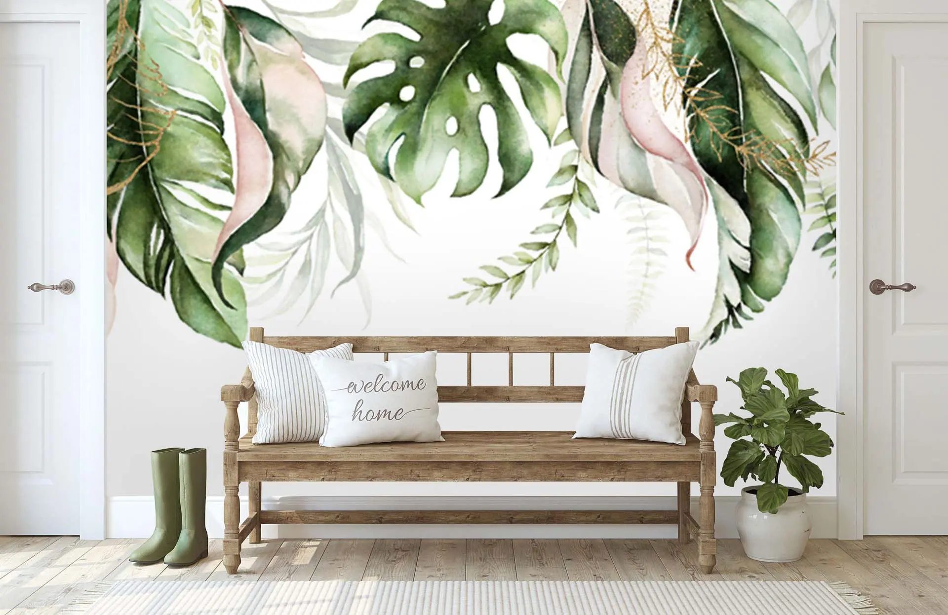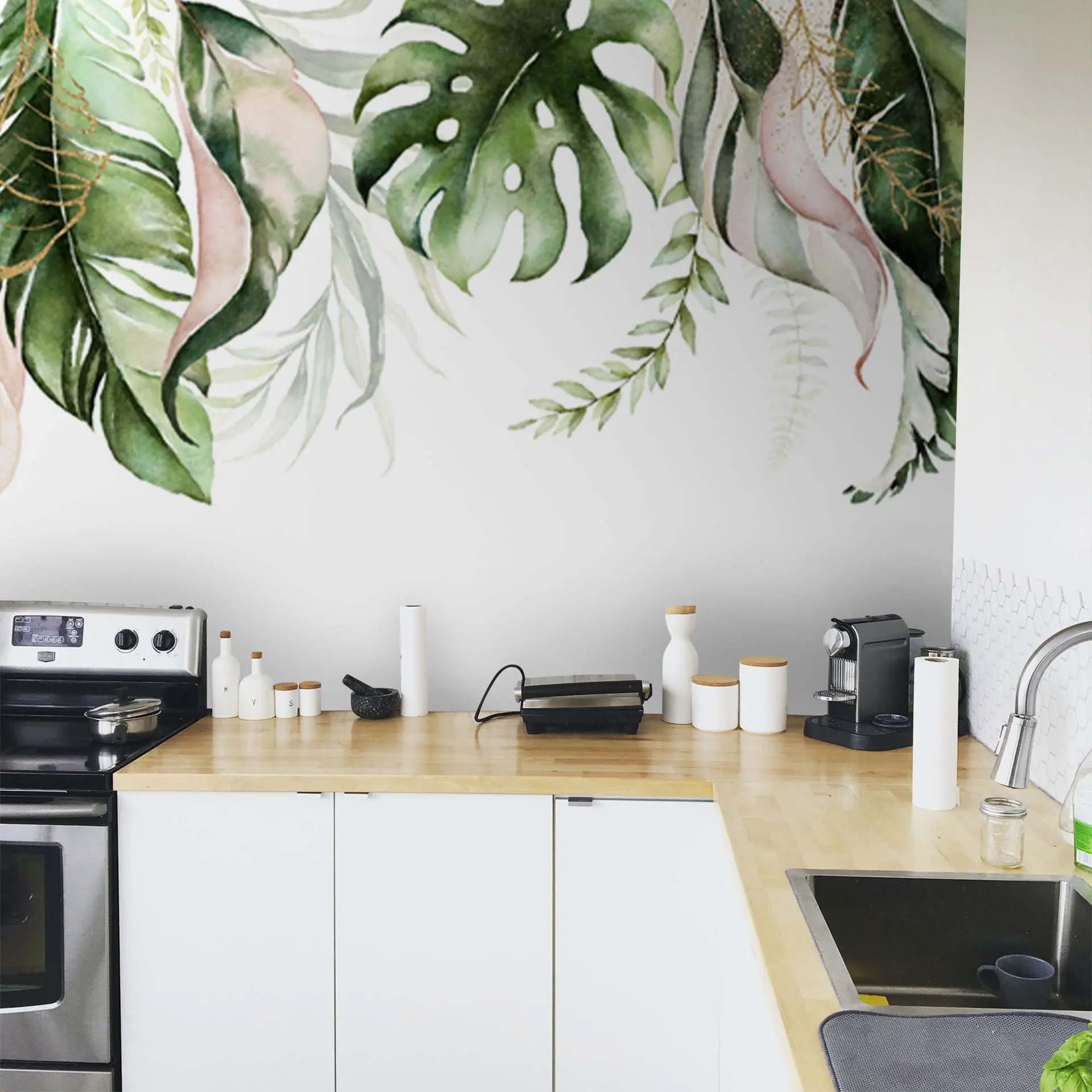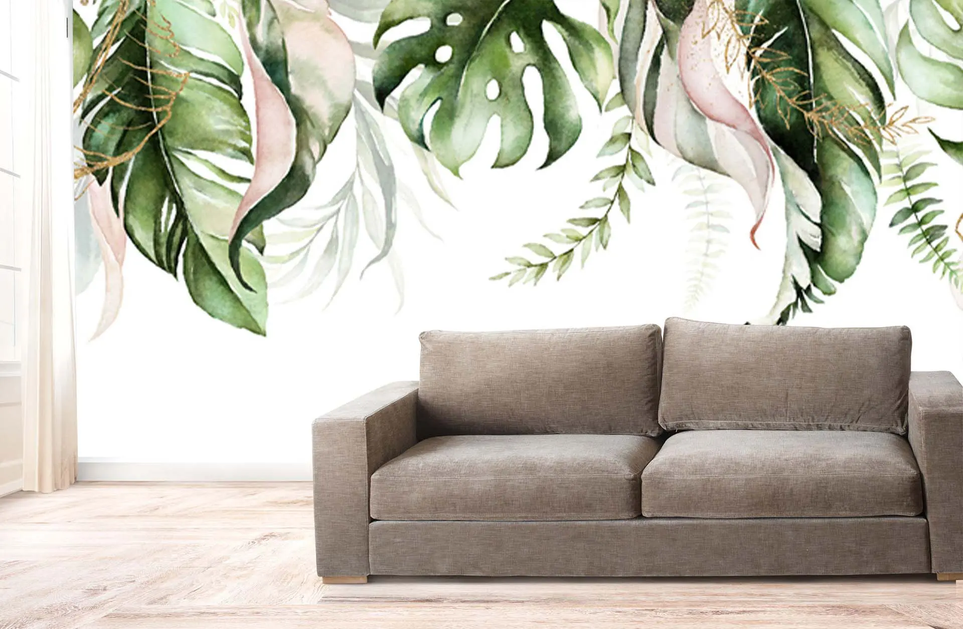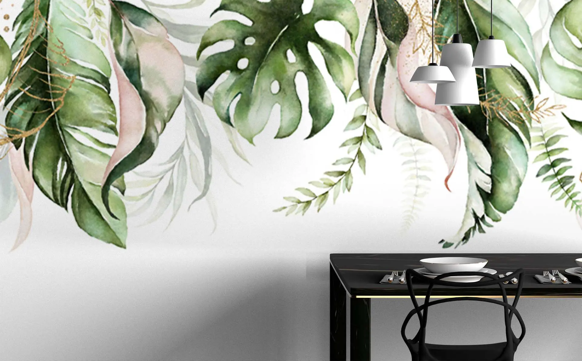 Tropical Leaves Hanging from Ceiling Watercolor Wallpaper on White Background