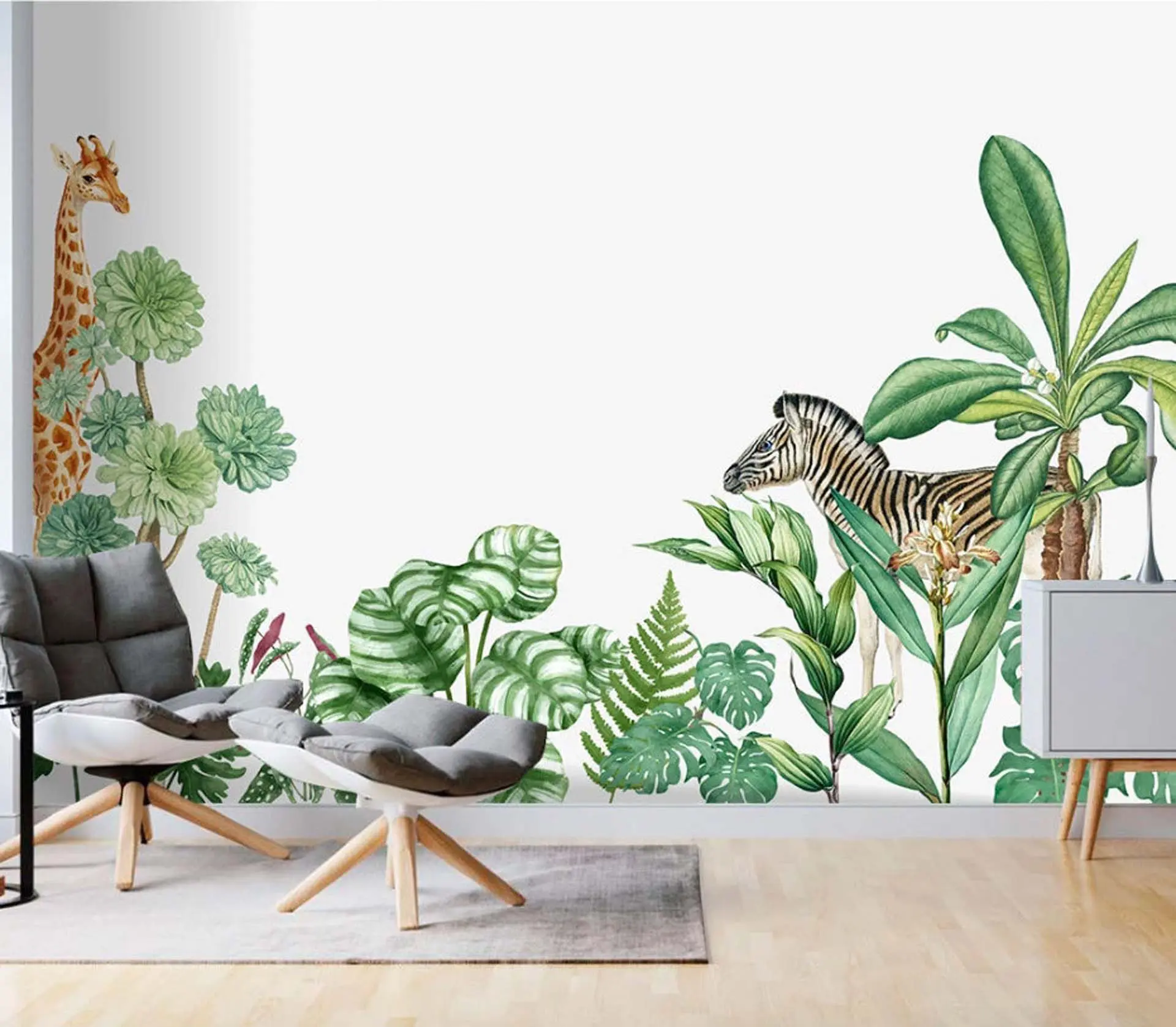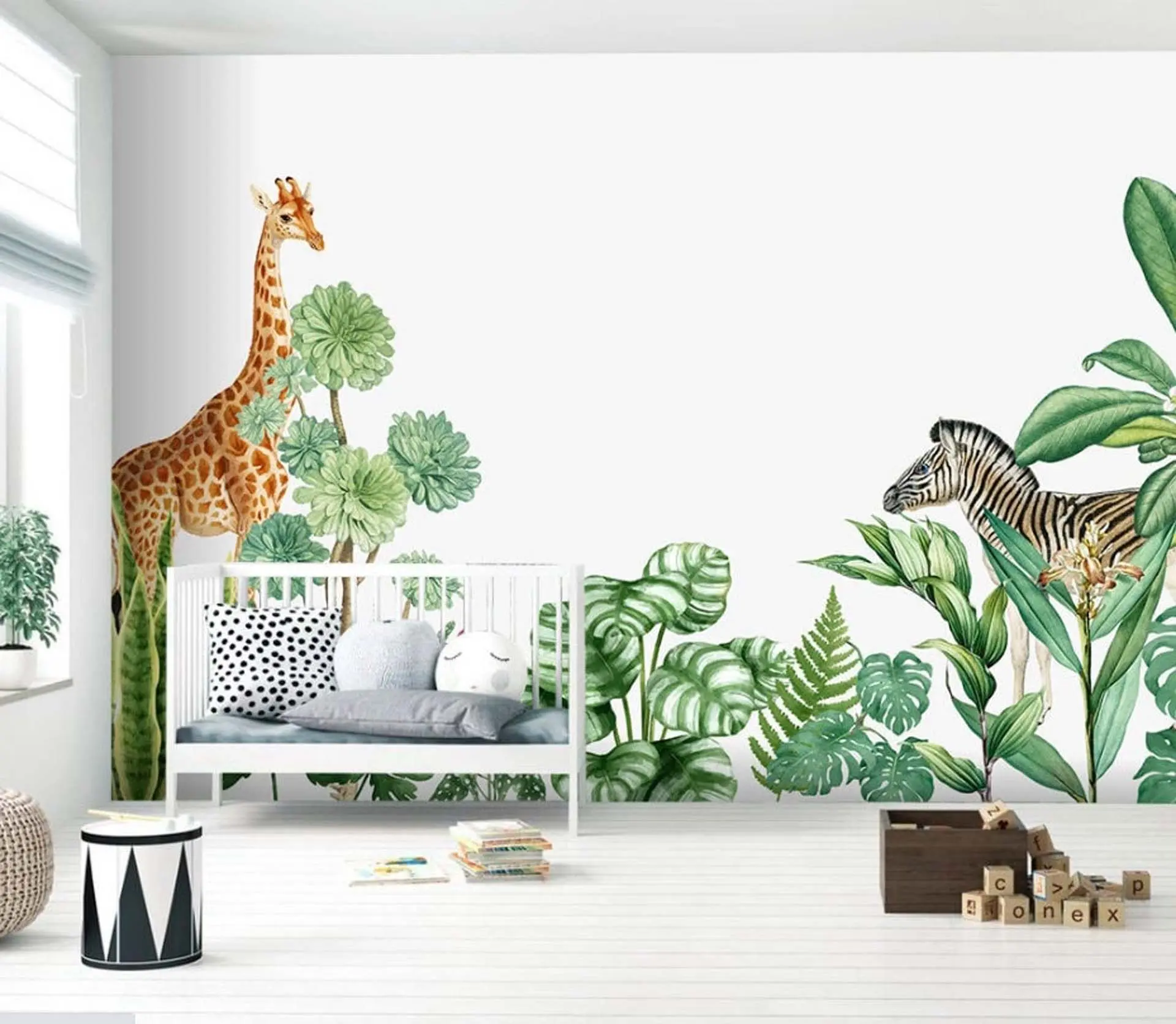 Tropical Plants & Animals Wallpaper in Pastel Tones – Toucan, Giraffe, Zebra for Nursery